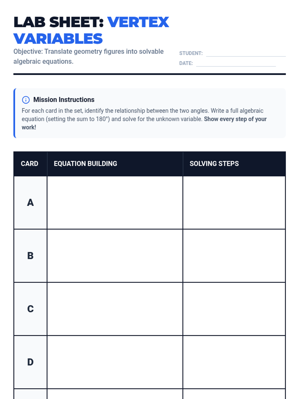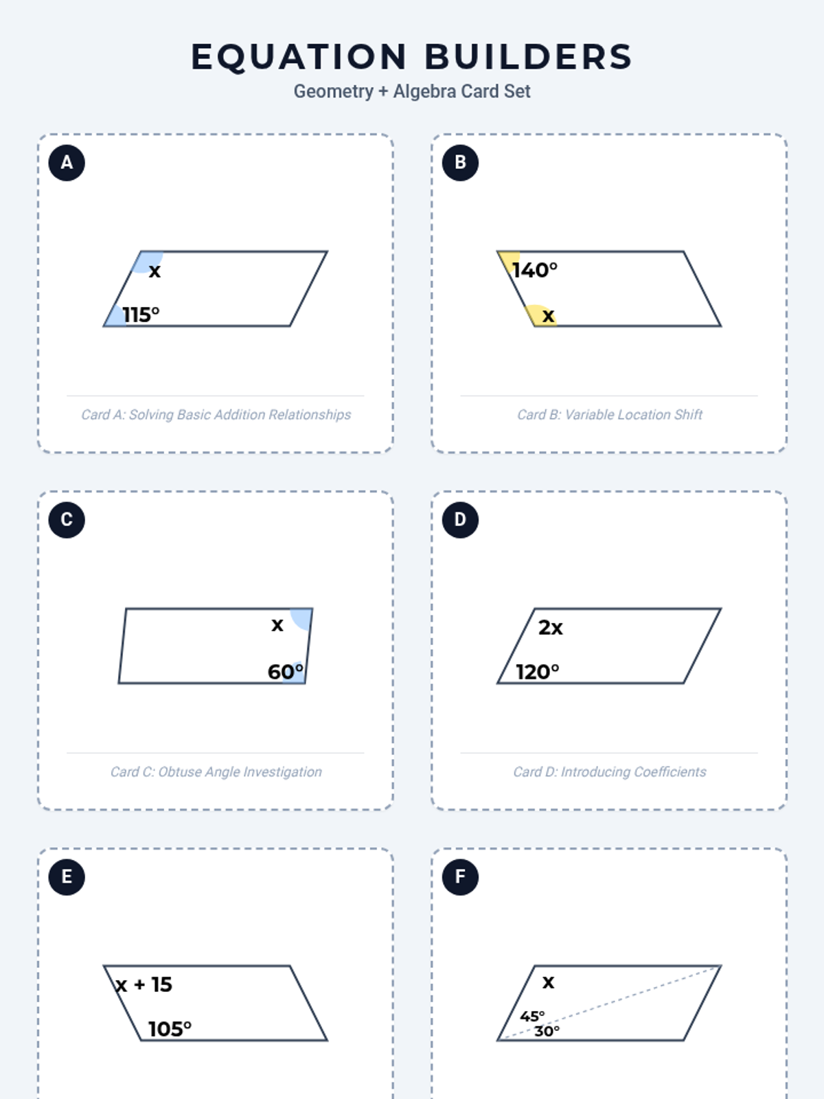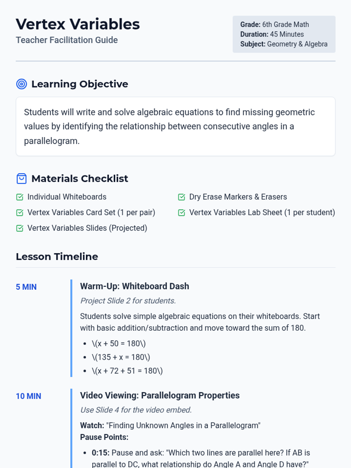 Students investigate the relationship between consecutive angles in a parallelogram, using these geometric properties to write and solve algebraic equations for unknown variables.