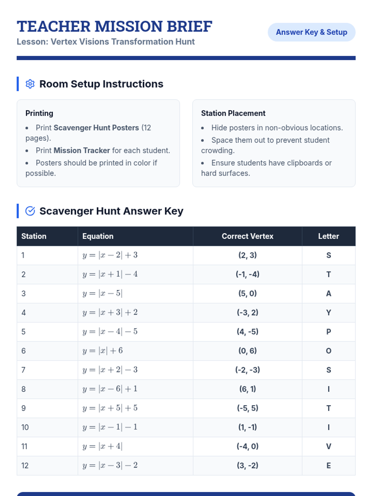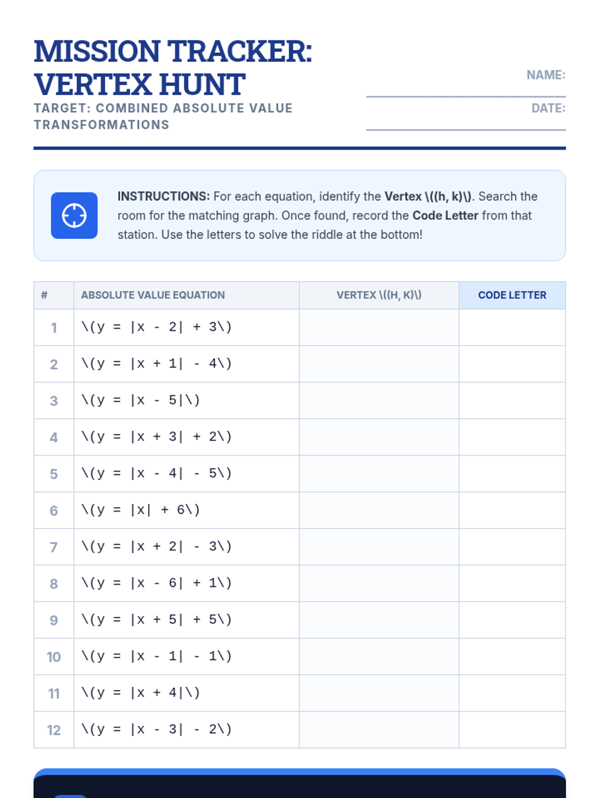 A high-energy lesson on absolute value transformations where students decode a riddle by matching equations to physical graphs hidden around the room. Includes slides with embedded video and a complete scavenger hunt kit.