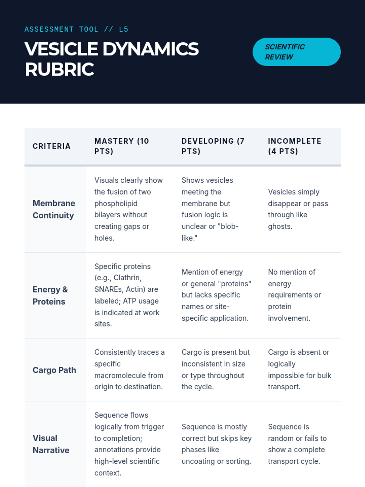 Students synthesize their learning by critiquing biological depictions in media and creating their own dynamic storyboard or animation of vesicle cycles.