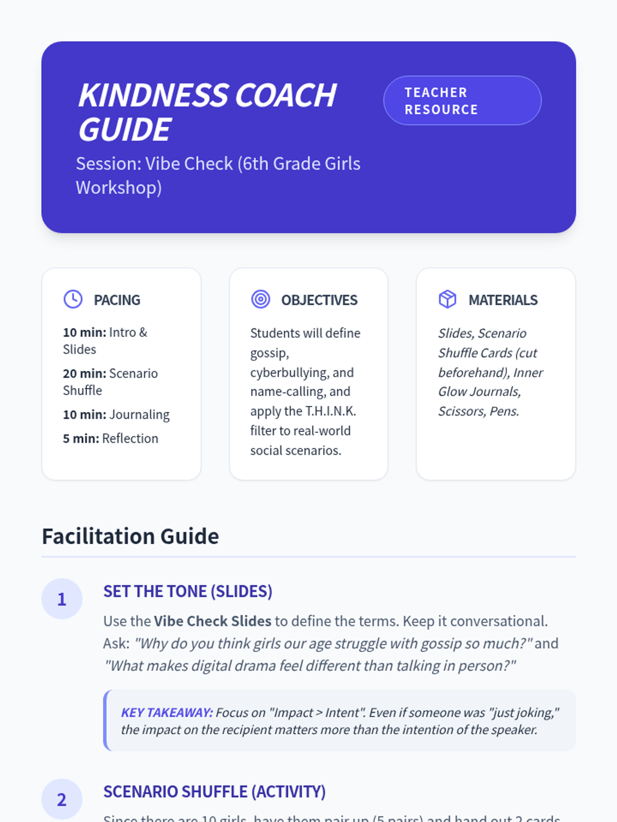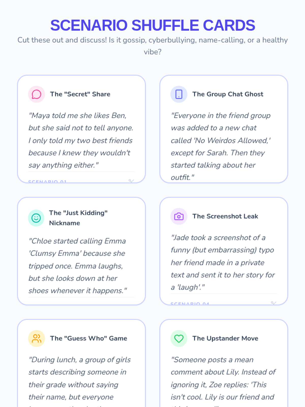 A workshop-style lesson for 6th-grade girls to navigate social dynamics, focusing on identifying and resolving gossip, name-calling, and cyberbullying through empathy and practical communication tools.