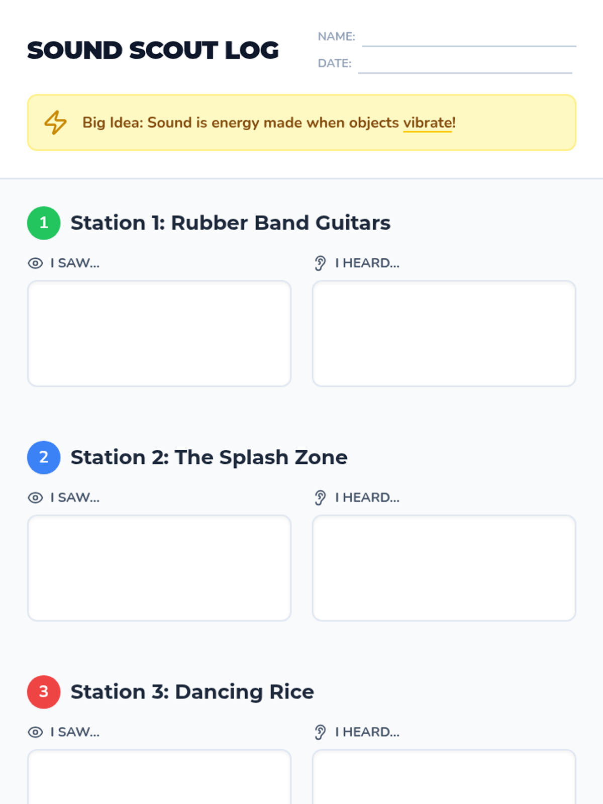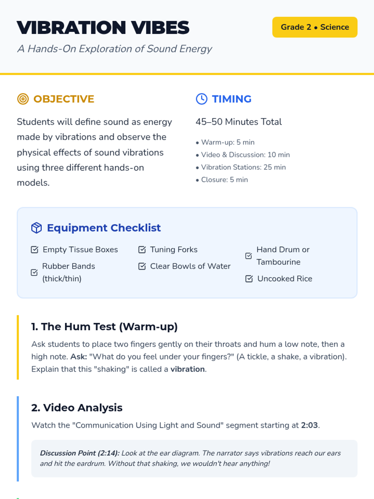 Students explore the physical relationship between vibration and sound through hands-on stations and a video analysis. They will observe how vibrations cause sound and how sound energy can move matter.