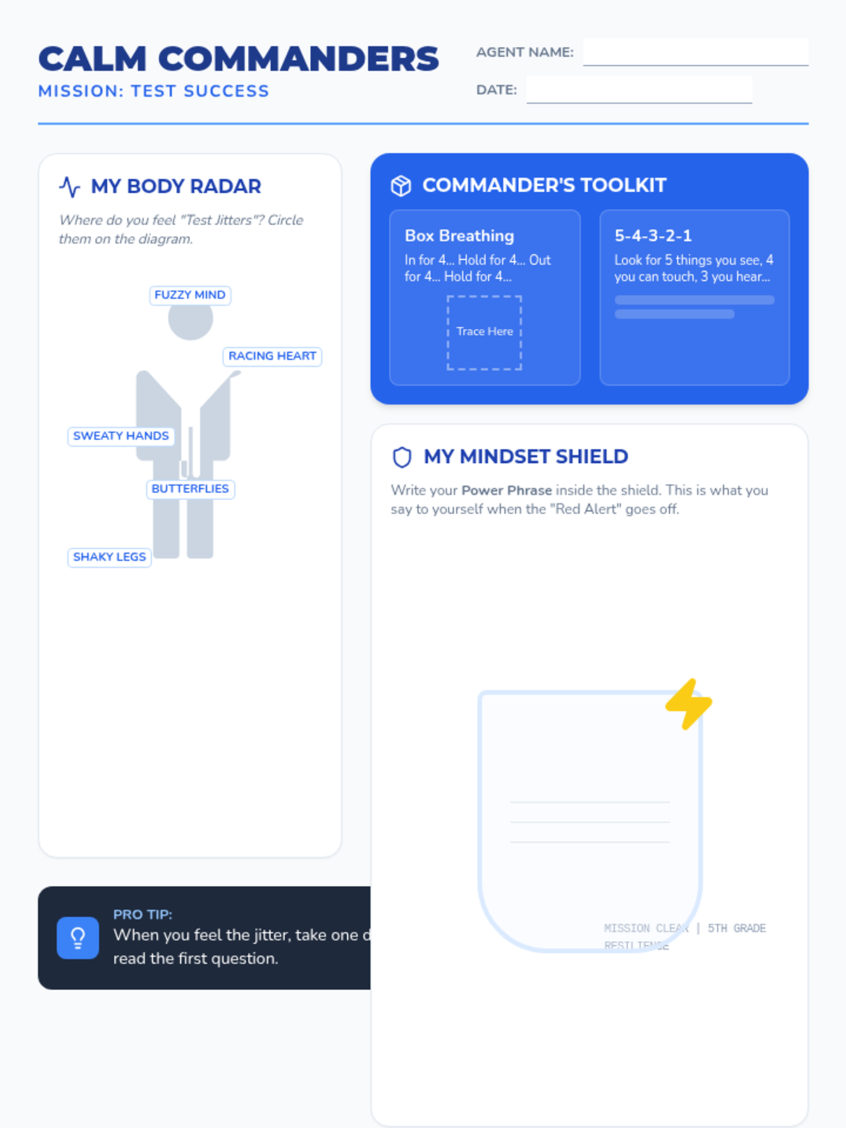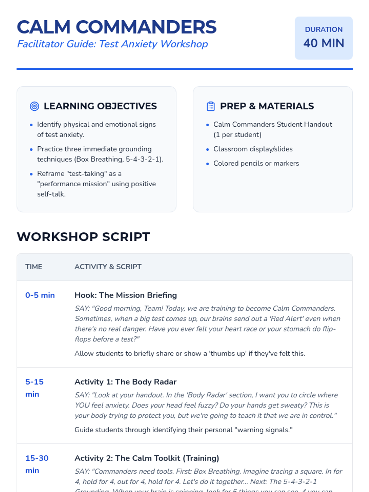 A workshop focused on identifying test anxiety, understanding the physical response to stress, and practicing immediate calming strategies. Students create a 'Calm Command Center' to use during high-pressure academic moments.