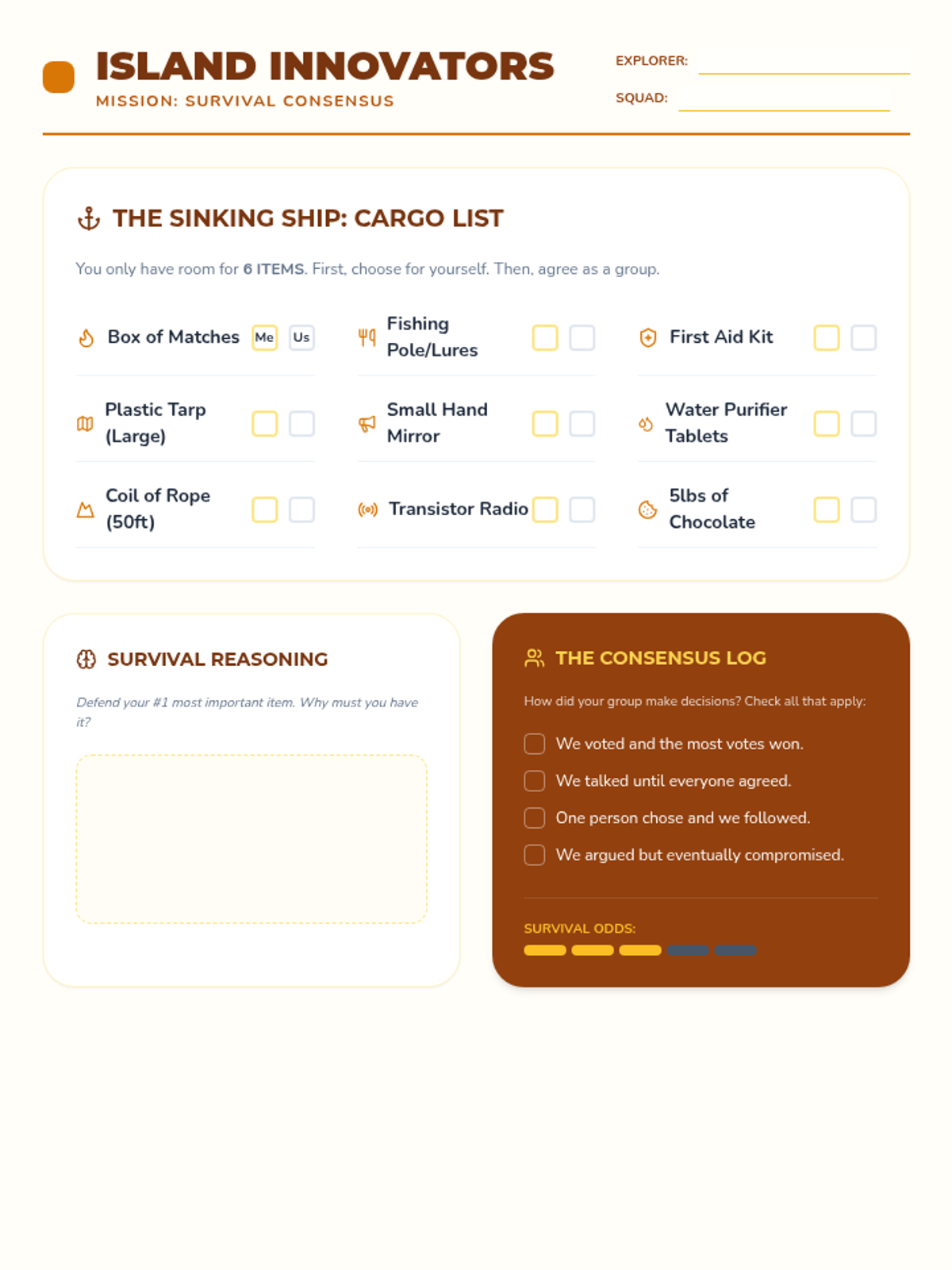 A critical thinking and consensus-building simulation where students must decide which items to save after a shipwreck. The workshop emphasizes prioritizing needs over wants and respectful group negotiation.