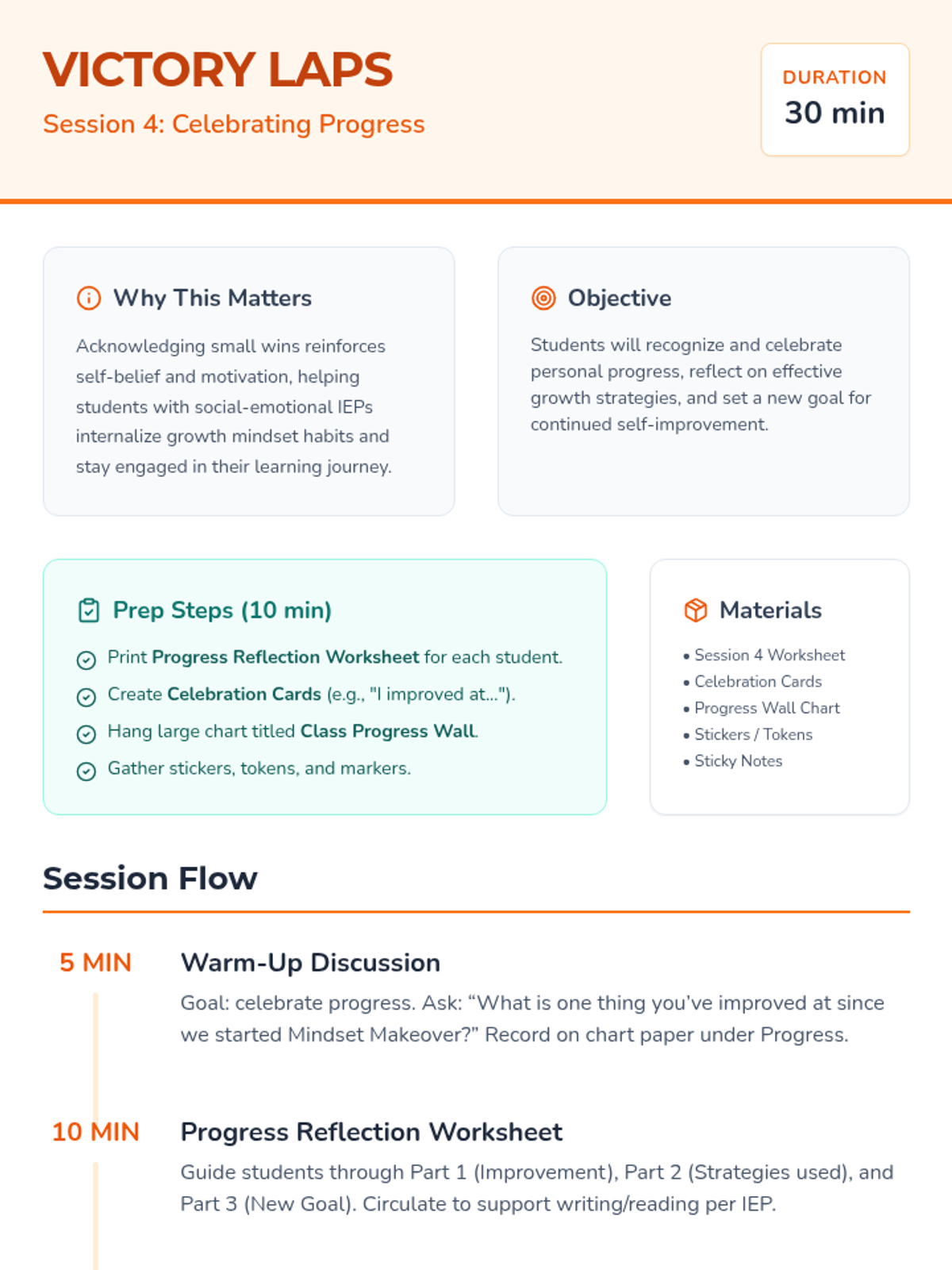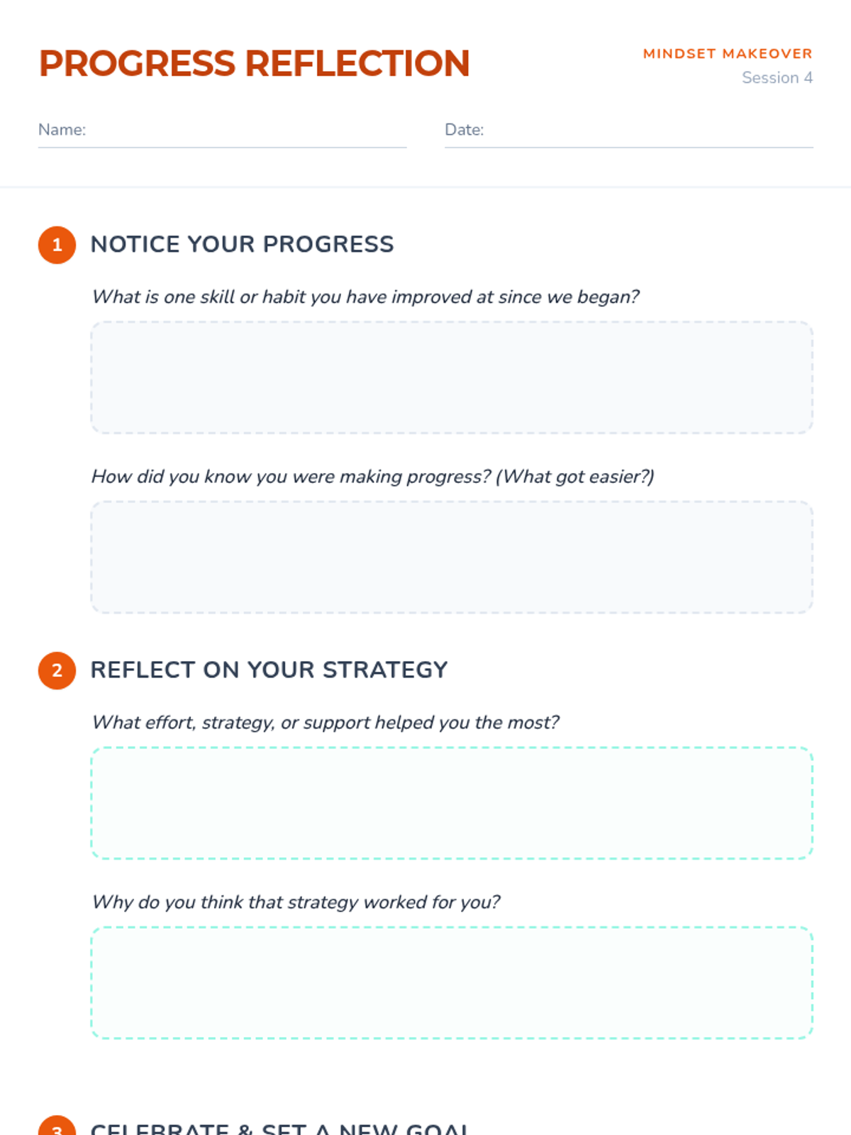Students recognize and celebrate personal progress, reflecting on effective strategies and setting new goals.