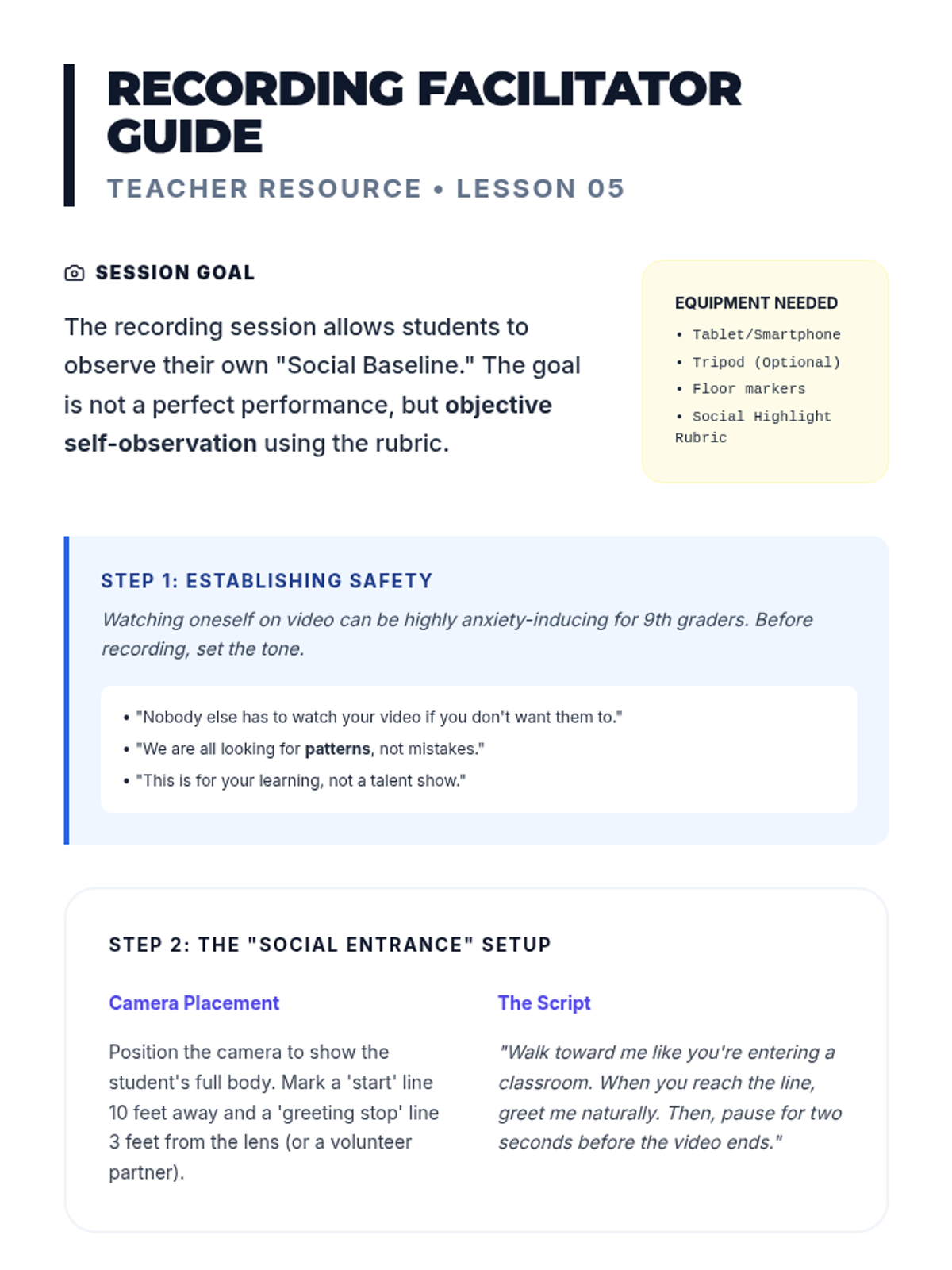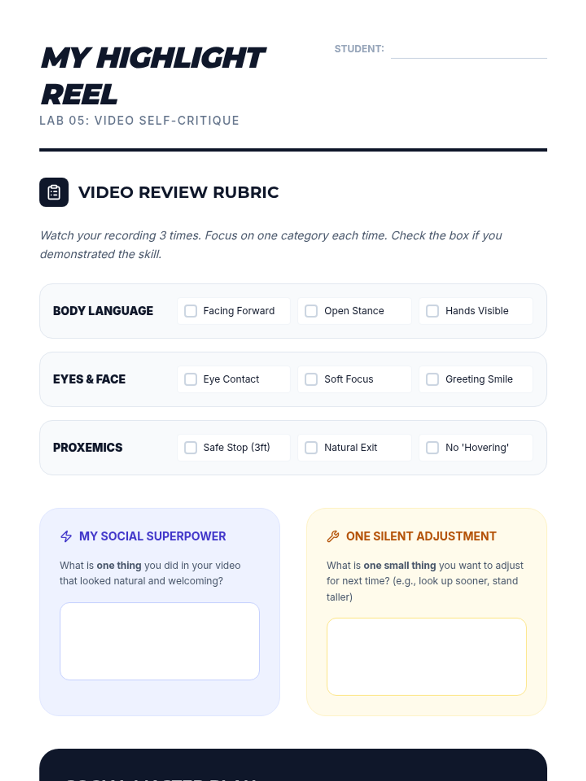 Students record and critique their own greeting performances using a structured rubric to align their physical presence with their social intent.