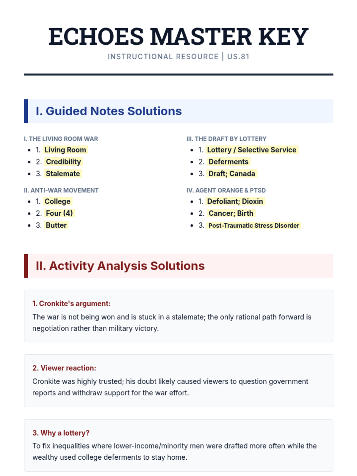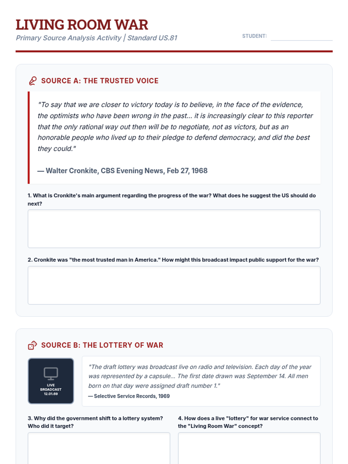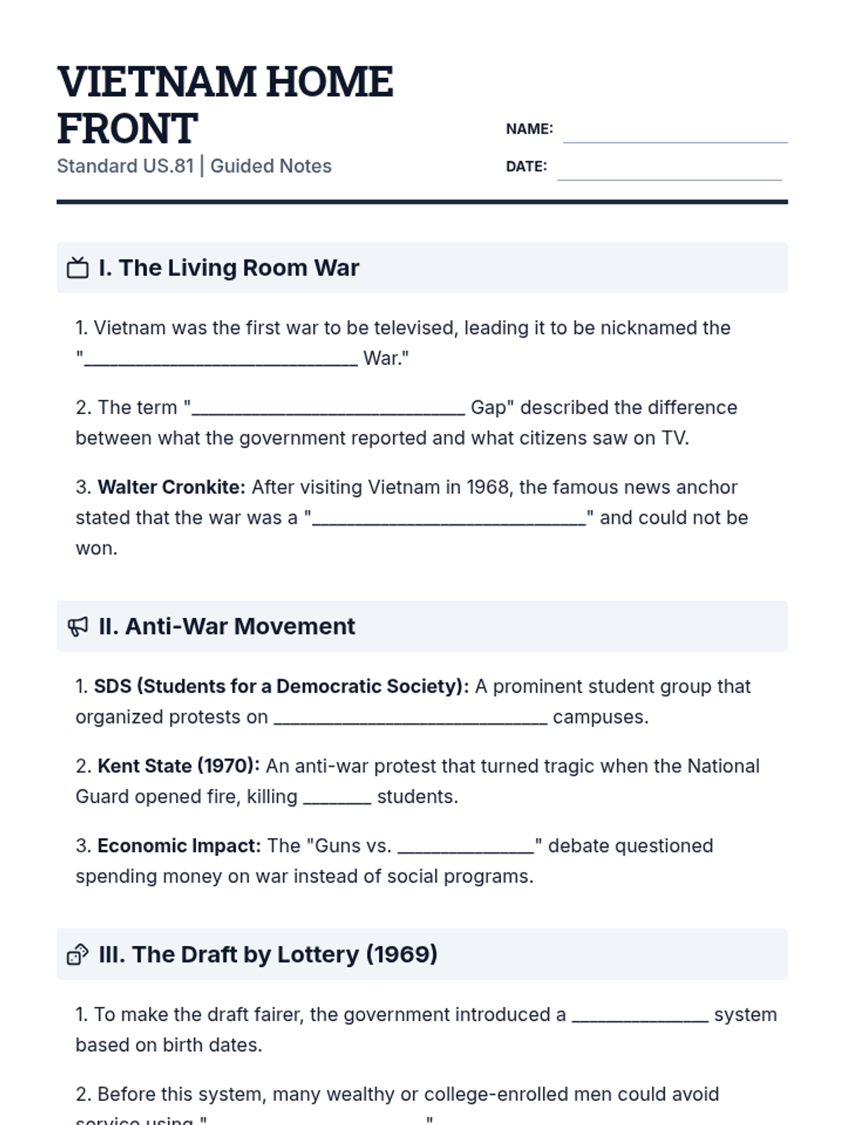 A comprehensive 35-minute high school lesson exploring the impact of the Vietnam War on the American home front, focusing on media, protest, the draft, and the long-term health effects on veterans.