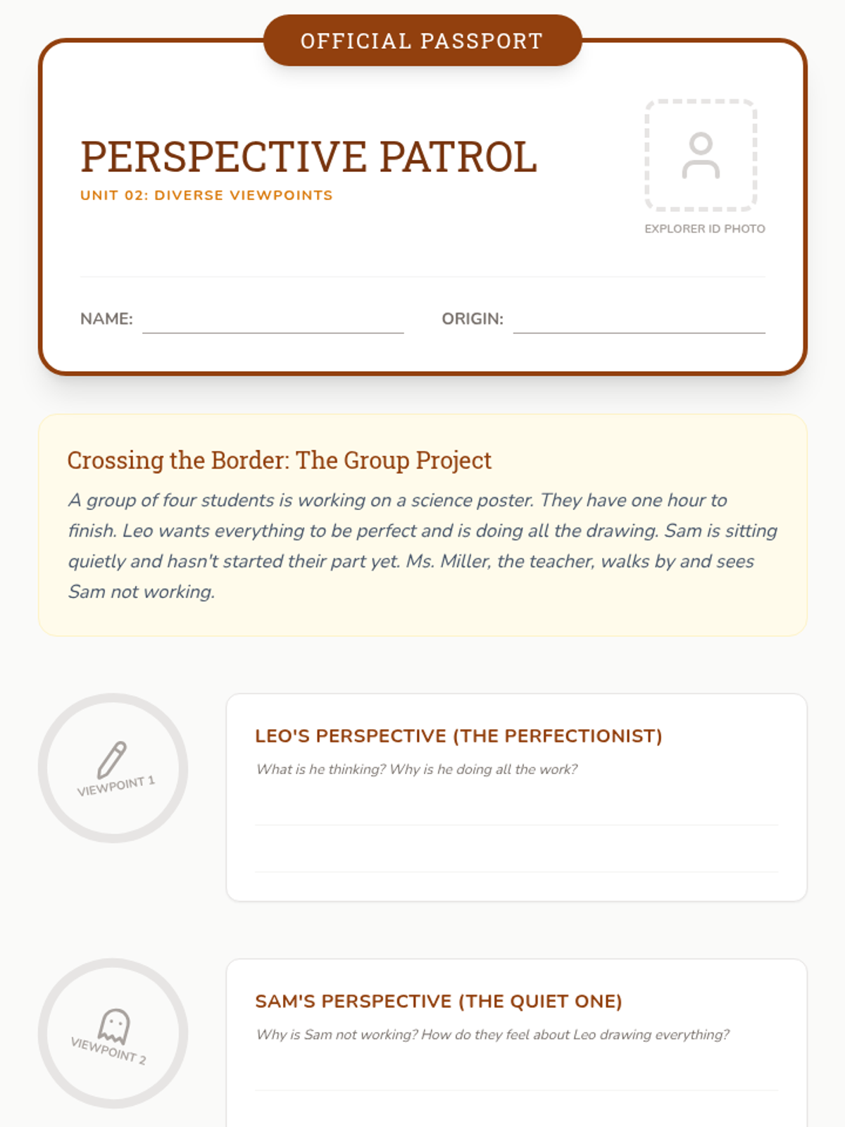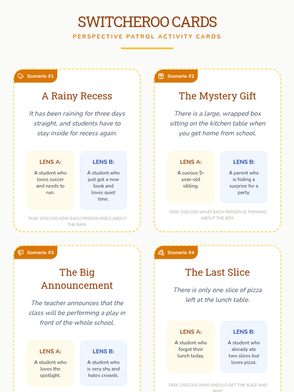 Focuses on perspective-taking by exploring how different people can experience the same situation in diverse ways.