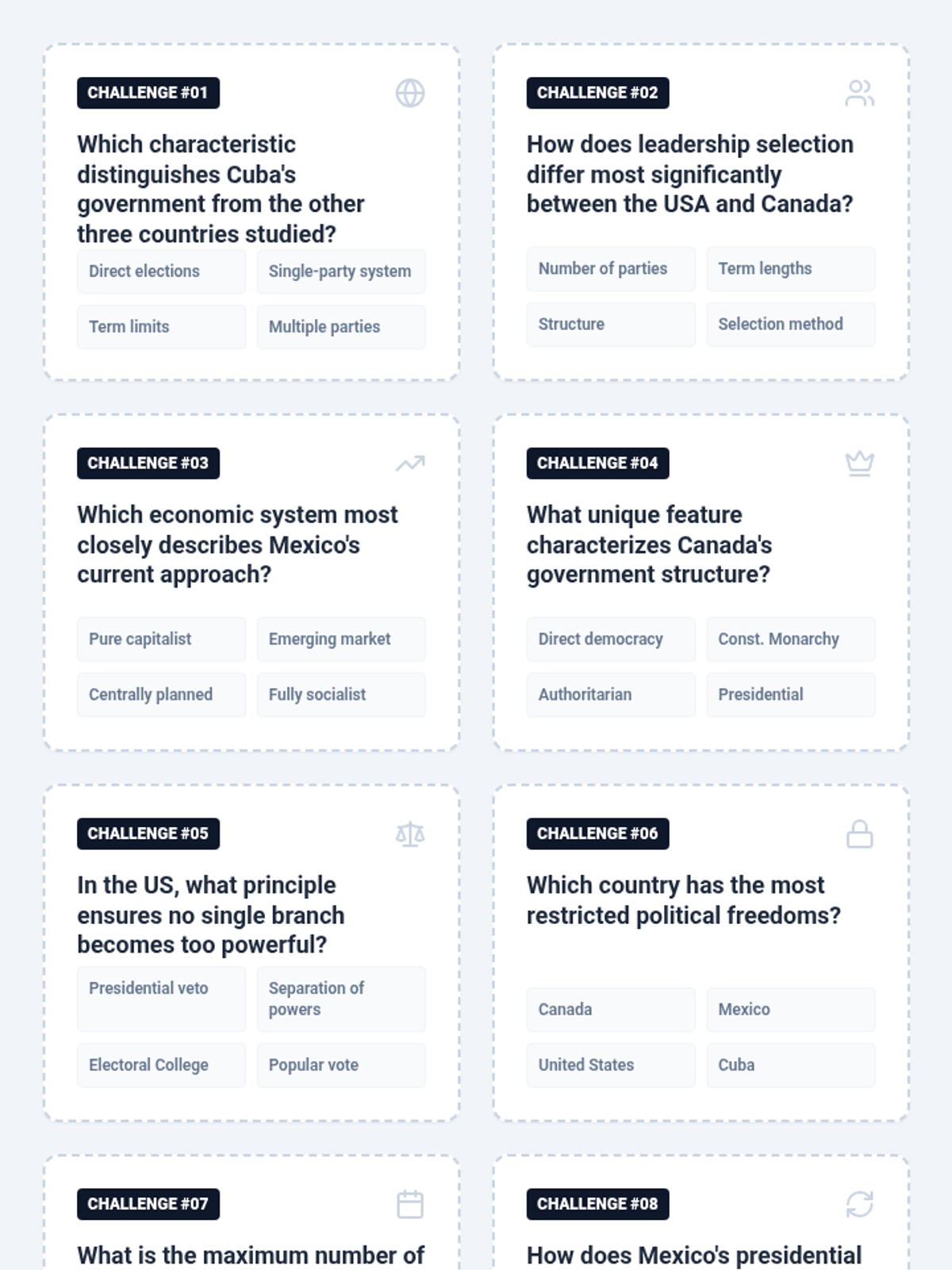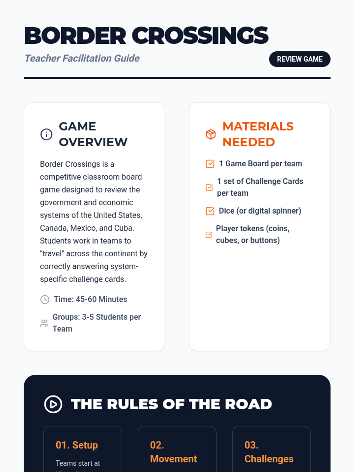 A high-energy review lesson comparing the government and economic systems of the United States, Canada, Mexico, and Cuba through a competitive board game.