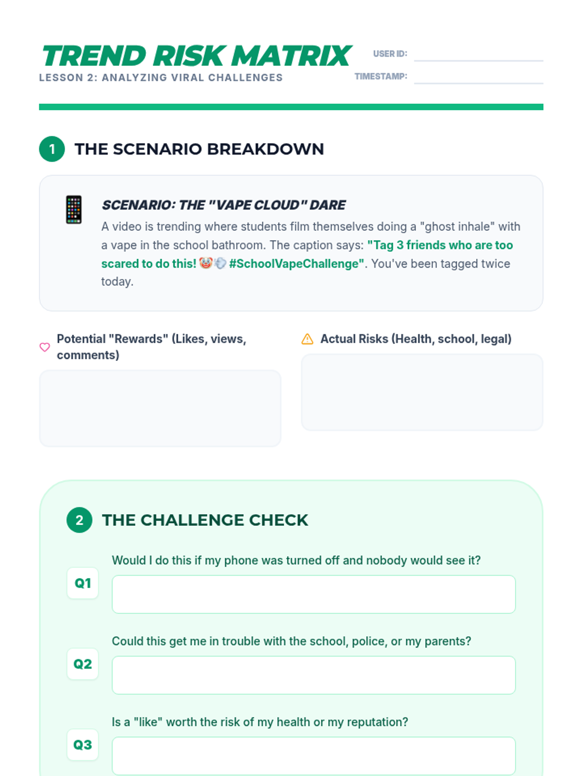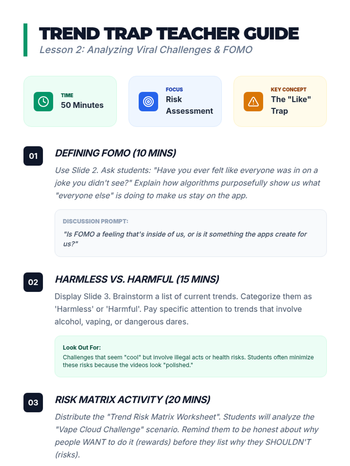 Students analyze the risks of viral challenges and the psychological pull of FOMO, learning to evaluate trends before participating.