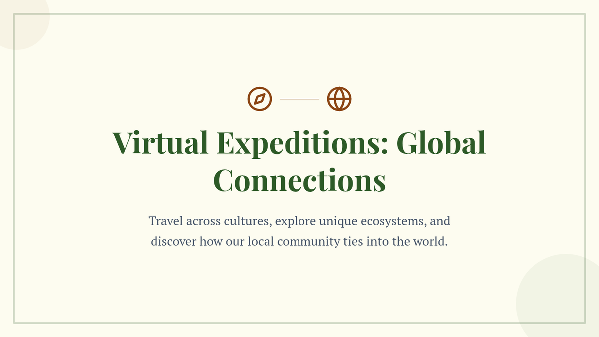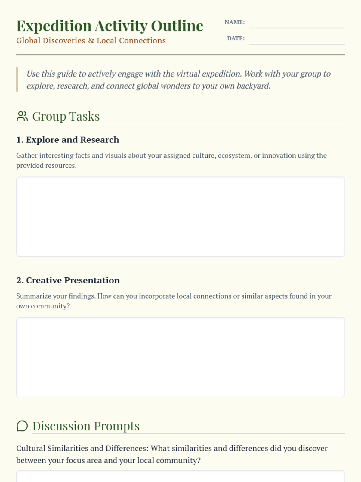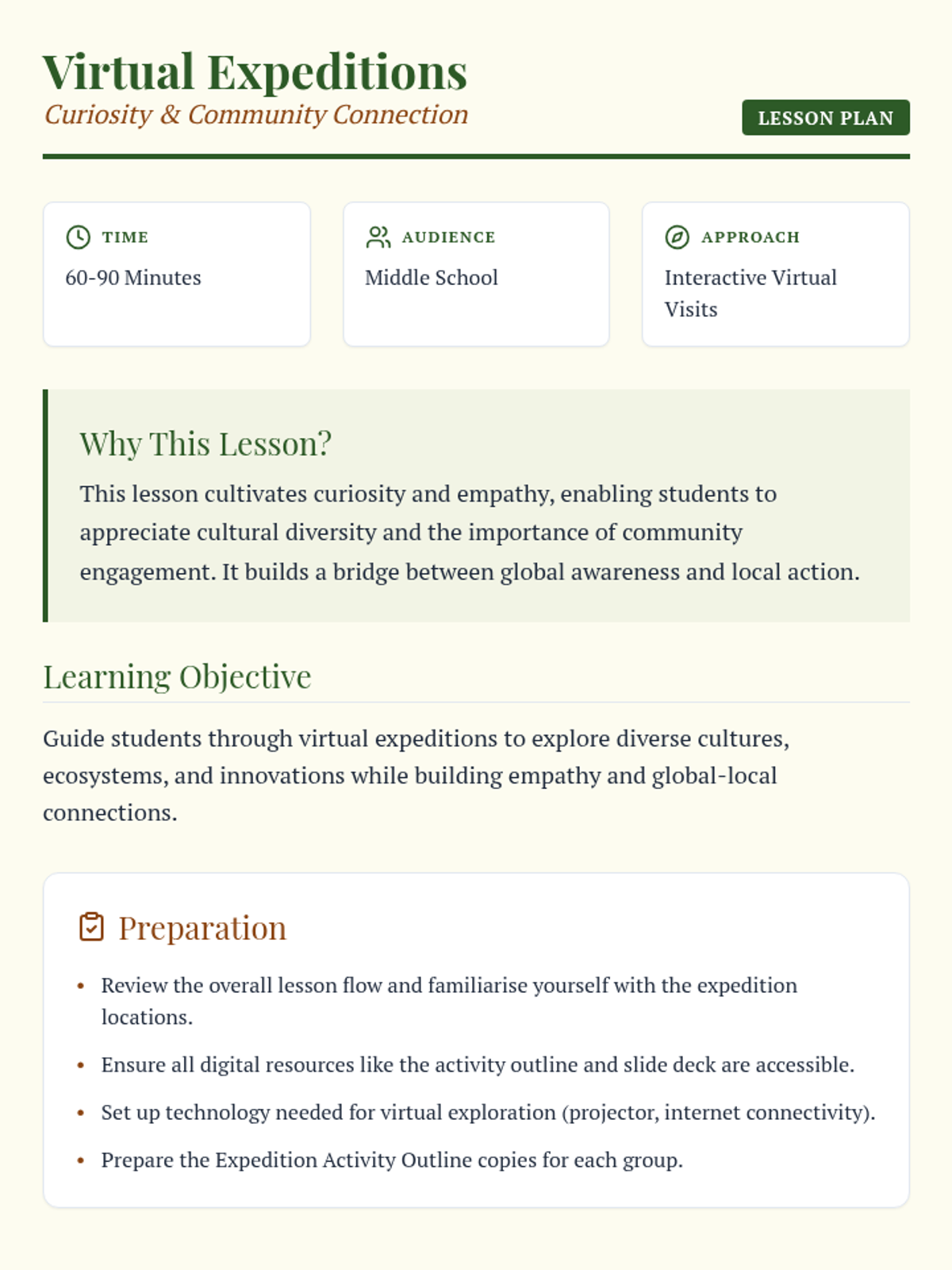 This lesson takes students on virtual expeditions to explore diverse cultures, ecosystems, and innovations, sparking curiosity and empathy. By engaging in virtual visits and interactive discussions, students connect globally while reflecting on local community involvement.