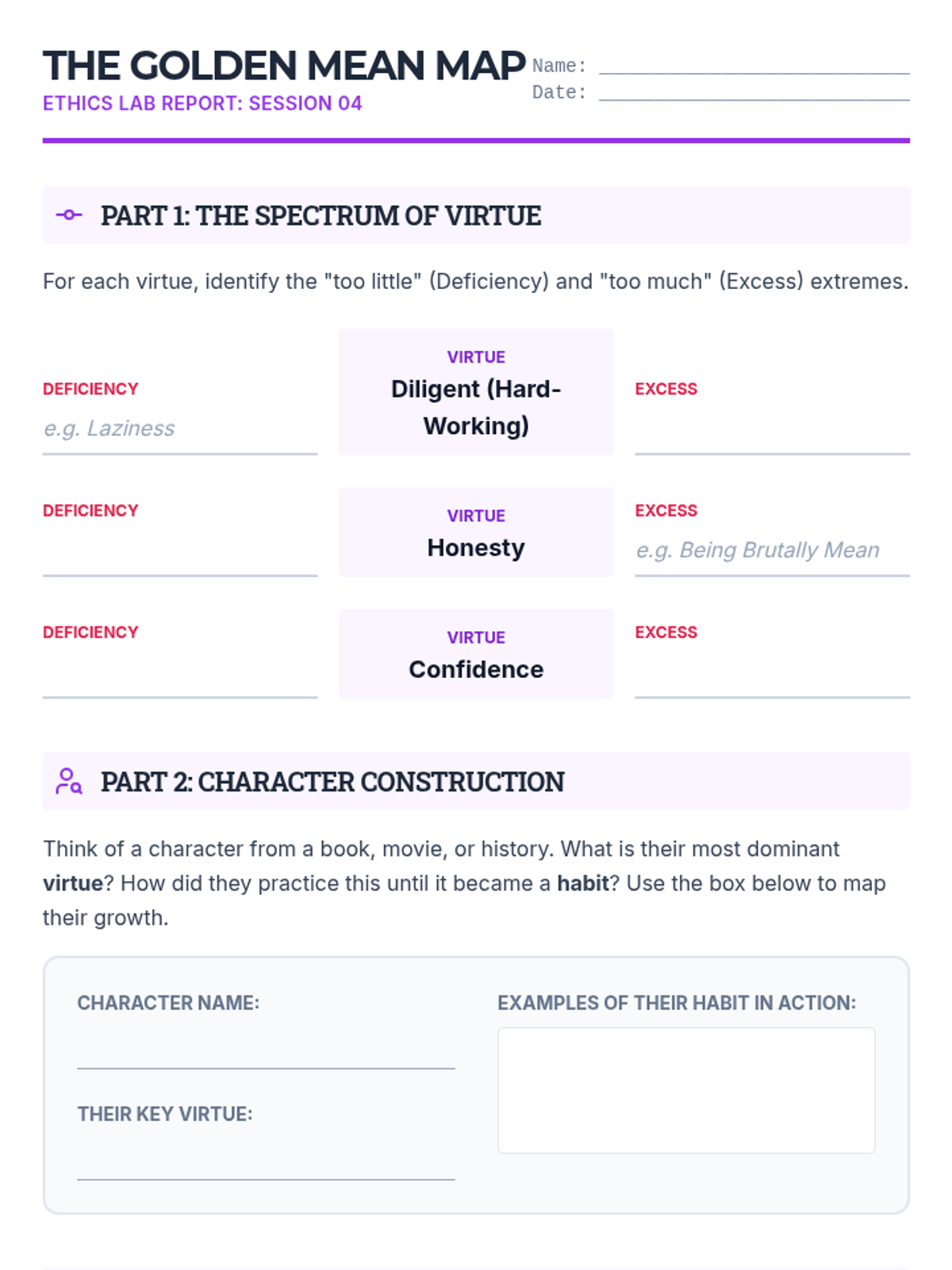 Shifts focus to character development and Aristotle's virtue ethics, helping students identify 'Golden Mean' virtues in themselves and others.
