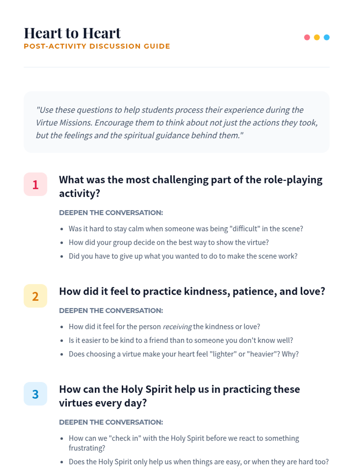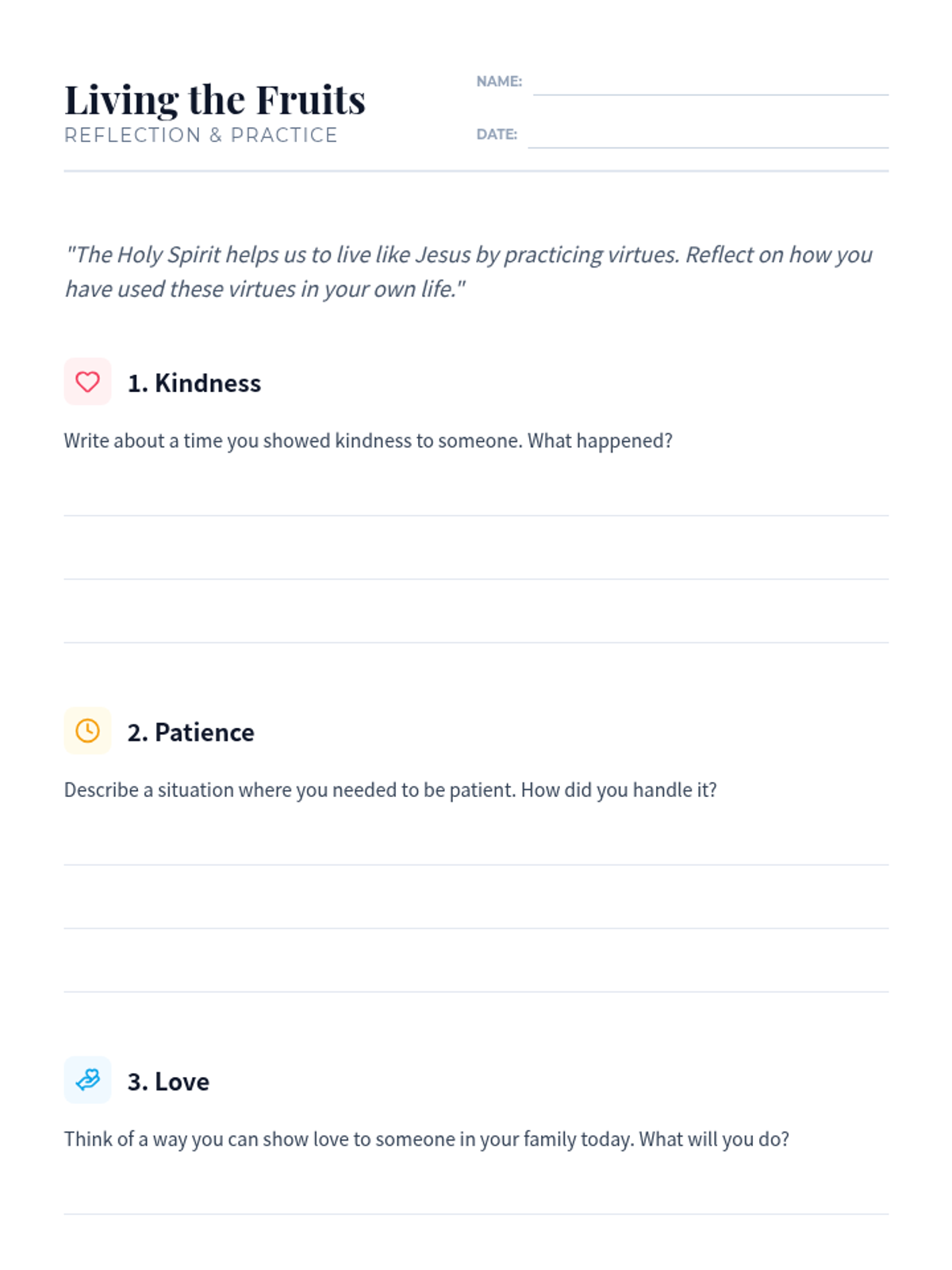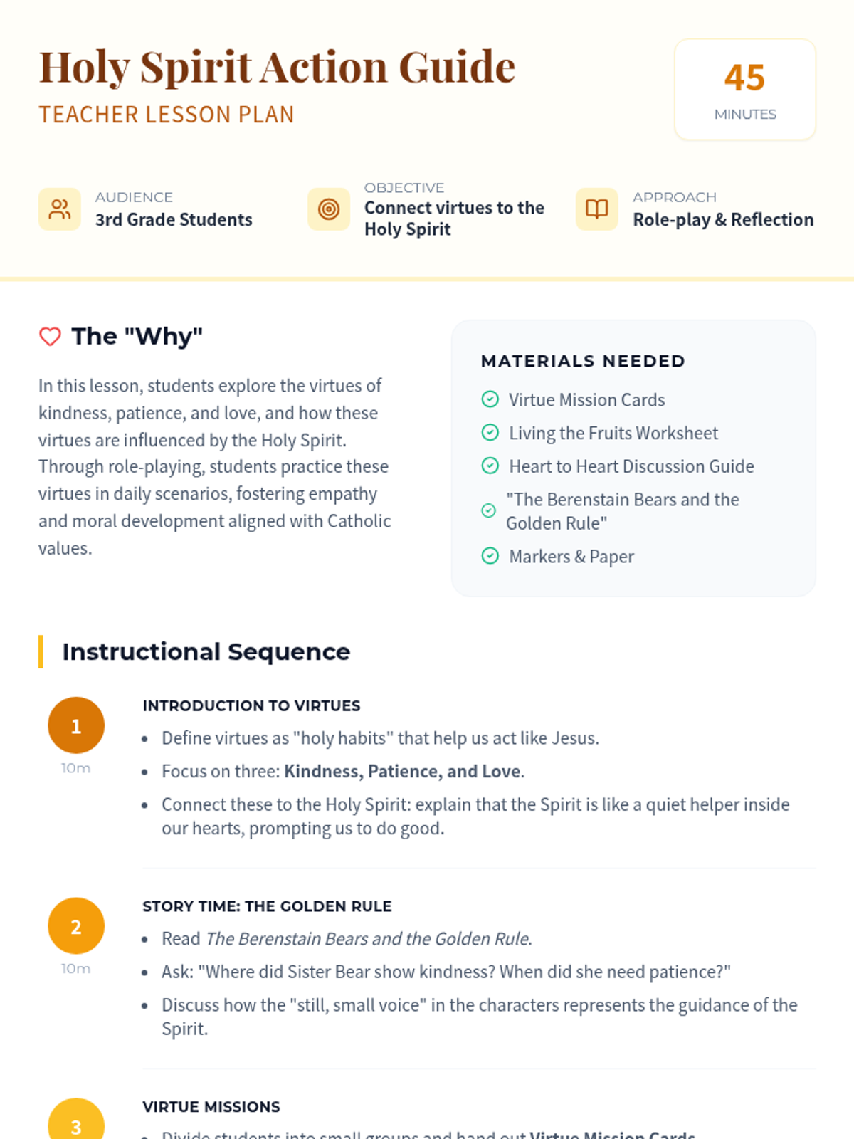 Students explore the virtues of kindness, patience, and love as guided by the Holy Spirit through role-play and reflection.