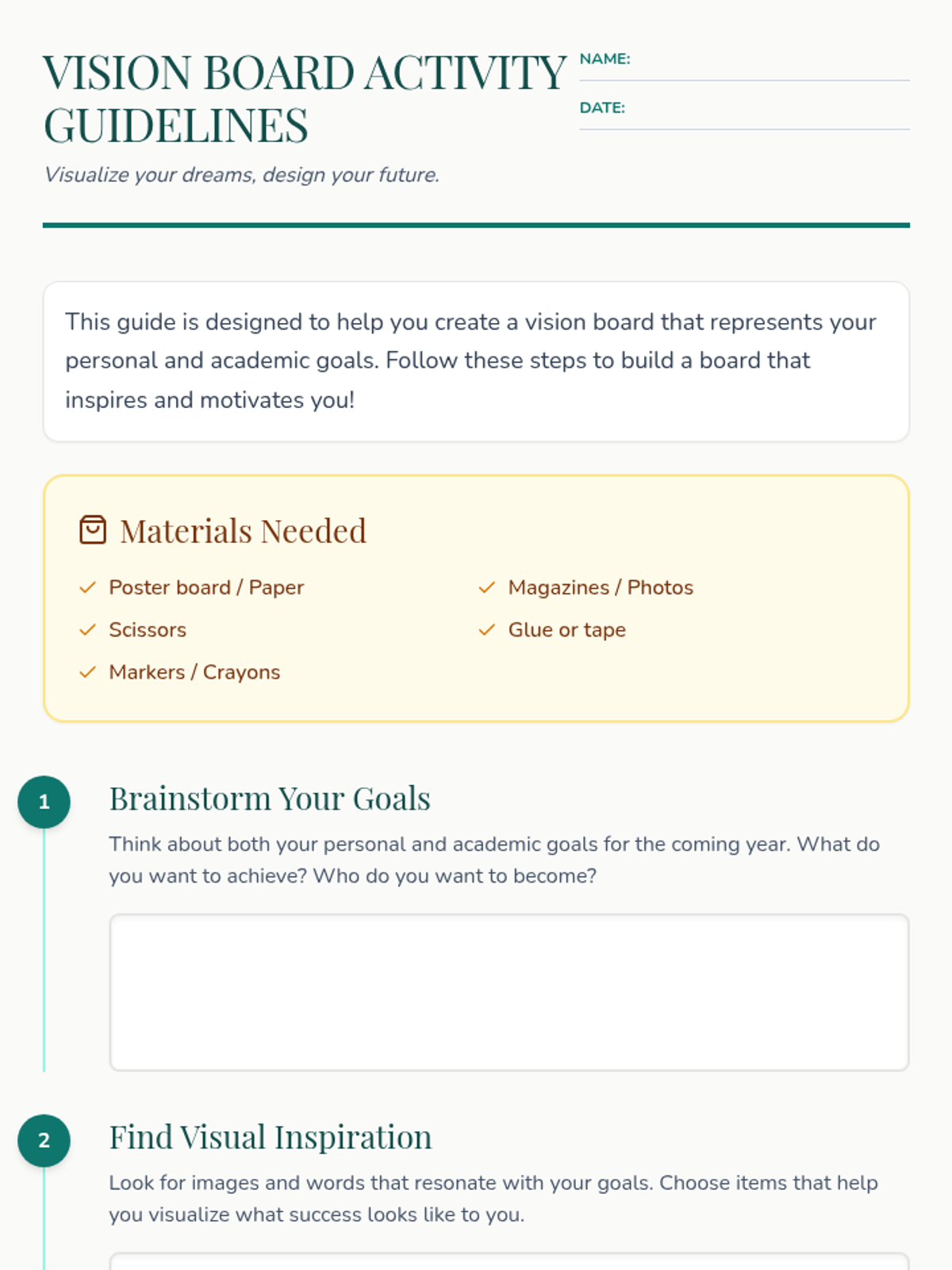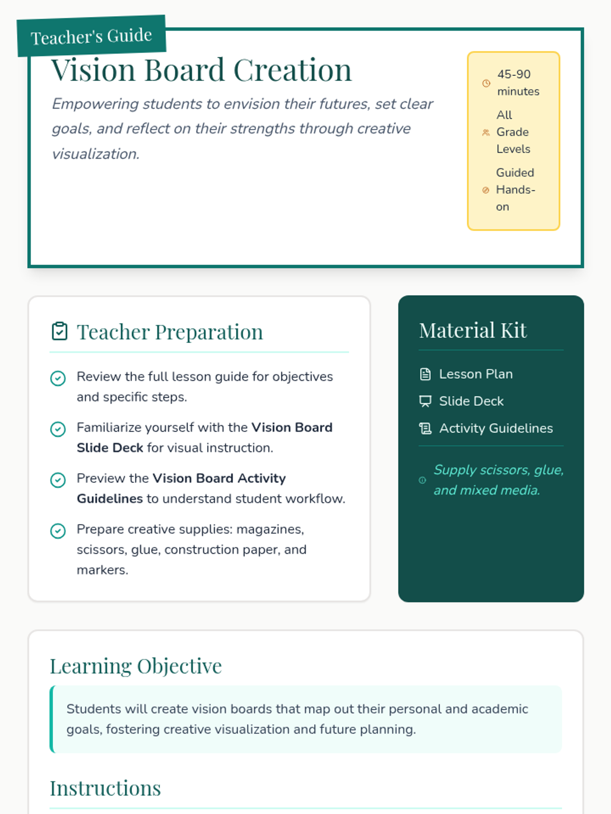 A creative, hands-on lesson where students design vision boards to map out their personal and academic goals using positive visualization.