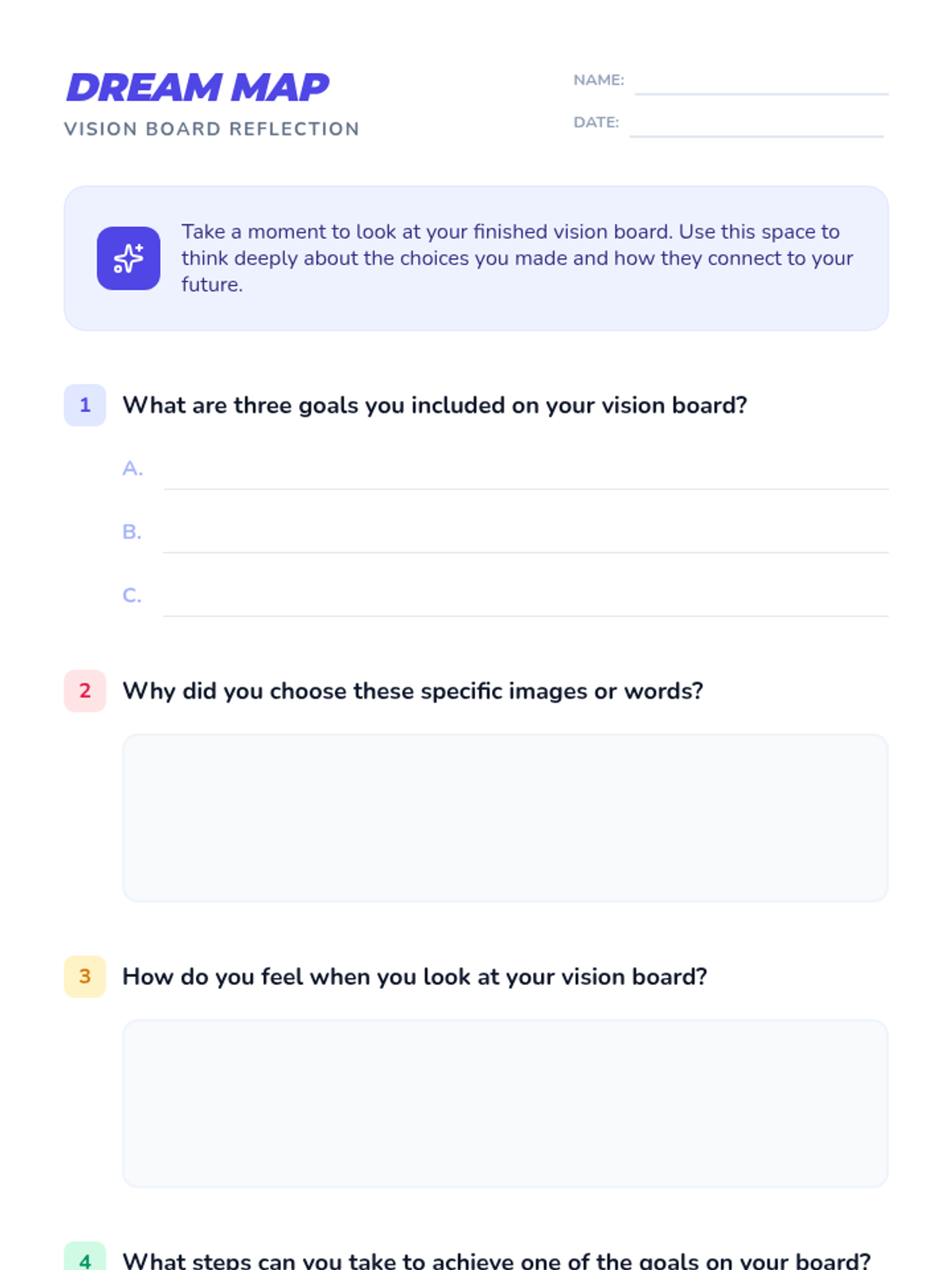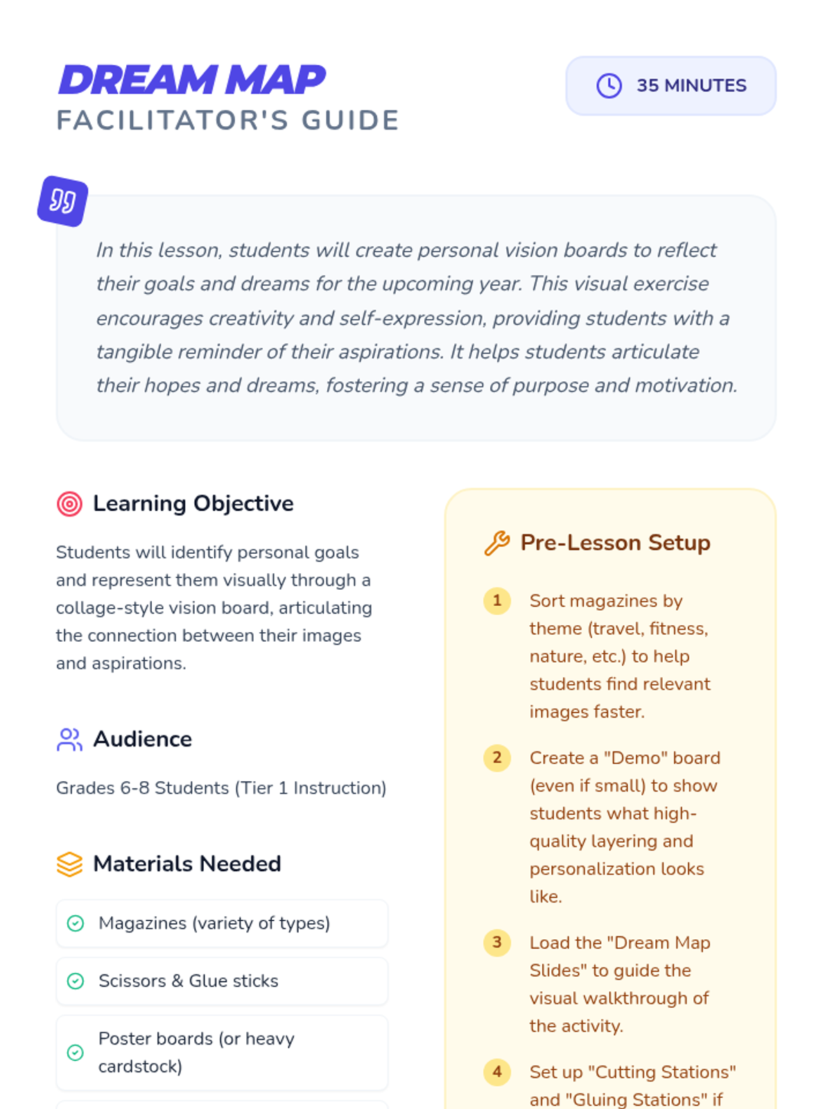 A creative lesson where students visualize their future goals and aspirations through collage-style vision boards, fostering motivation and self-expression.