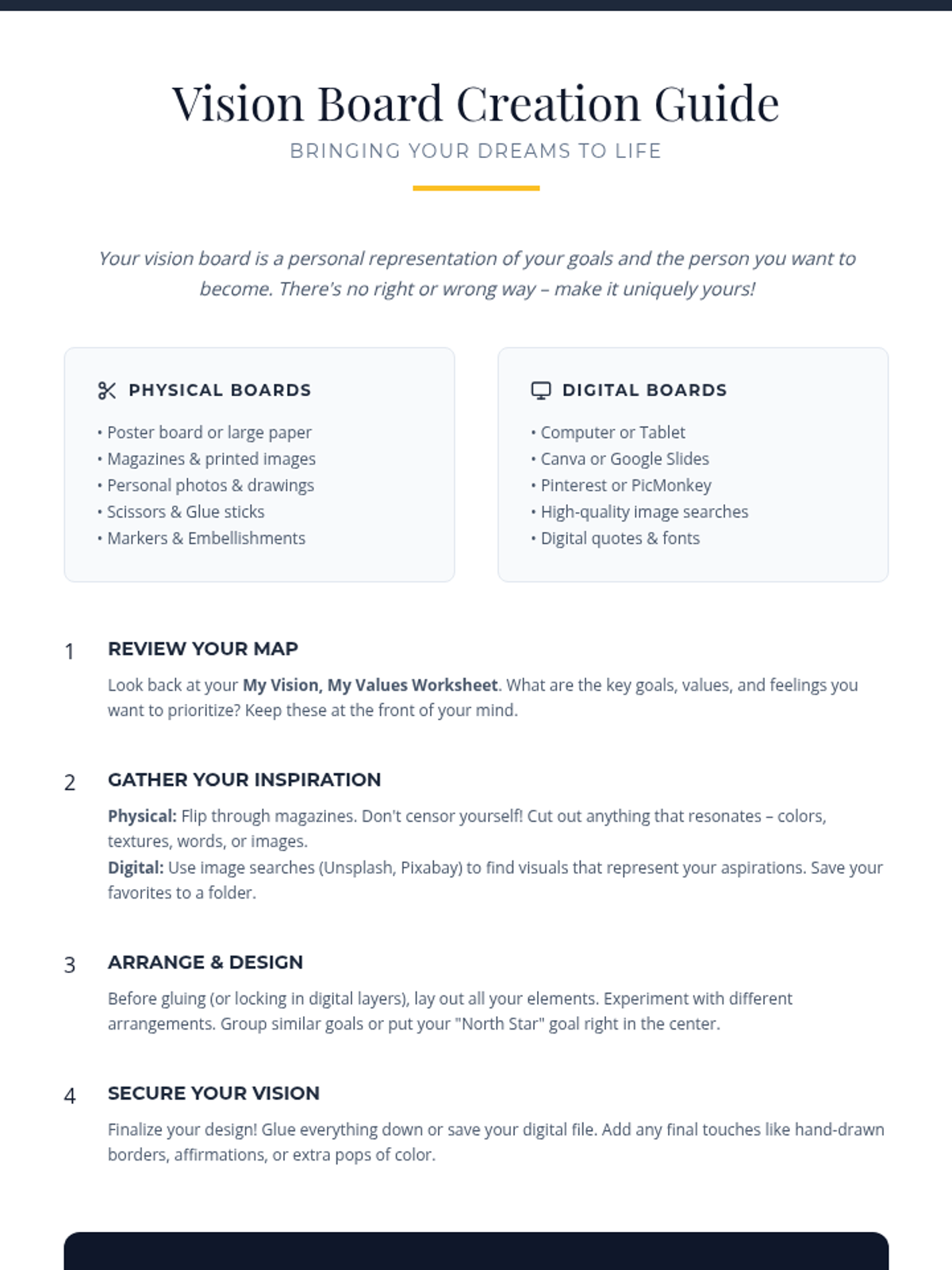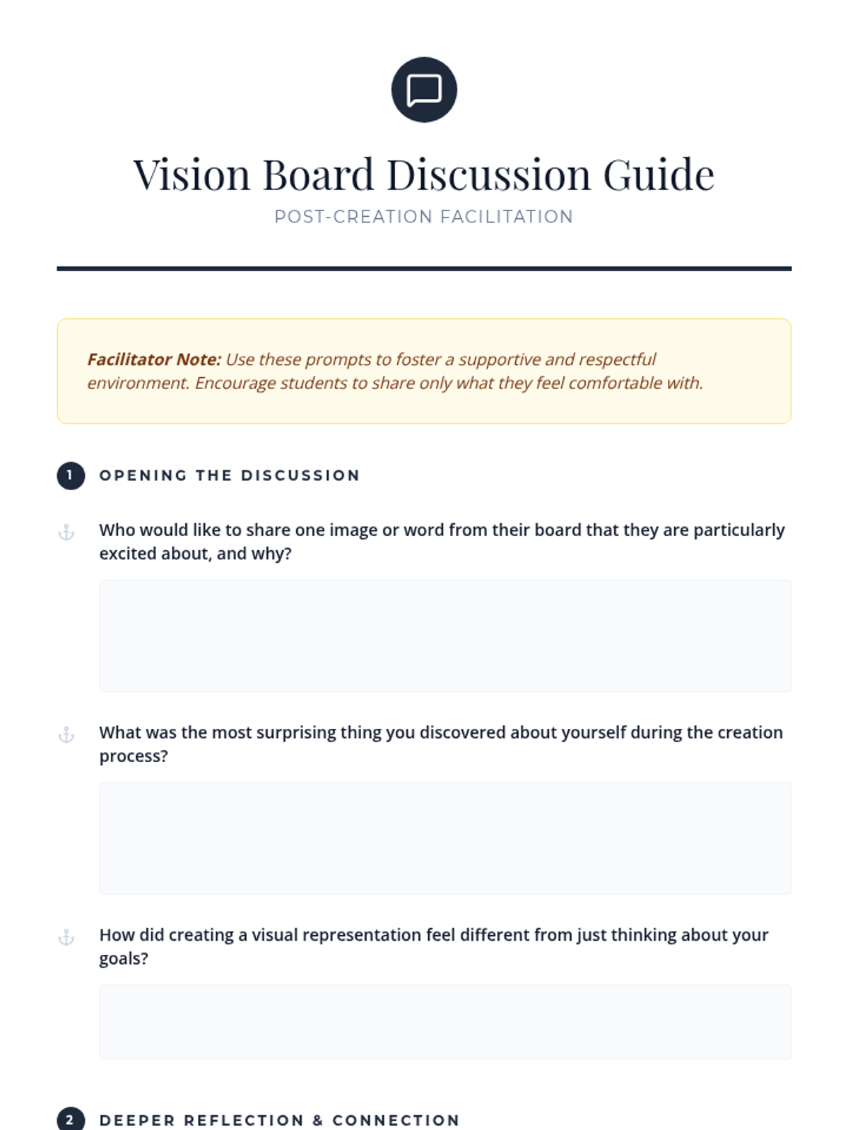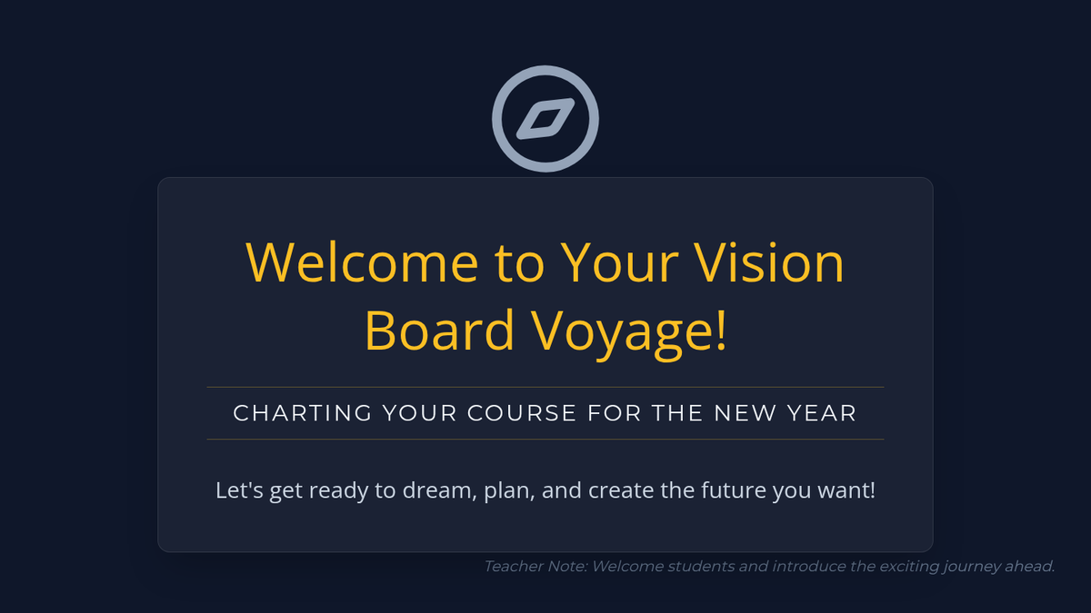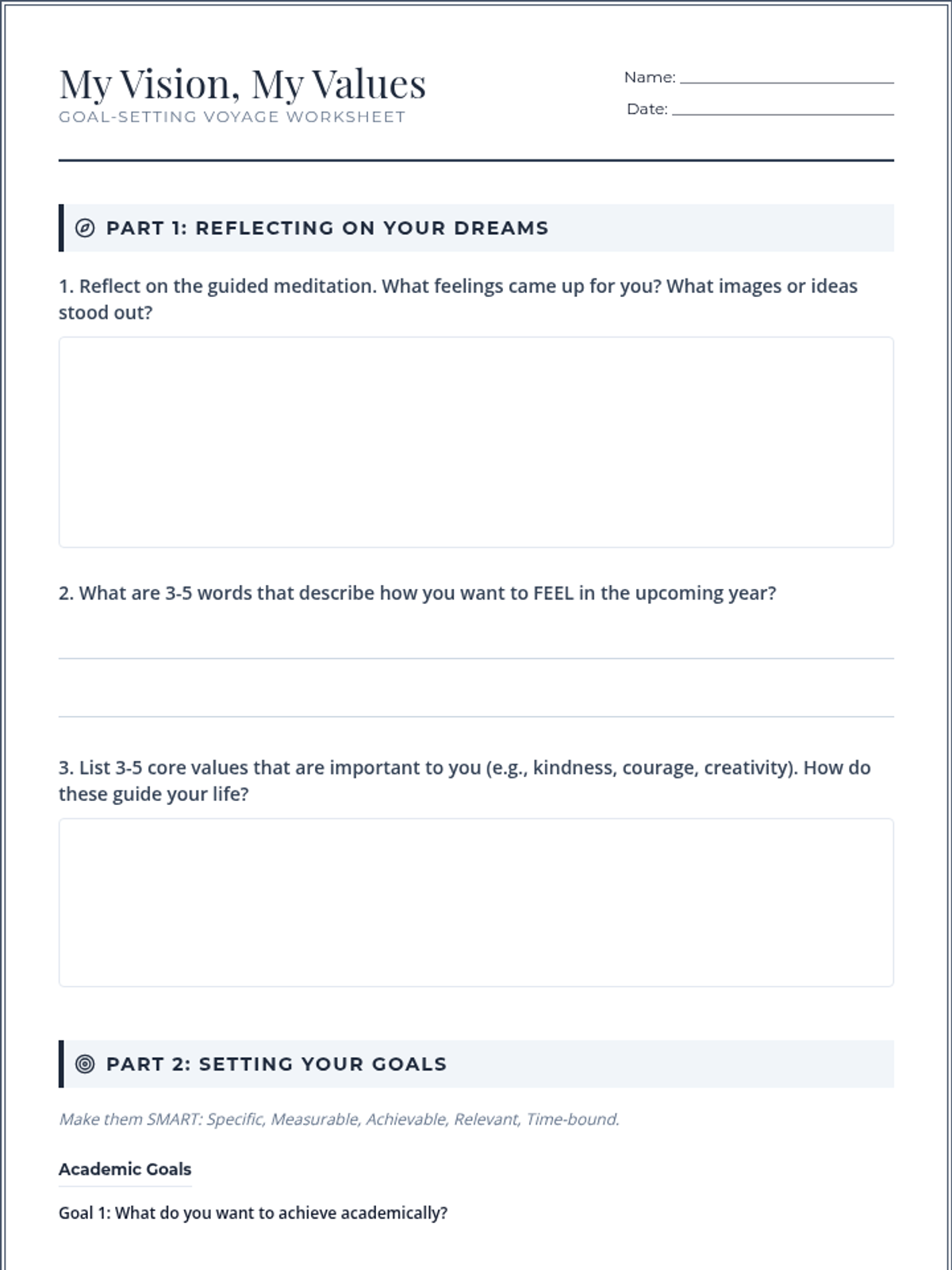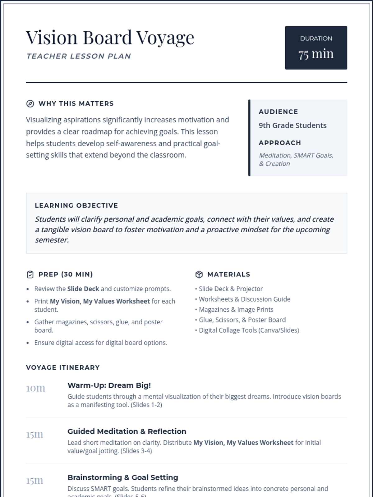 A transformative lesson for 9th-grade students to visualize their semester goals and core values through the creation of a physical or digital vision board. Students engage in guided reflection, SMART goal setting, and creative expression to foster a proactive mindset.