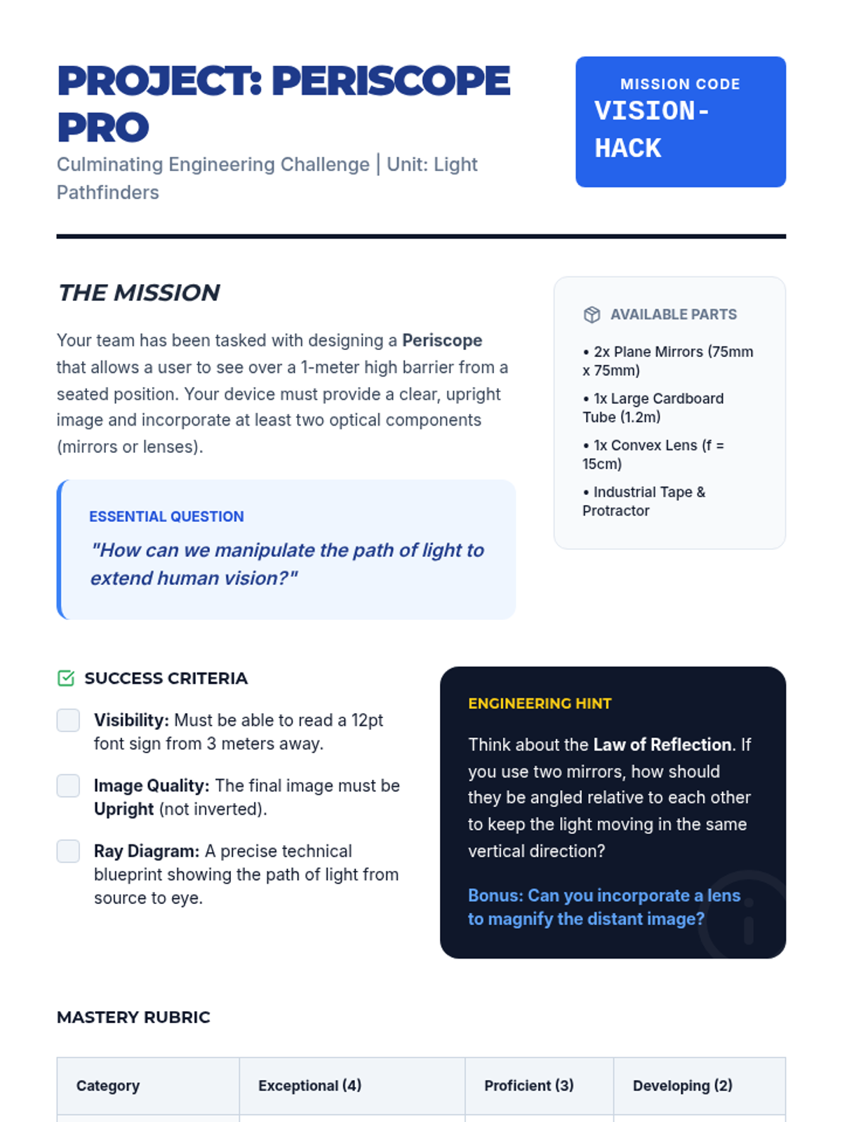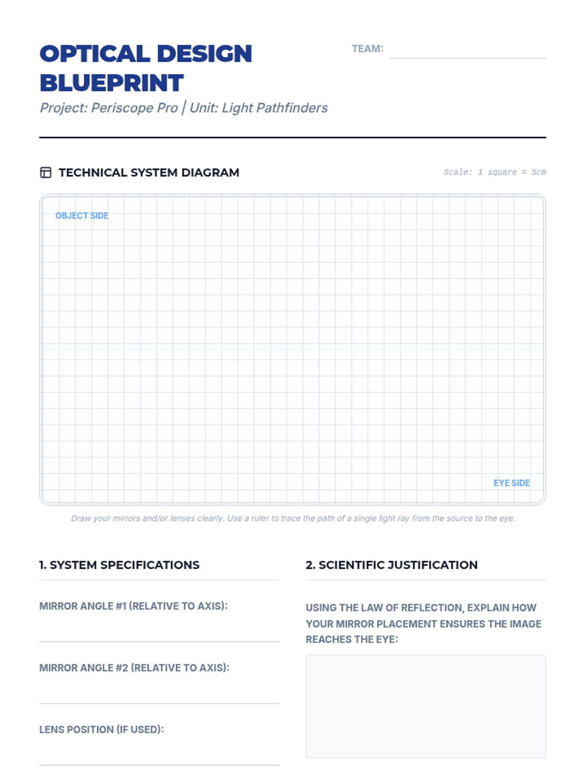 A culminating engineering challenge where students design and simulate optical systems. They apply their knowledge of reflection and refraction to solve real-world visibility problems.