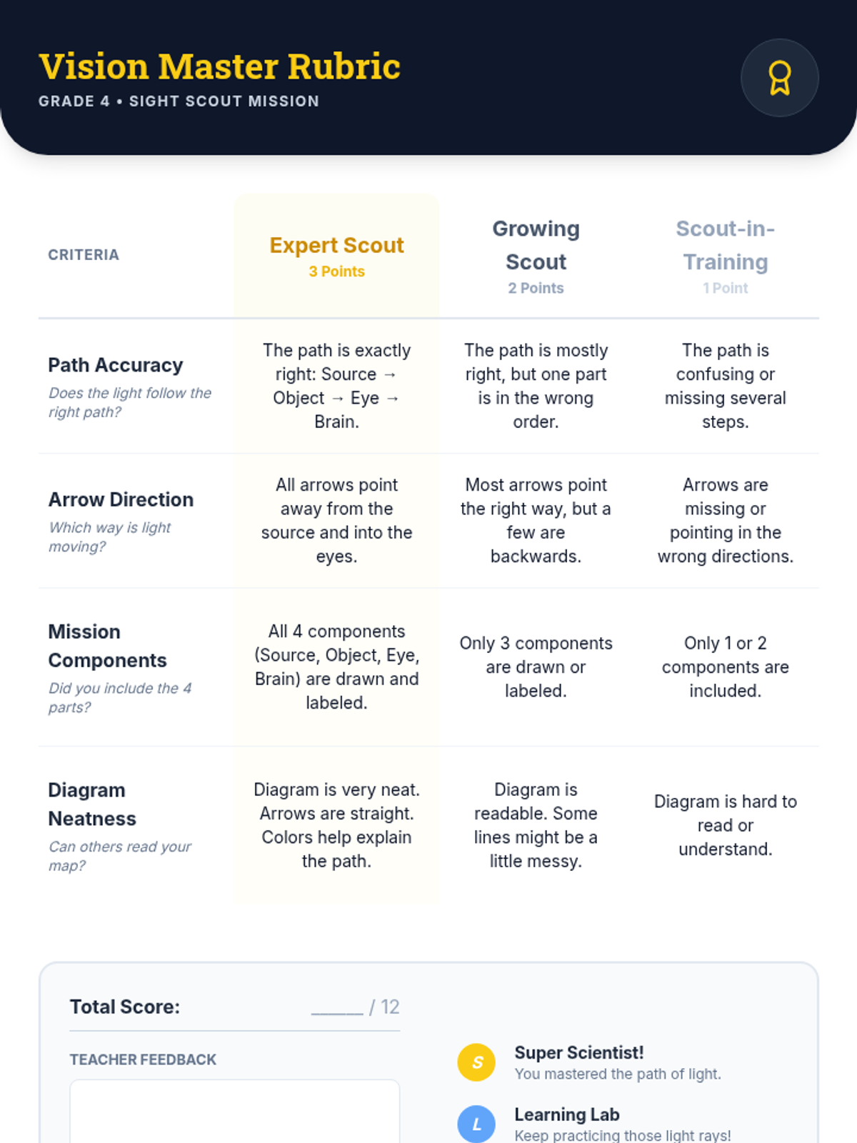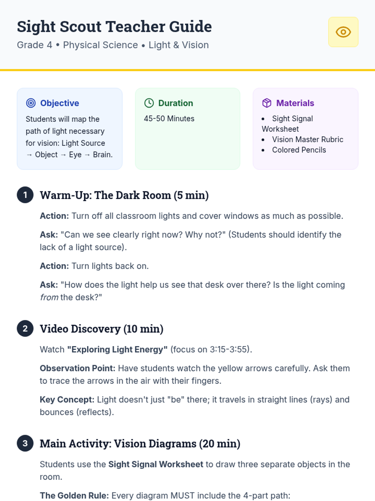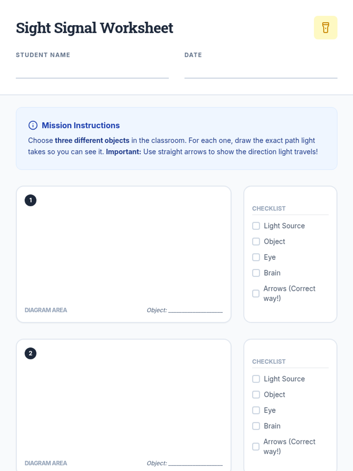 A hands-on science lesson where 4th-grade students investigate and diagram the path light takes to enable vision, from source to brain.