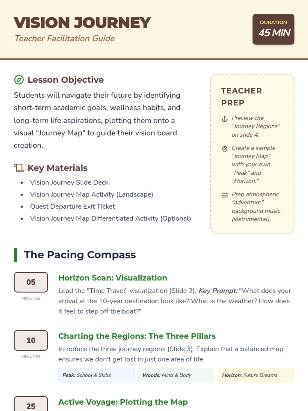A 45-minute lesson guiding middle school students to visualize their future through short-term academic, wellness, and long-term life goals.