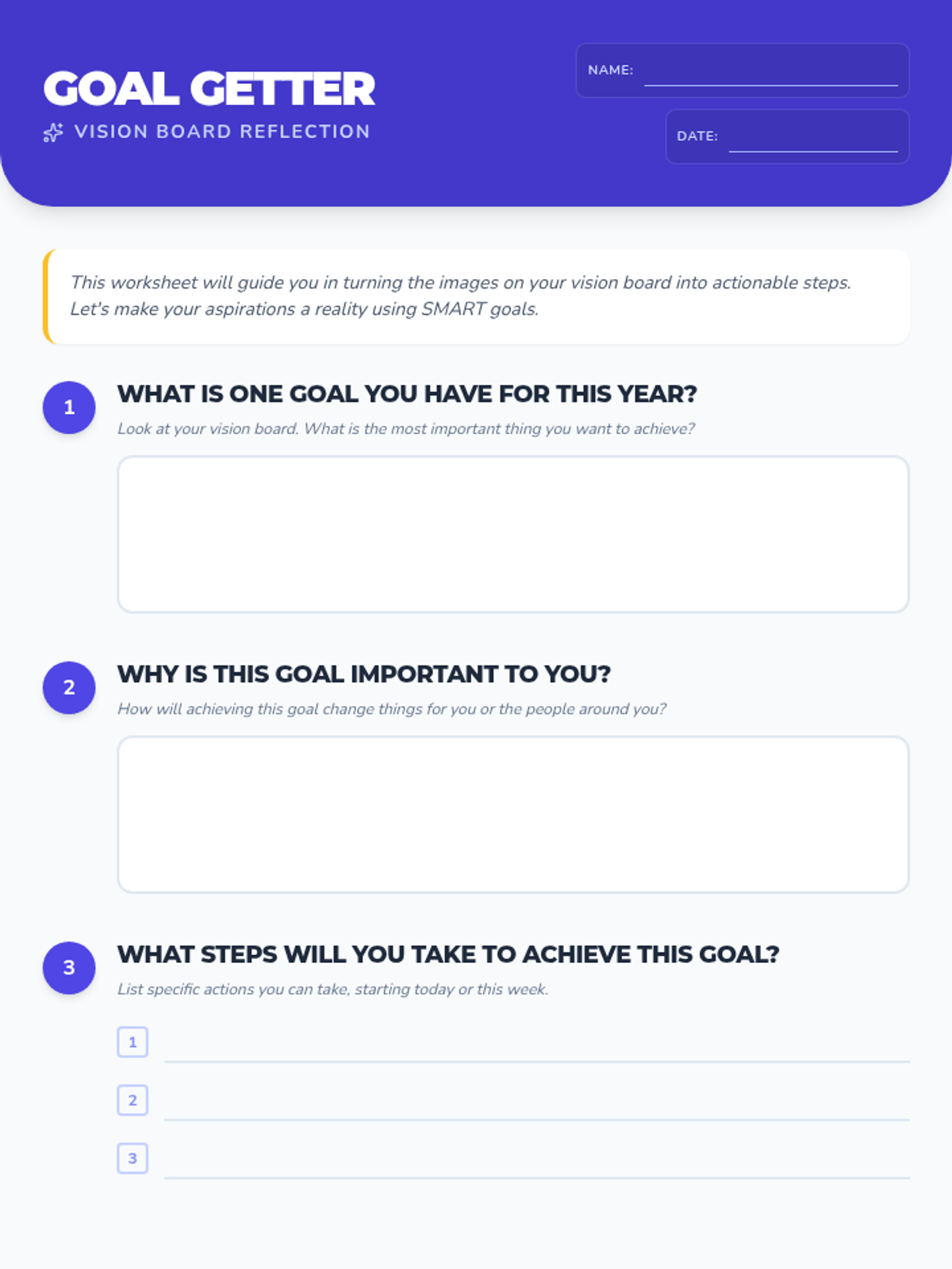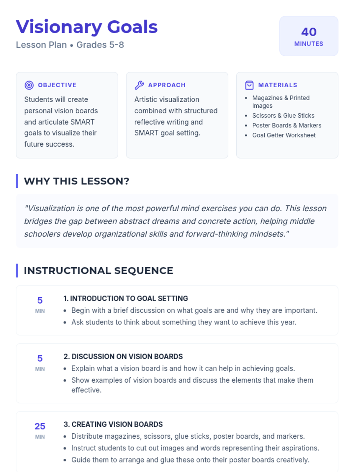 Students explore the power of visualization and goal-setting by creating personal vision boards and articulating SMART goals for the future.