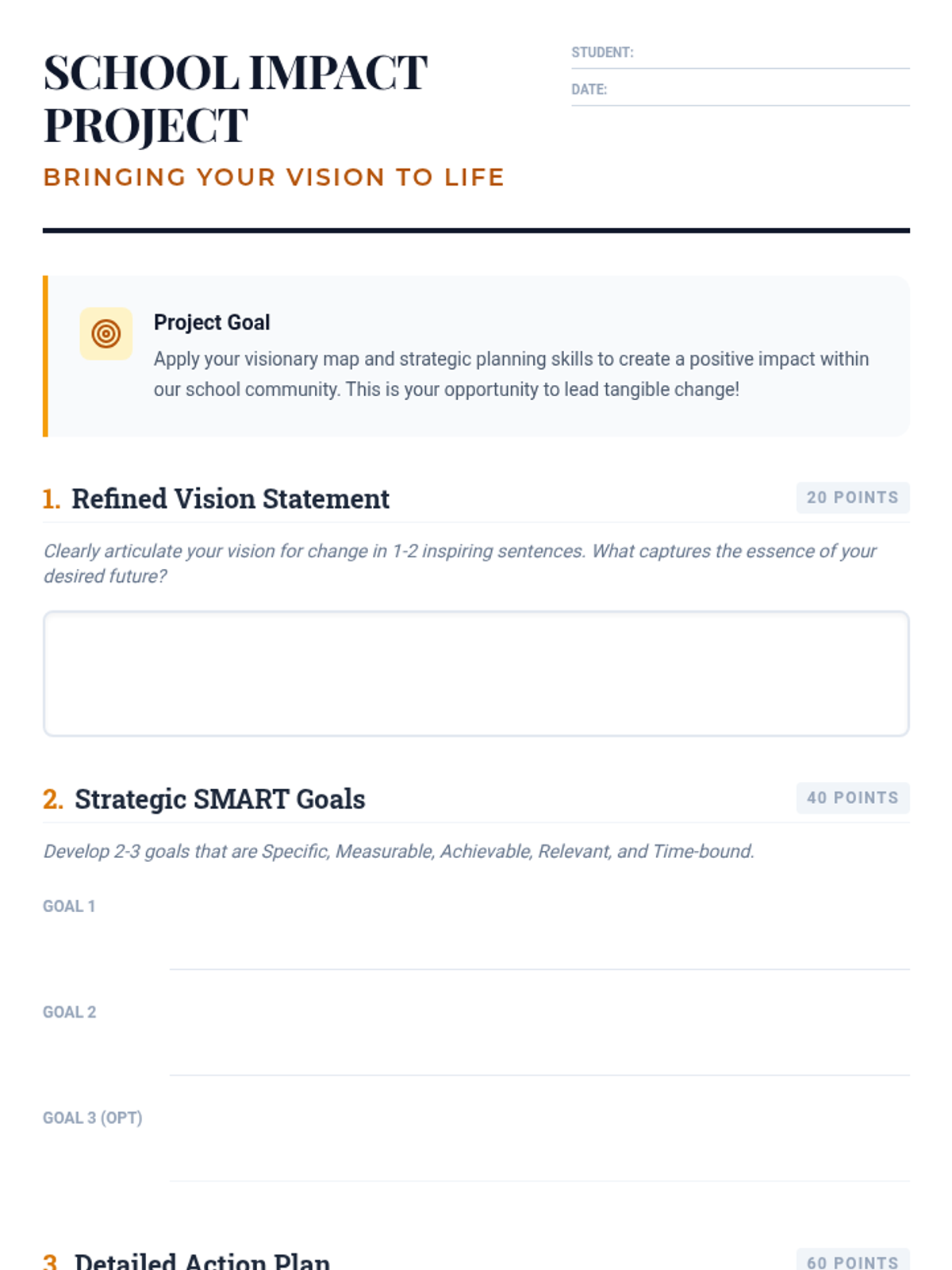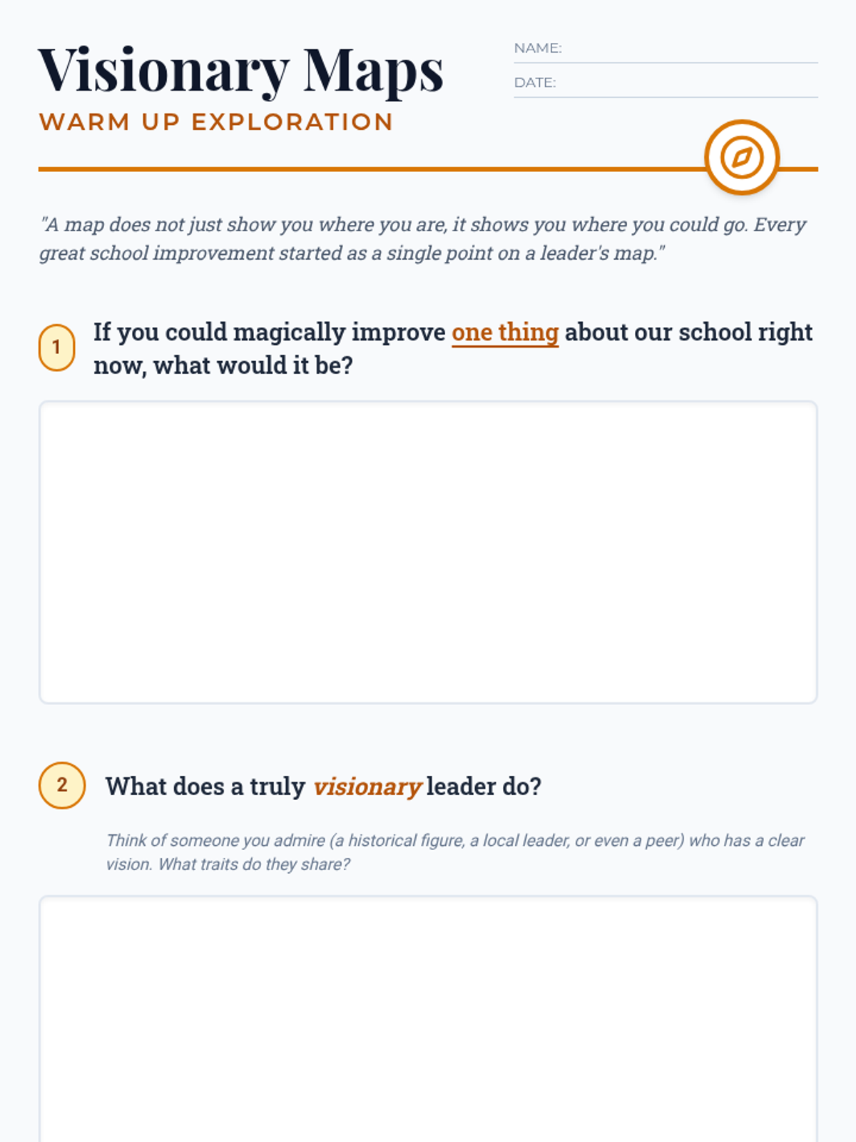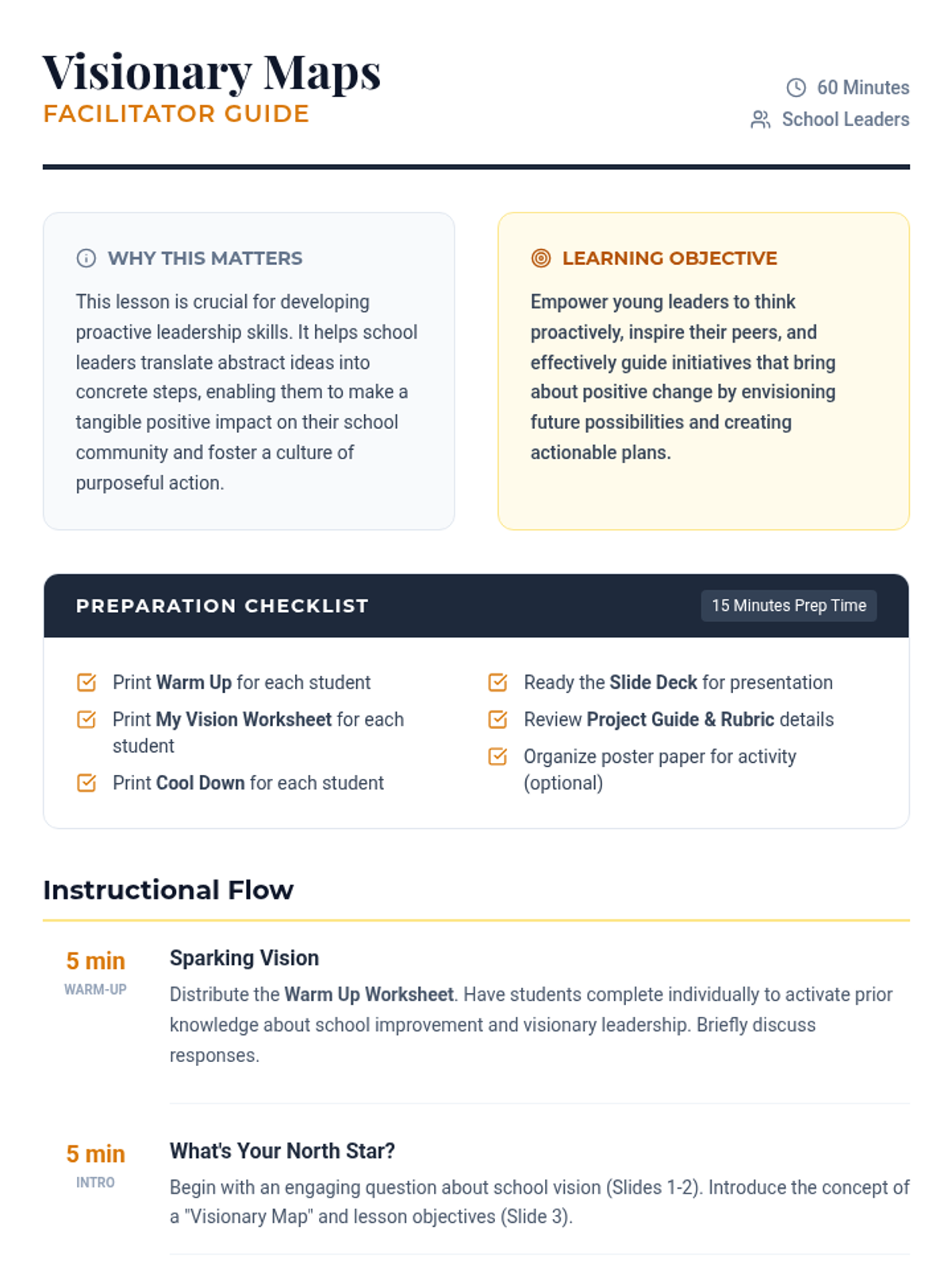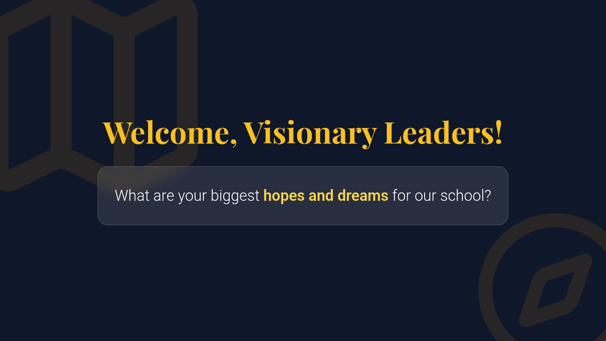 A lesson designed to help School Leaders develop visionary leadership skills through strategic planning and actionable goal setting. Students learn to translate abstract school improvement ideas into concrete 'Visionary Maps' using SMART goals and impact planning.