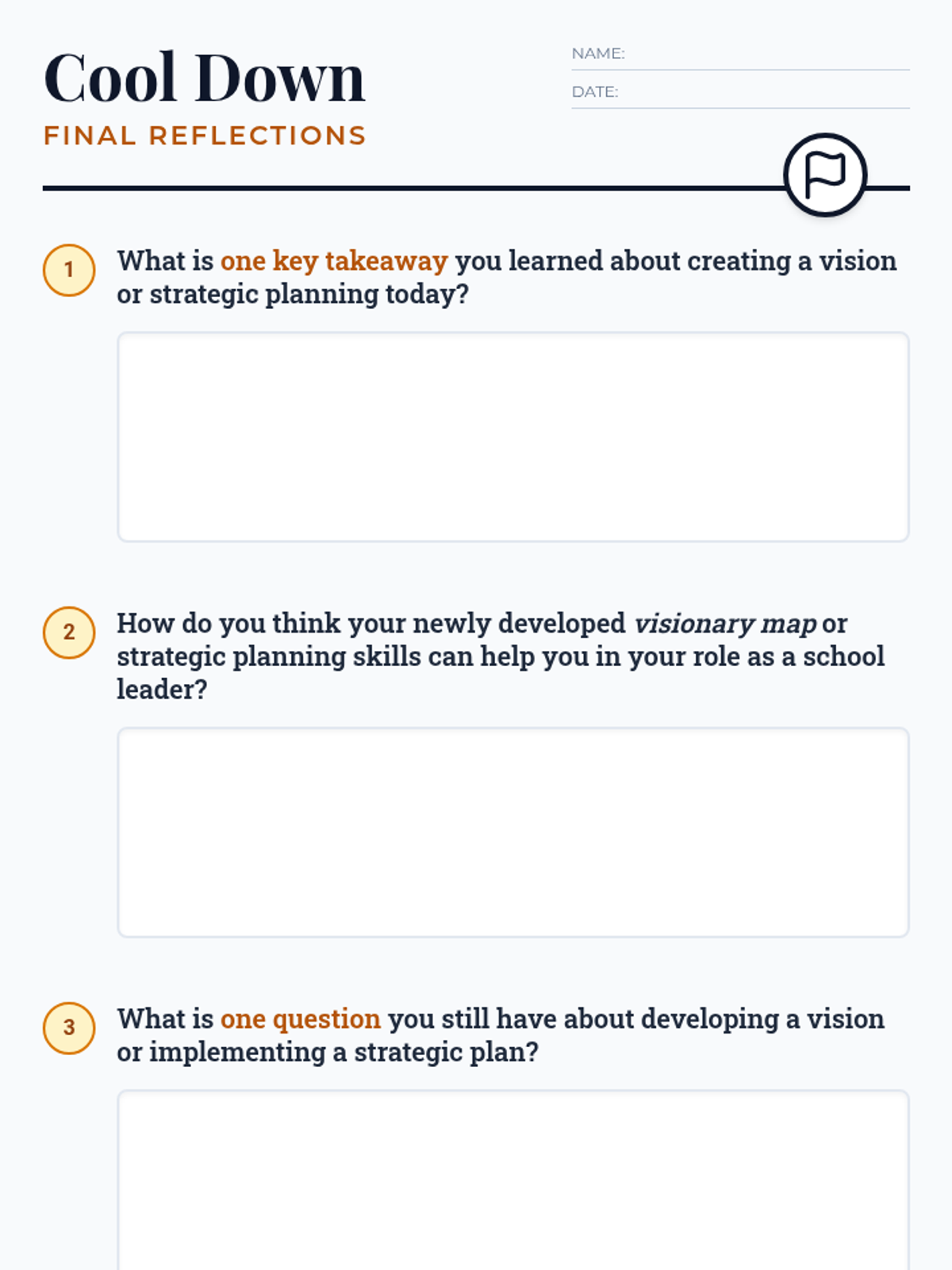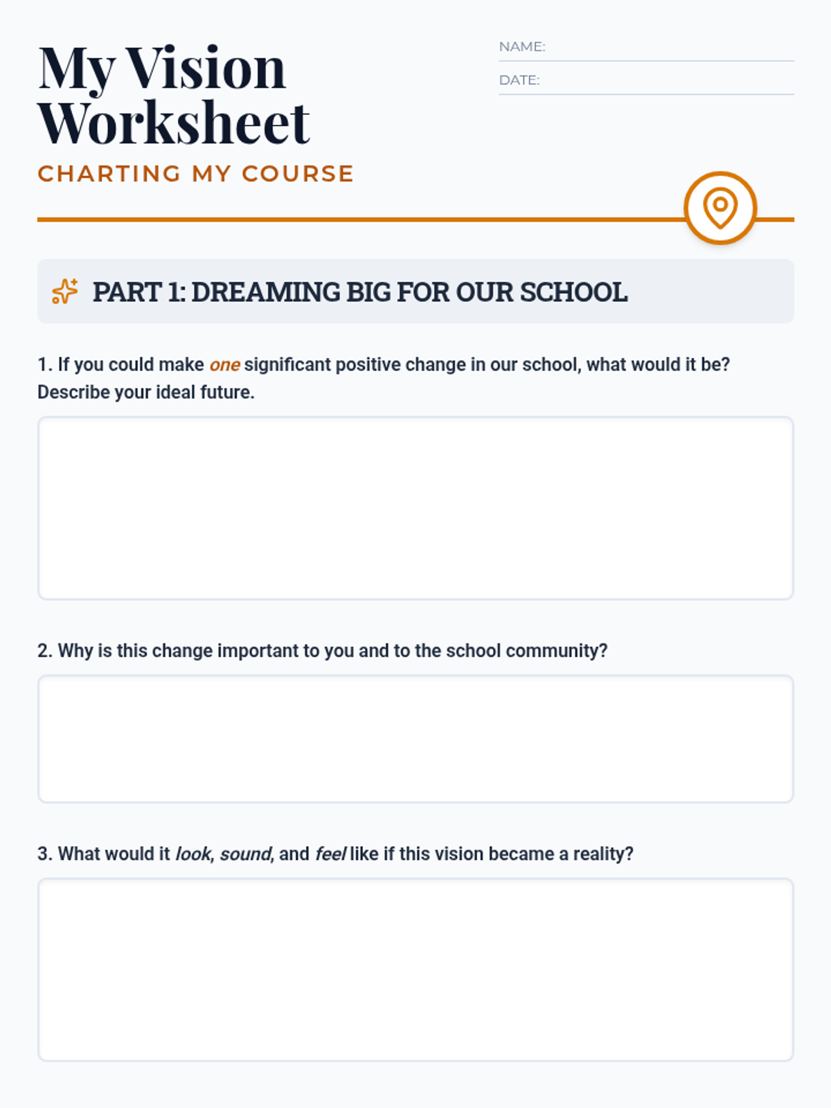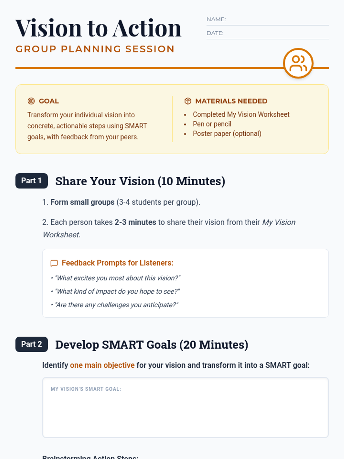 A lesson designed to help School Leaders develop visionary leadership skills through strategic planning and actionable goal setting. Students learn to translate abstract school improvement ideas into concrete 'Visionary Maps' using SMART goals and impact planning.