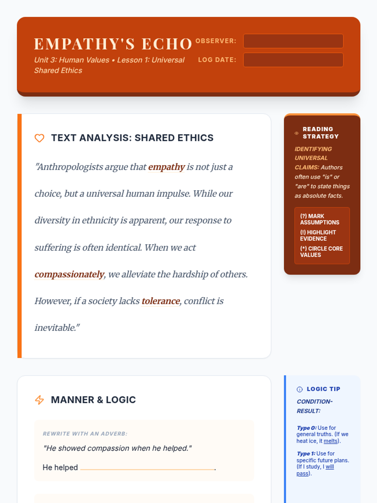 An analysis of universal human values and empathy. Students explore shared ethics, master adverbs of manner, and use If-conditionals (Type 0 & 1) to discuss inevitable outcomes and plans.