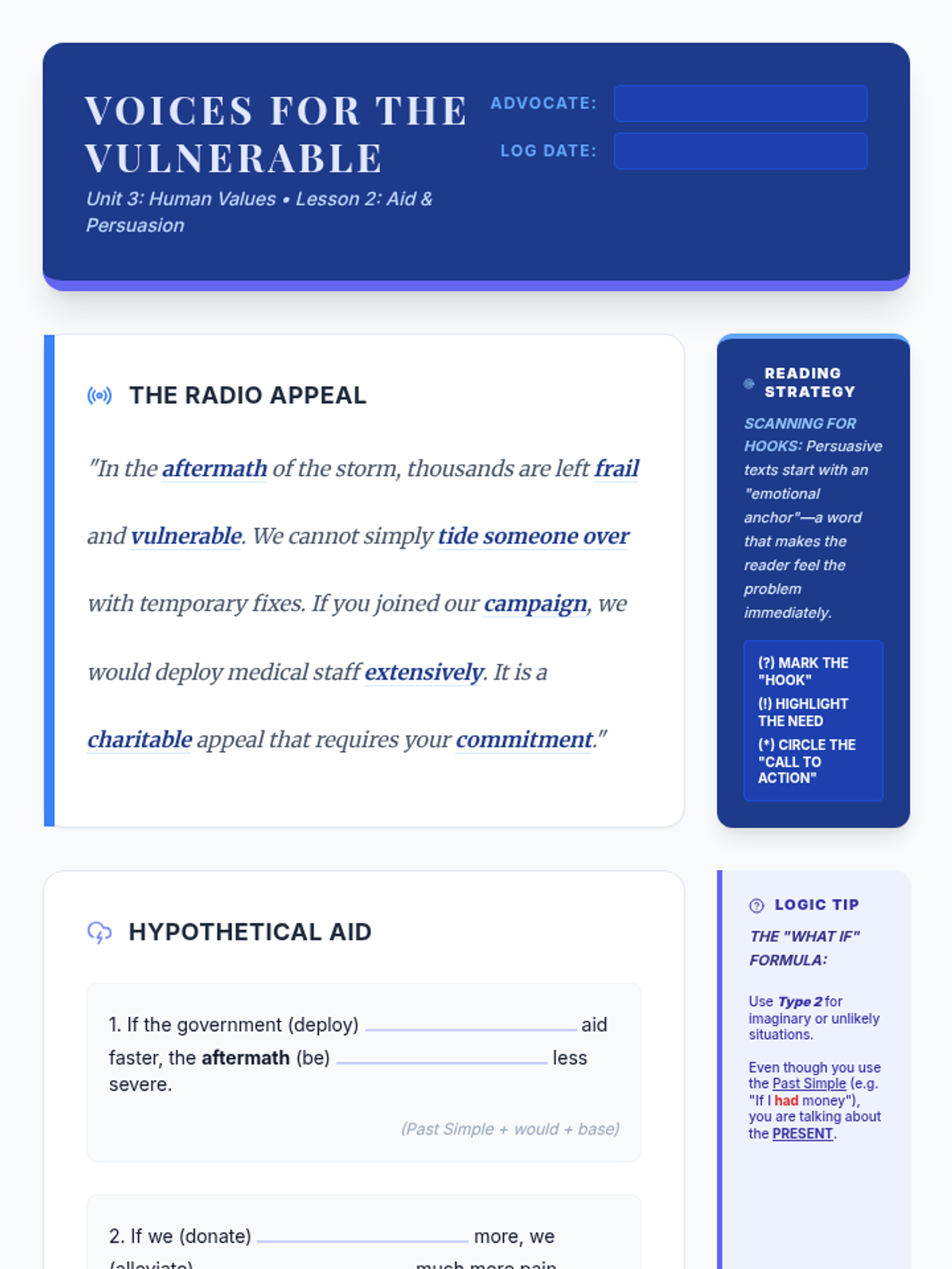 A focus on humanitarian aid and the power of persuasion. Students analyze charity radio adverts, practice presenting information compassionately, and use If-conditional Type 2 to explore hypothetical possibilities.
