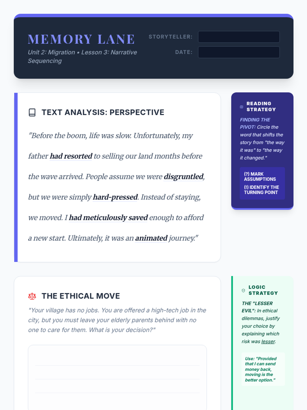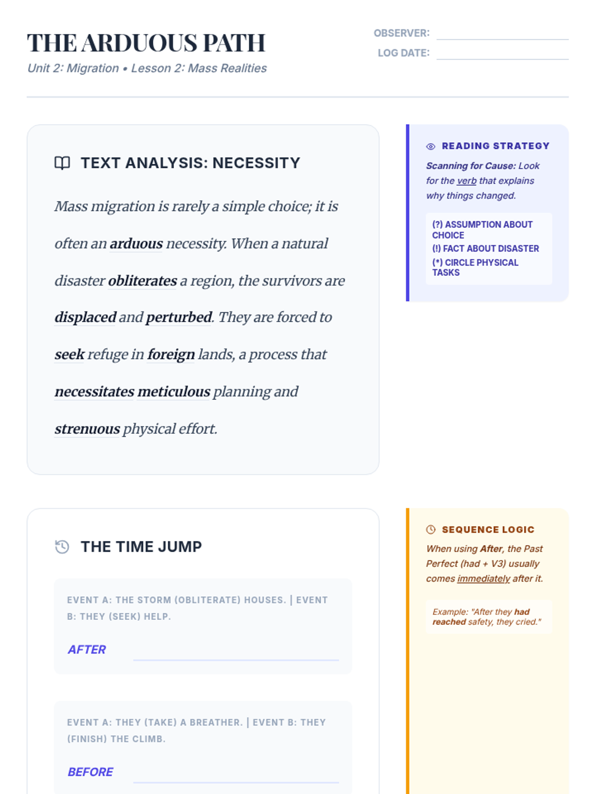 A deep dive into the challenges and triumphs of the migrant experience. Students analyze an article on mass migration, master the past perfect with 'before' and 'after', and discuss the advantages and disadvantages of moving to a foreign land.