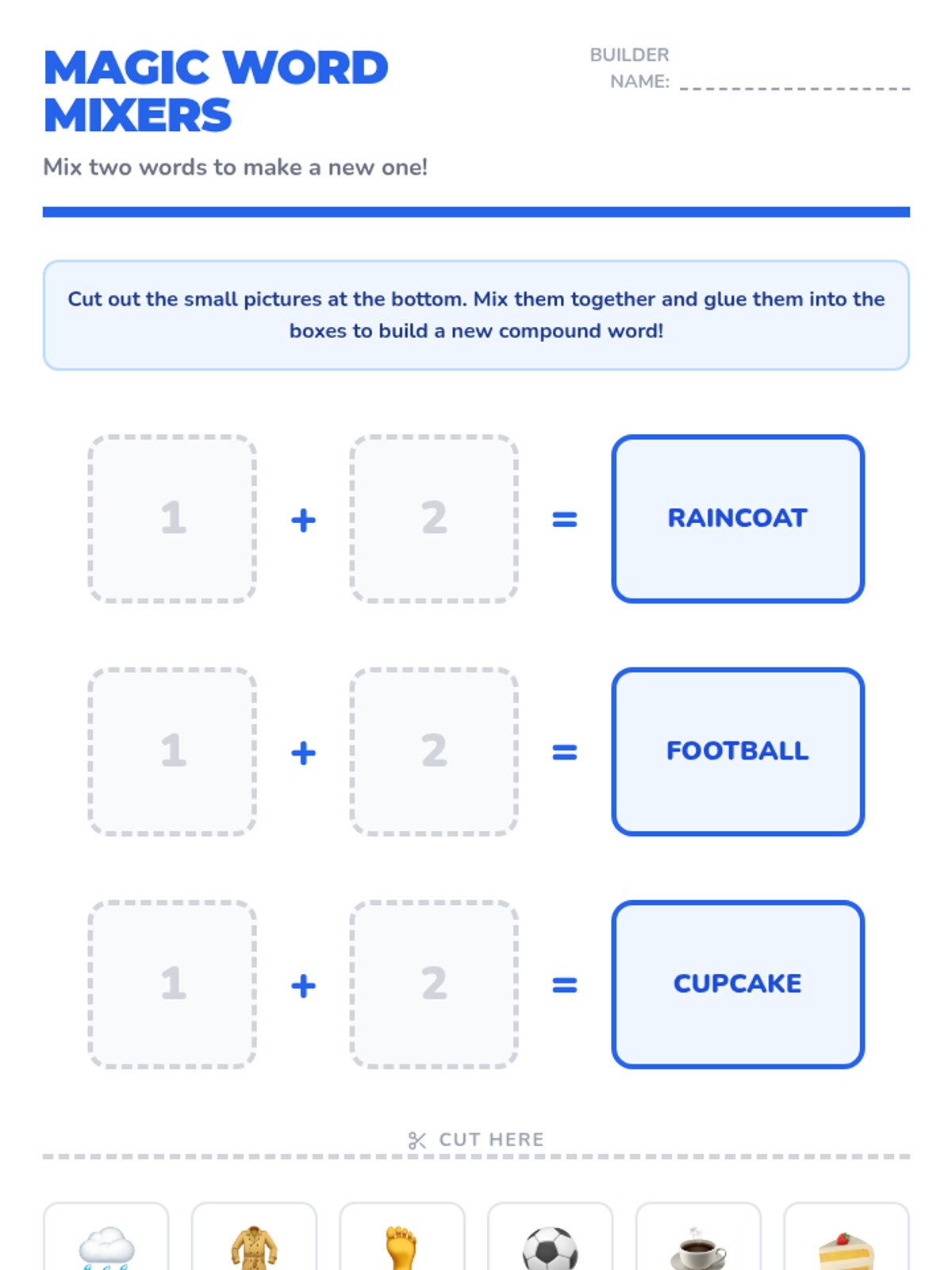 Students combine two distinct picture cards to create compound words, understanding how small parts make a larger whole.