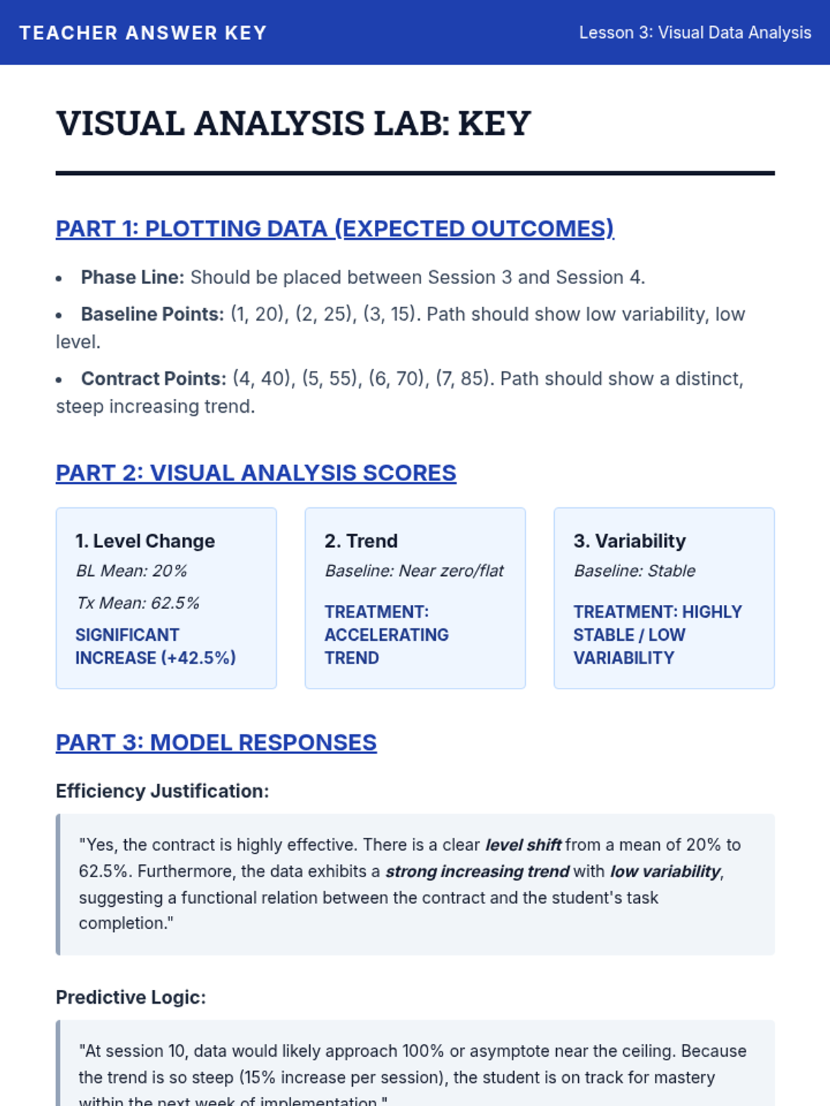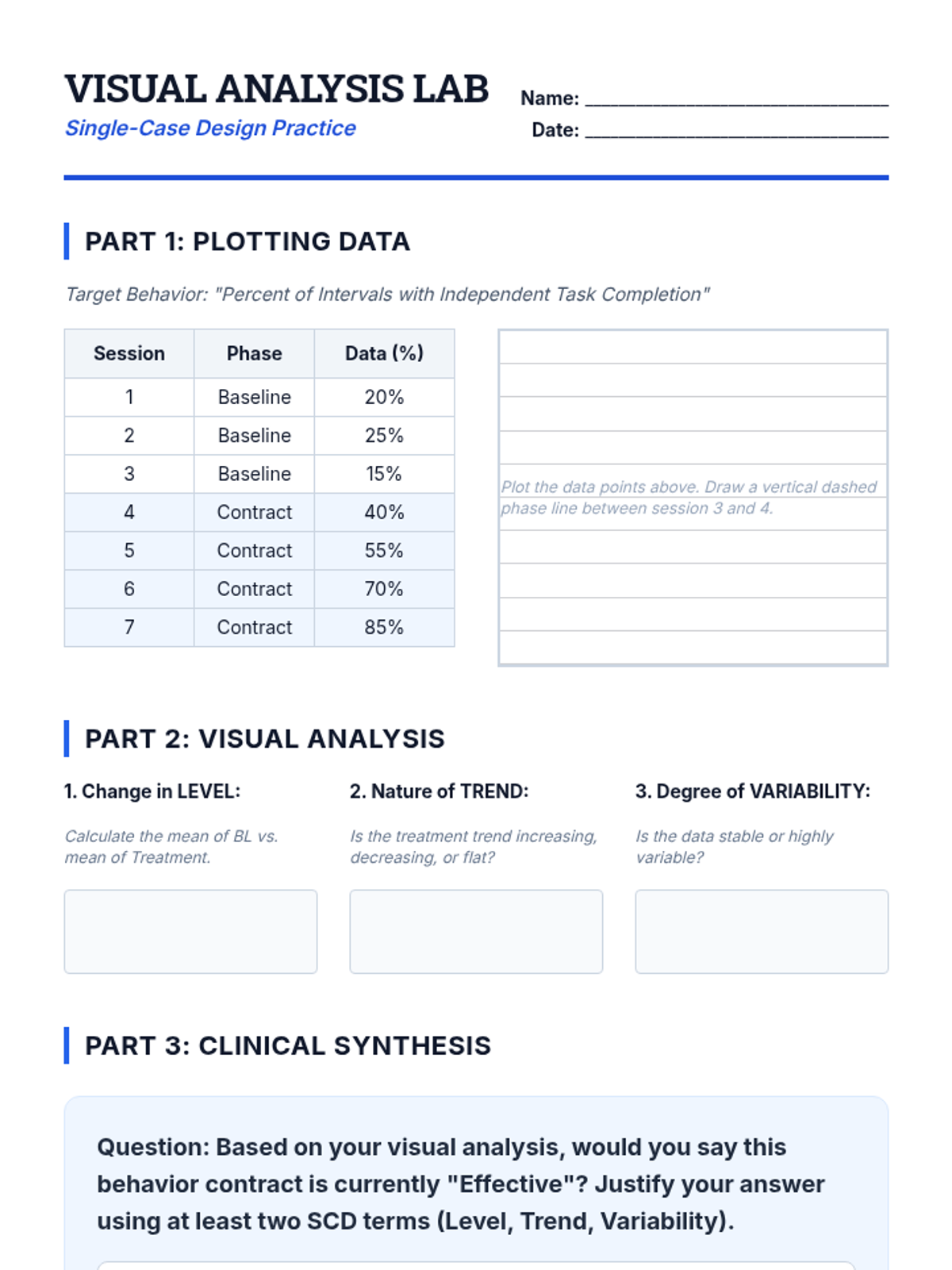 Students apply single-case design principles to graph and interpret behavioral data, focusing on level, trend, and variability to evaluate contract effectiveness.