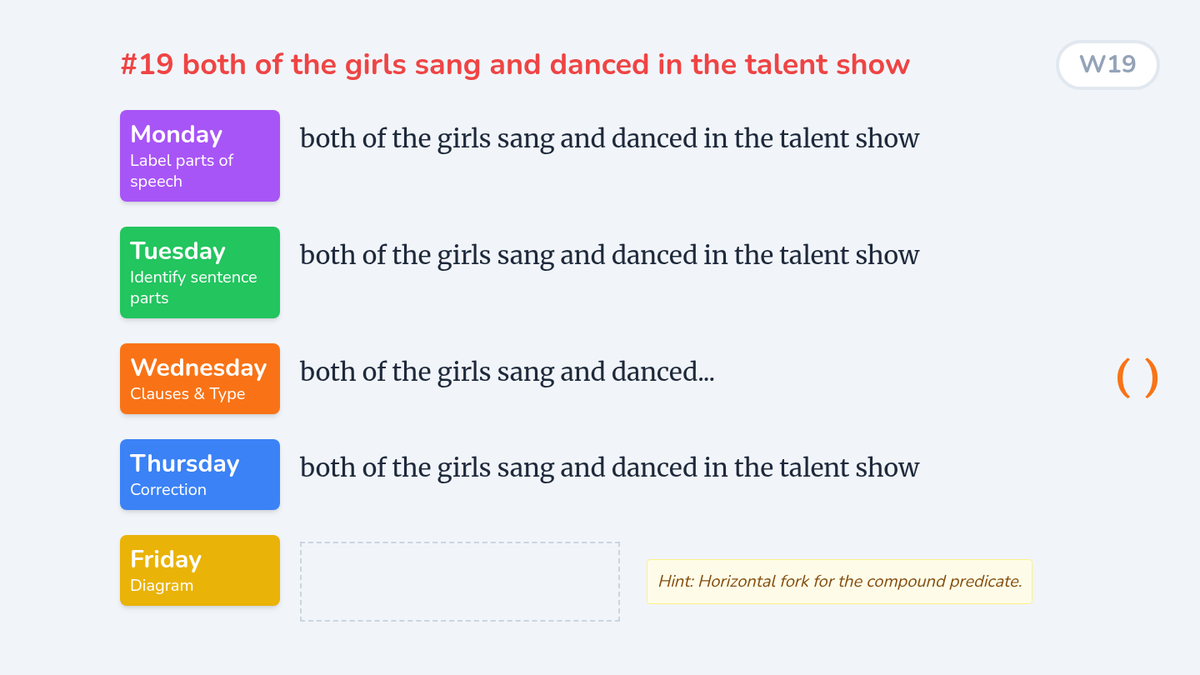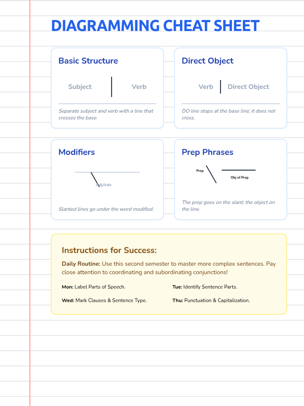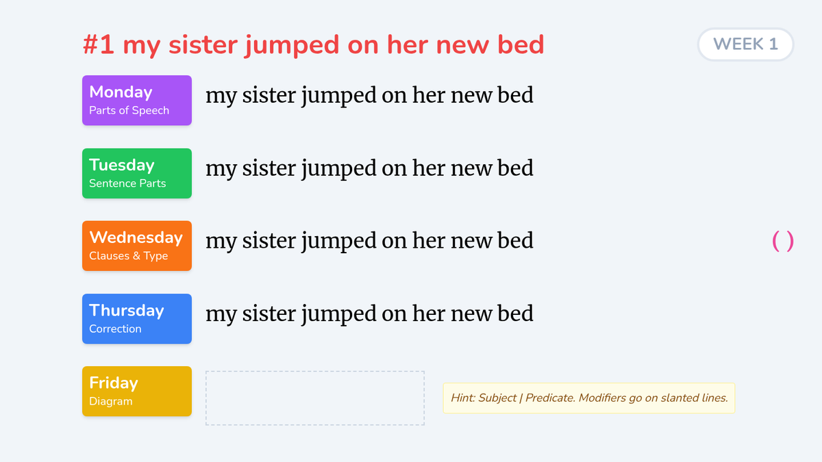 Weeks 1 through 18 of the Daily Grammar Practice program, covering basic to intermediate sentence structures.