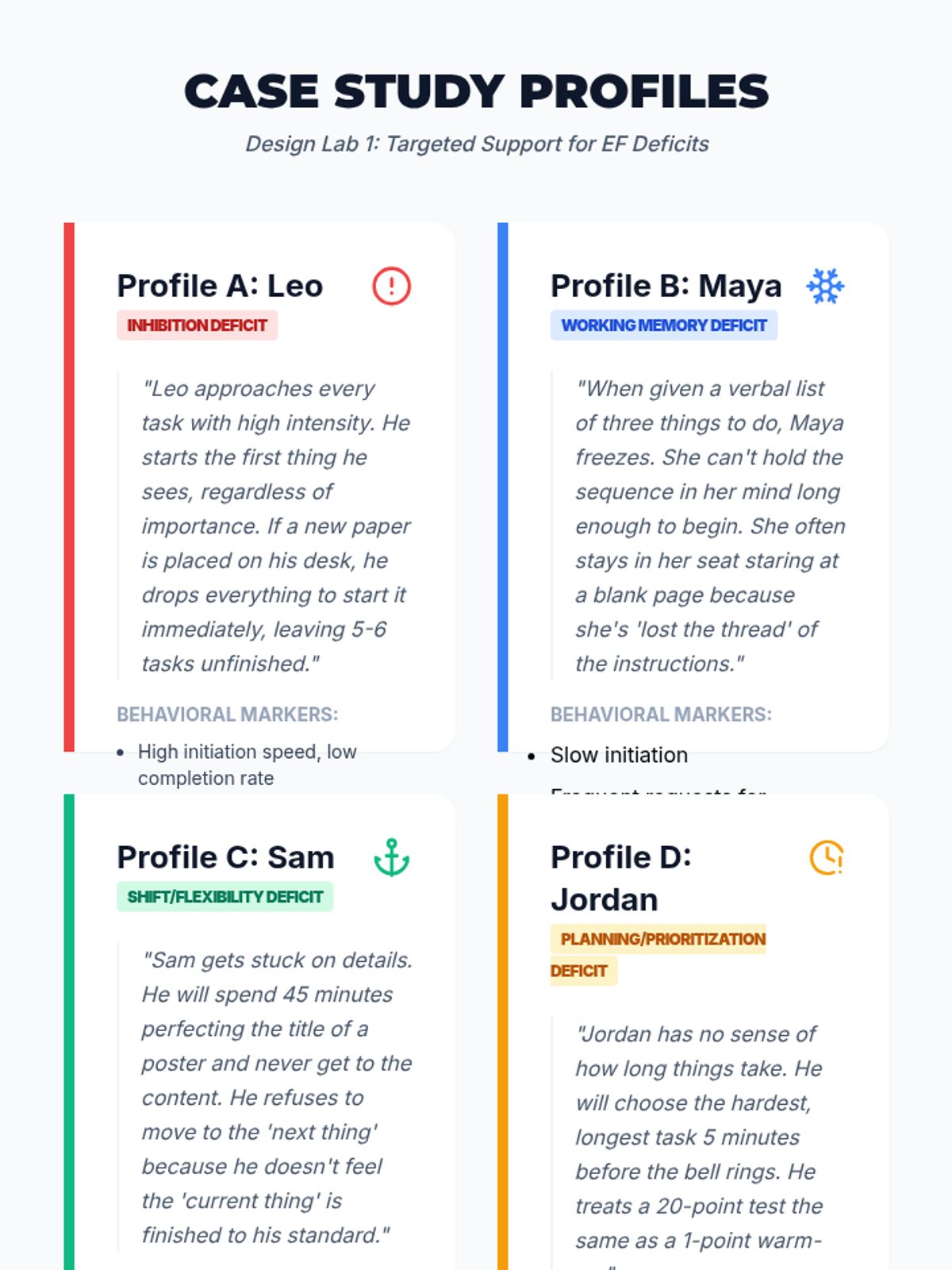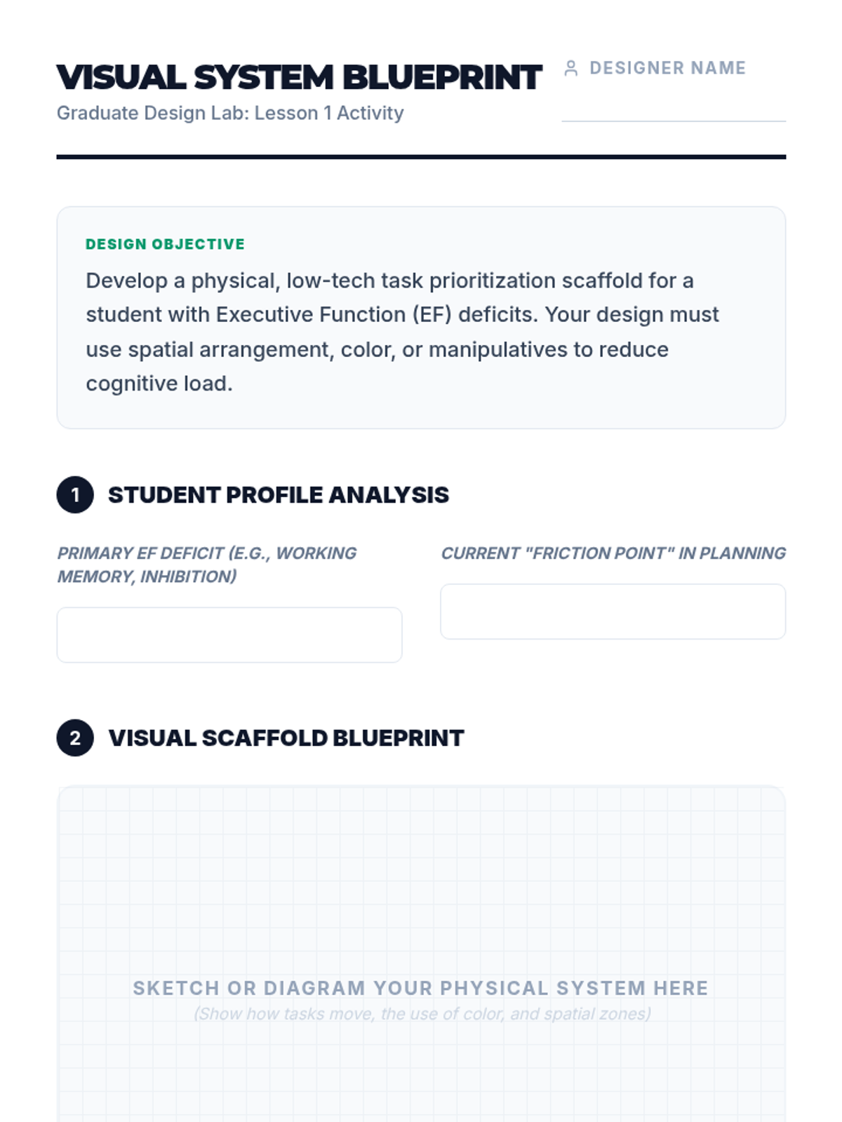 Students design low-tech visual supports to help students physically manipulate and rank tasks, focusing on visual structure and cognitive load reduction.