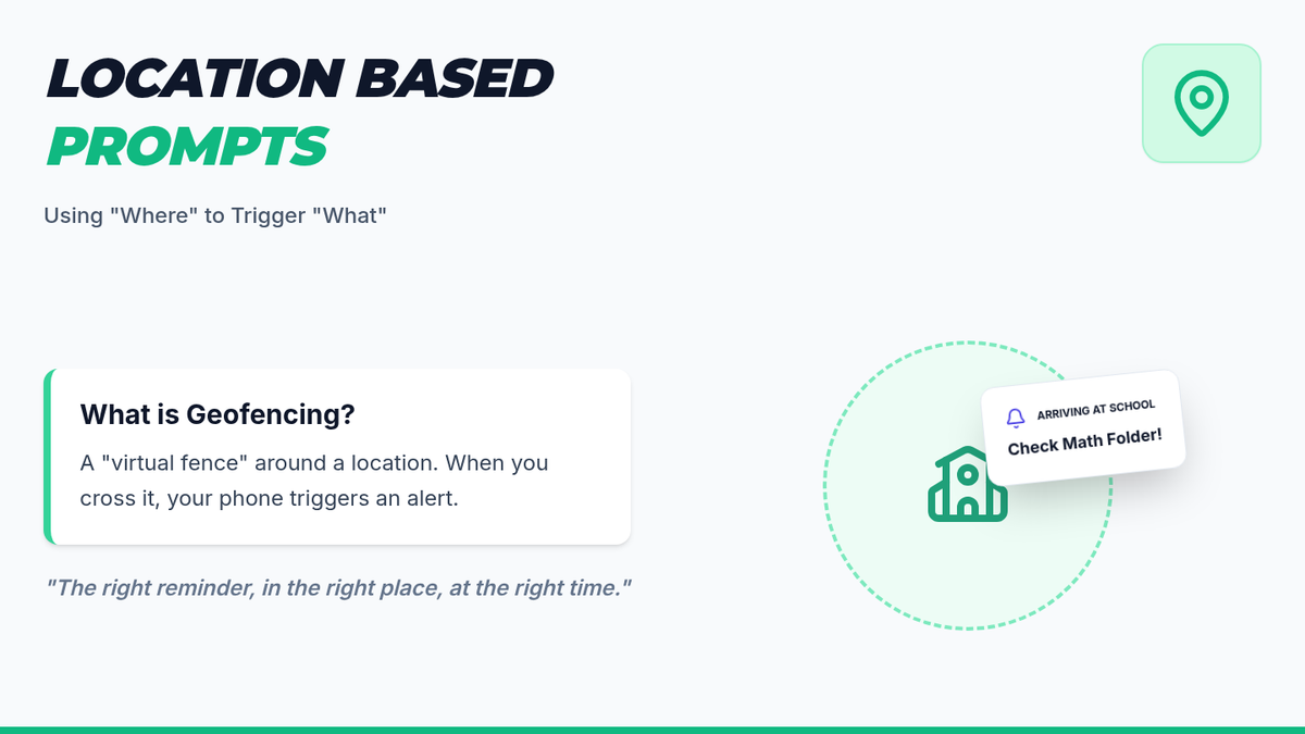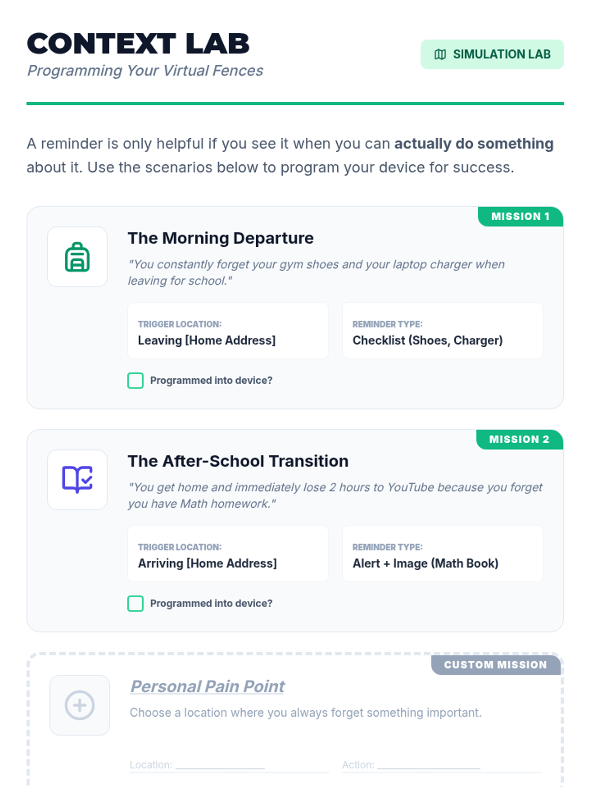 Students master advanced reminder features, including location-based alerts (geo-fencing) and visual checklists to reduce prompt dependency.