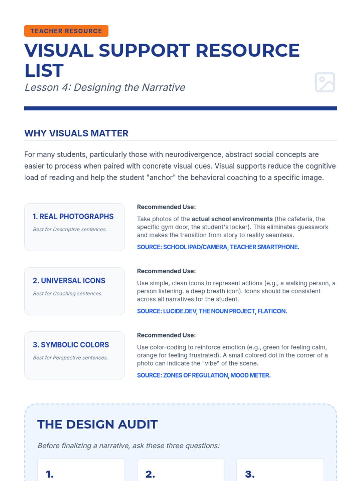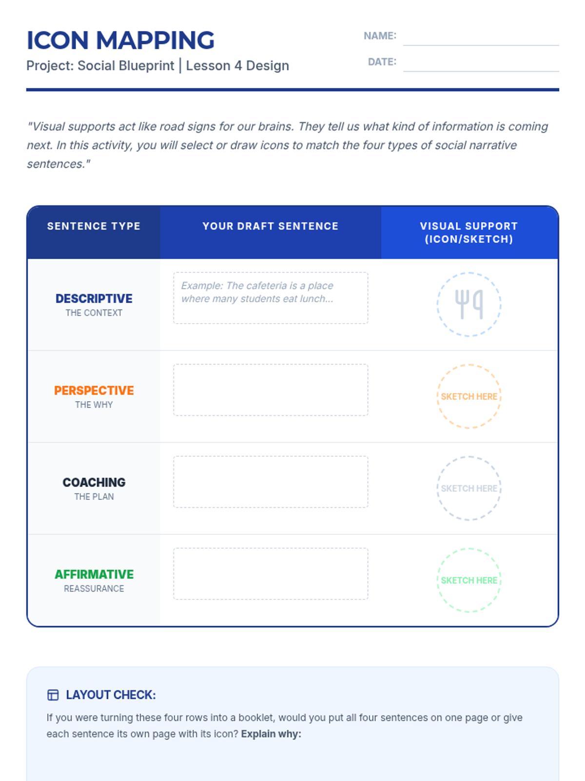 Students explore how layout and visual cues enhance the readability and recall of social narratives.