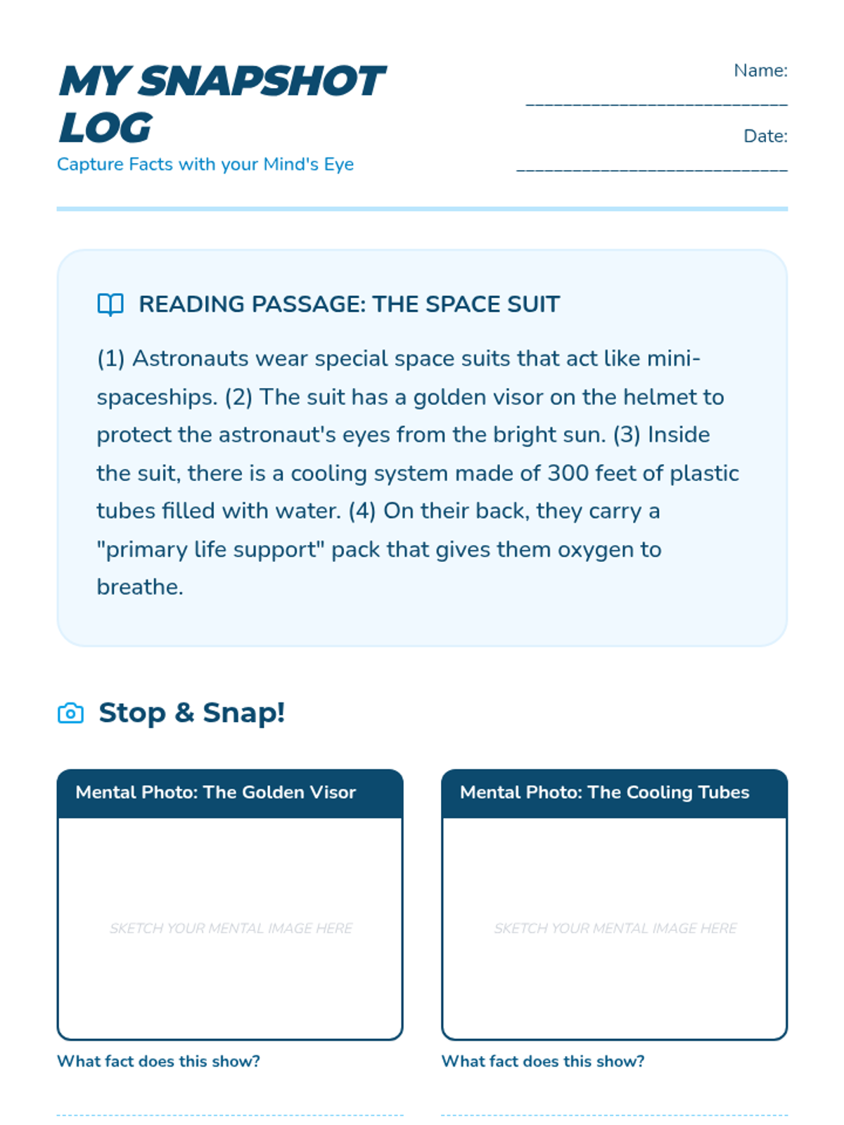 Students apply visualization strategies to informational text, using mental 'snapshots' to remember facts and details from a short passage.