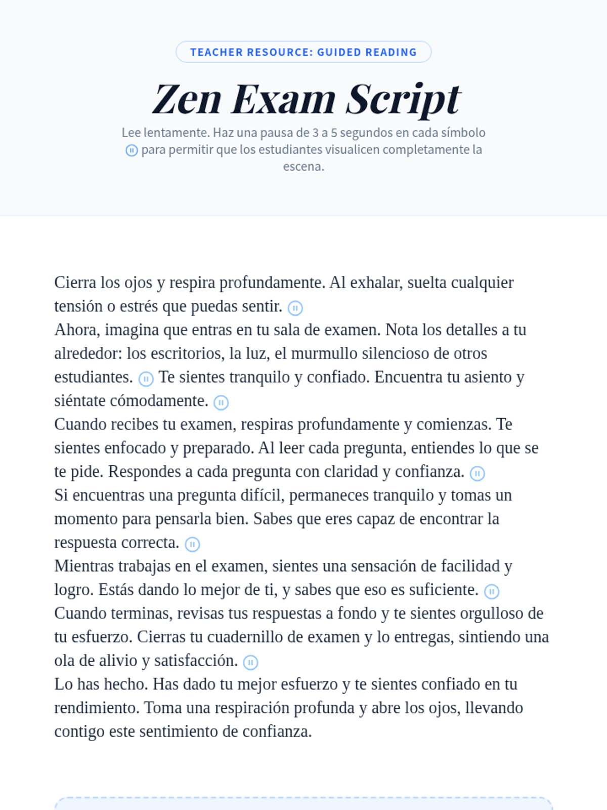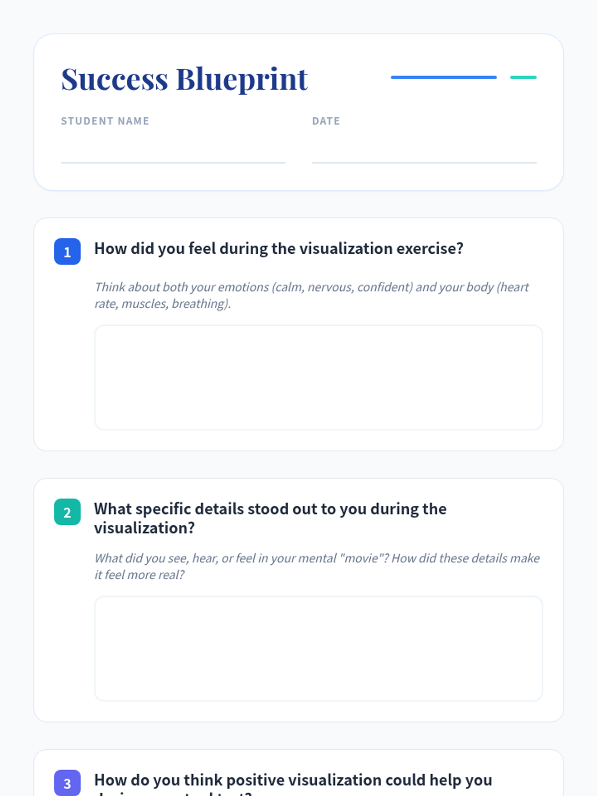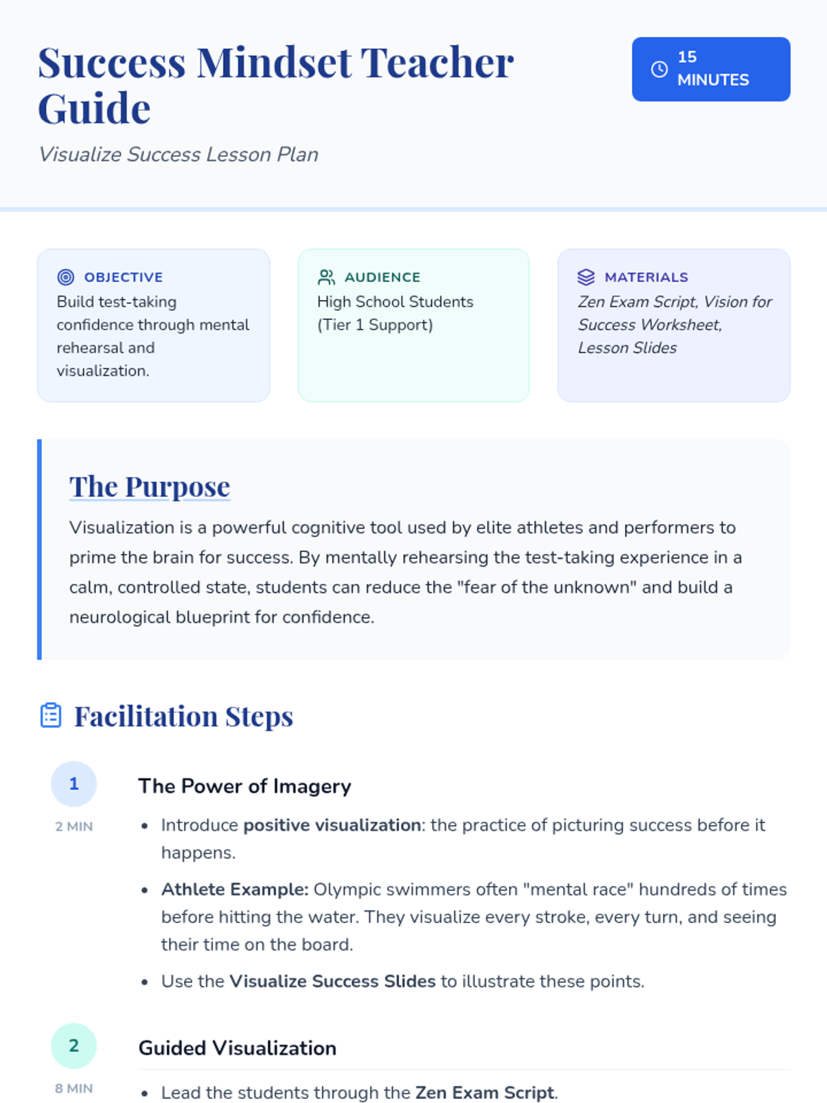 This lesson introduces high school students to the concept of positive visualization as a tool to build test-taking confidence. Students will engage in a guided visualization exercise and reflect on how this technique can reduce anxiety and enhance performance.