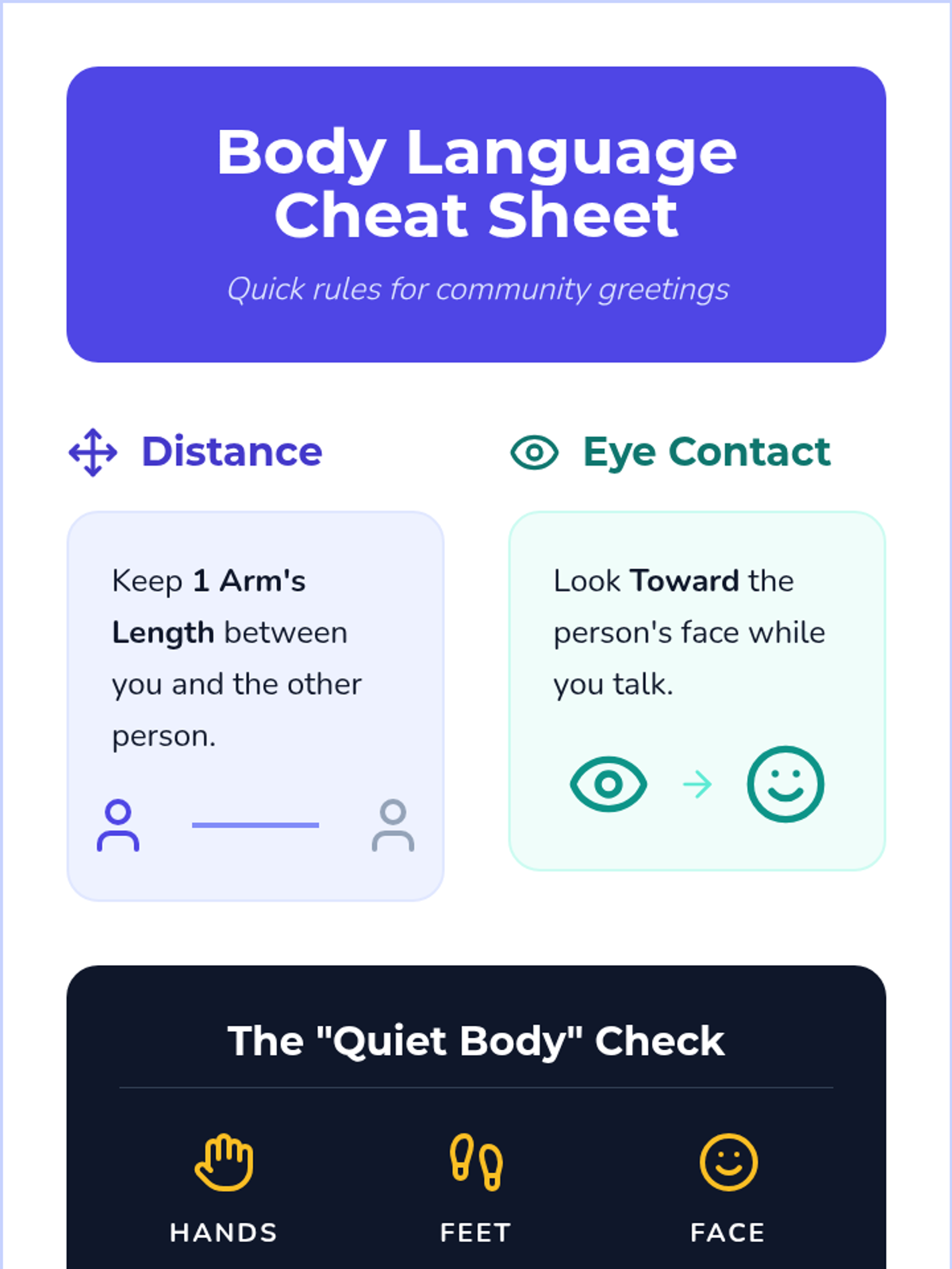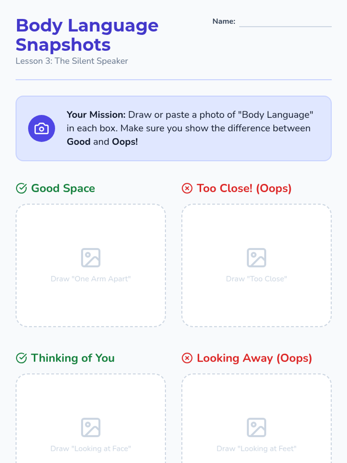 Students analyze and document appropriate body language, including personal space and eye contact, for different community settings using 'Do' and 'Don't' labels.