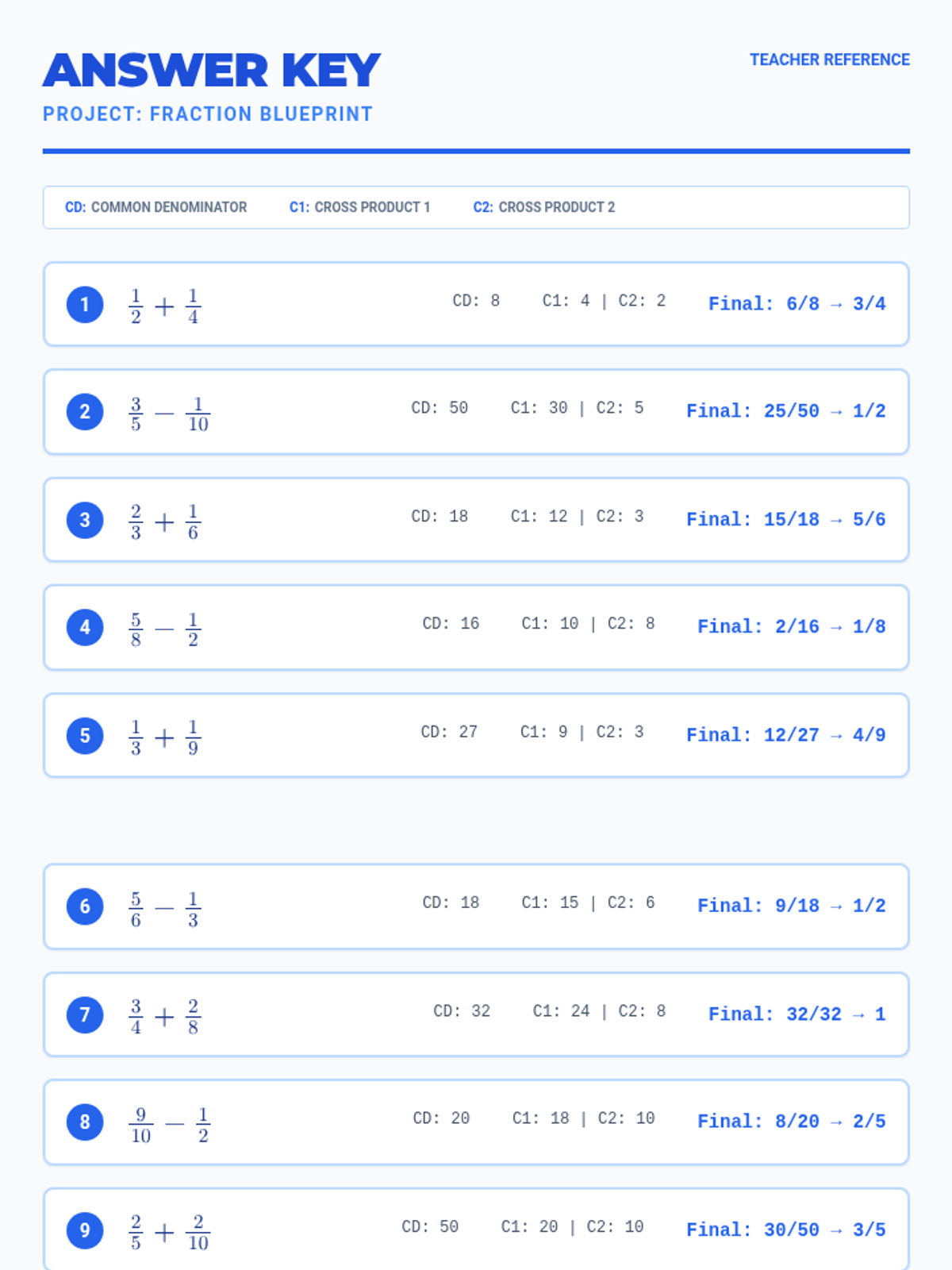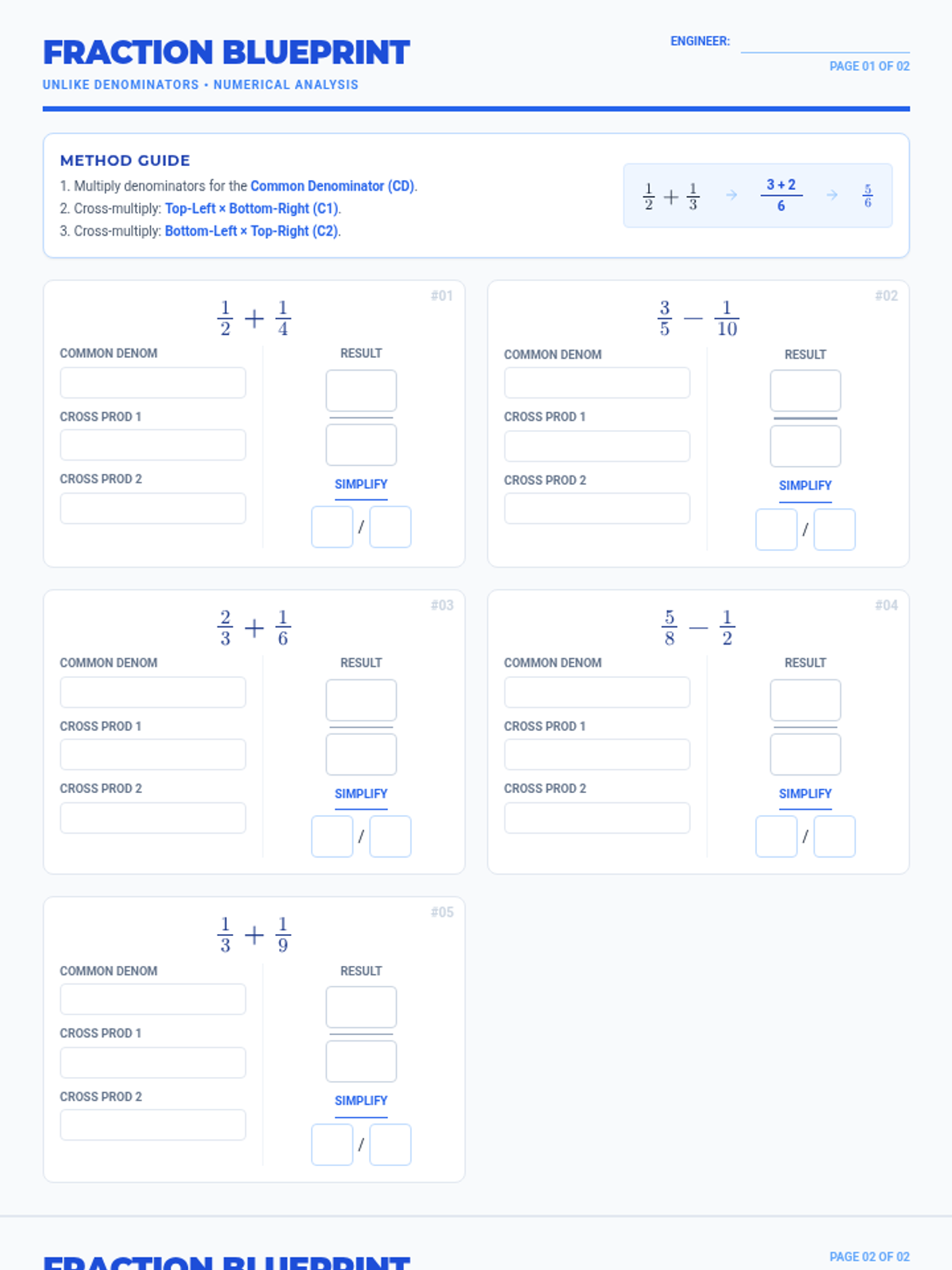 A lesson focused on mastering addition and subtraction of fractions with unlike denominators using the cross-multiplication (butterfly) method. Students use structured graphic organizers to visualize each step of the process.