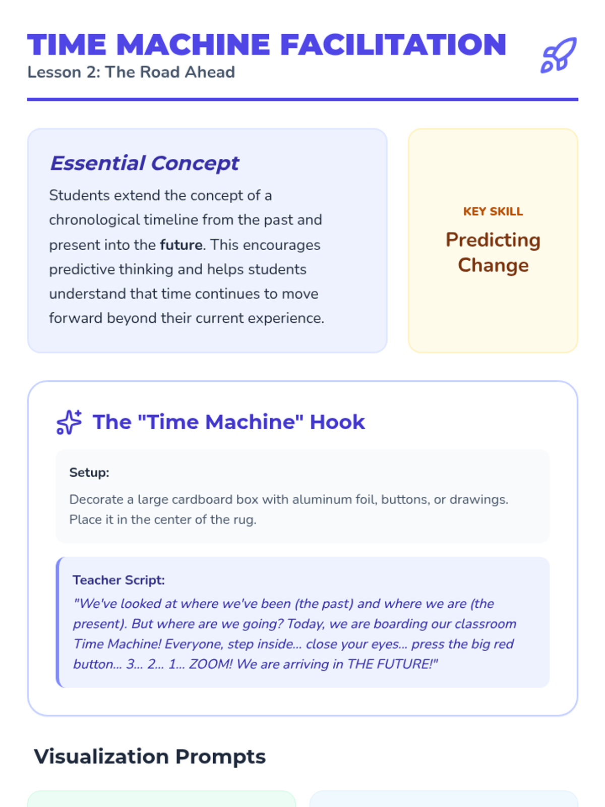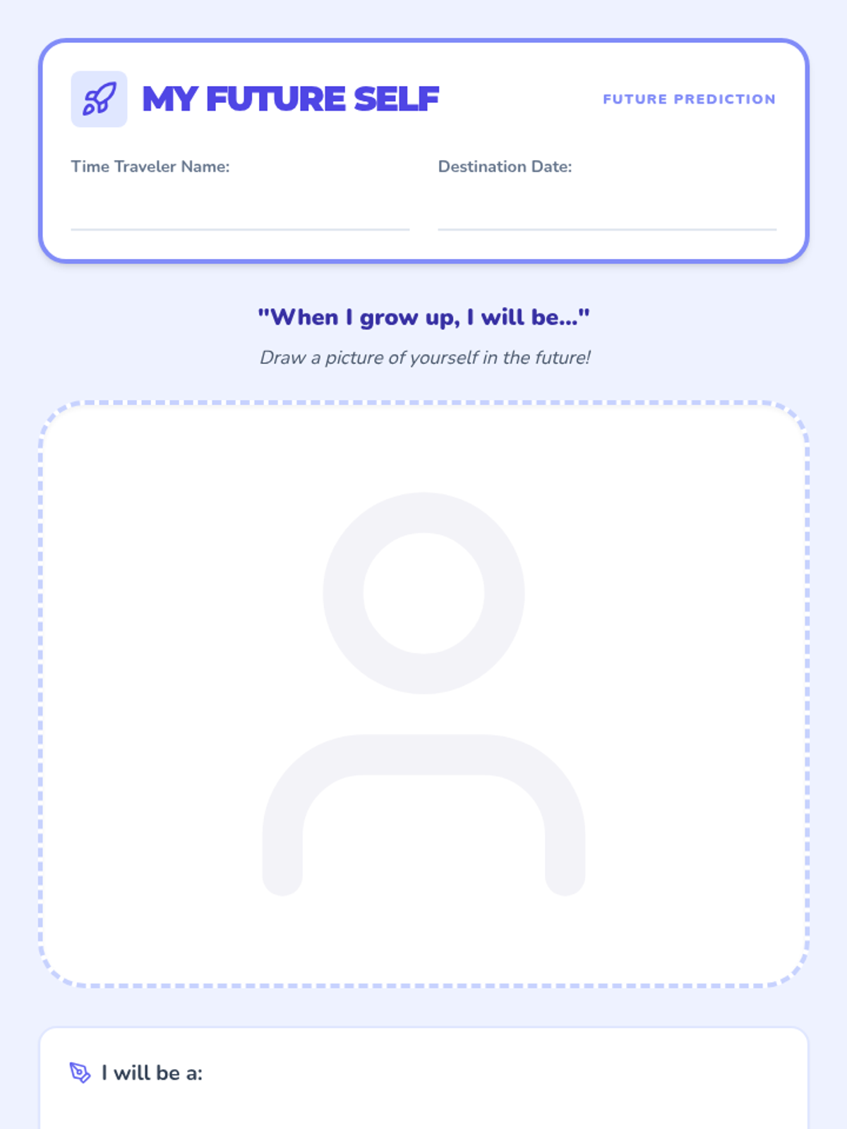 Students imagine what they will be like when they are older, drawing their future selves to extend the timeline forward.