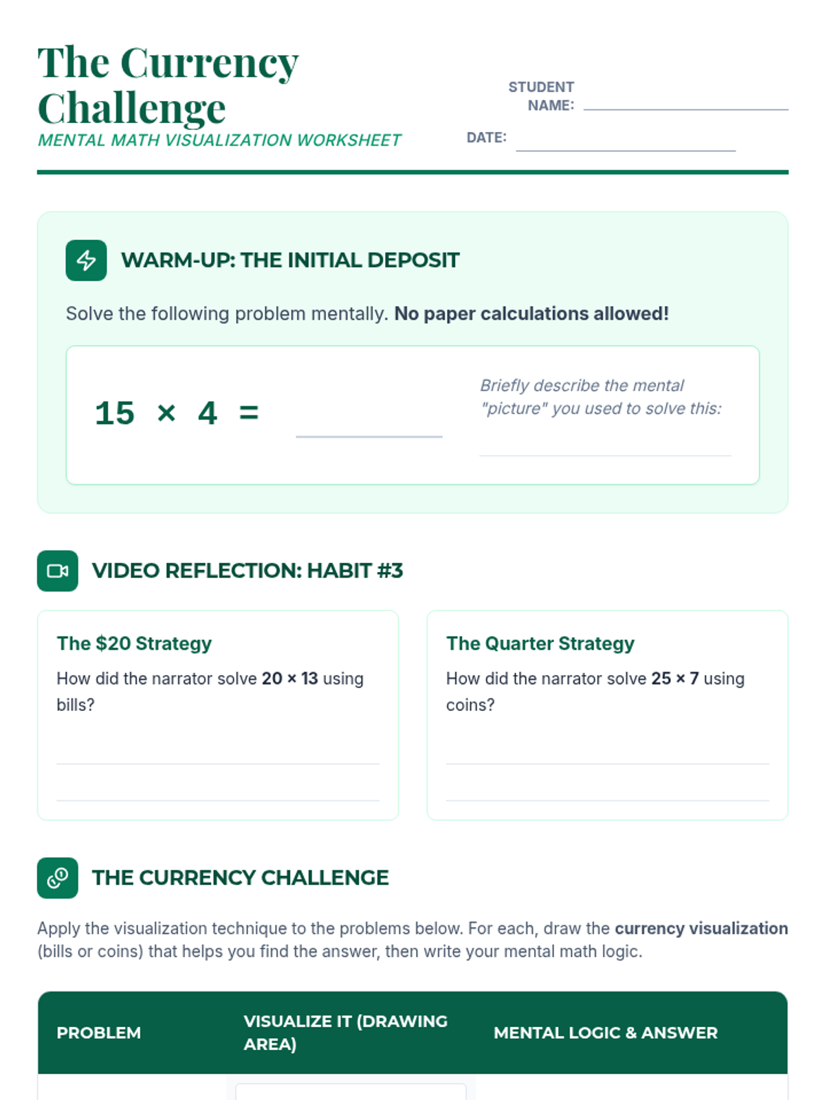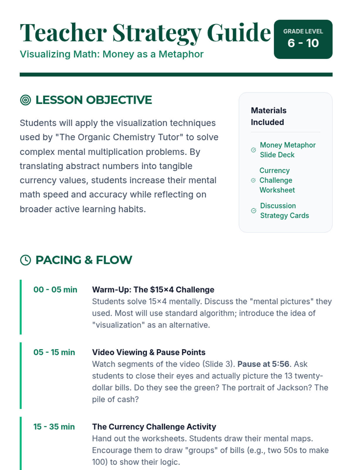 A math lesson focused on using currency (bills and coins) as a mental visualization tool for complex multiplication, based on the academic success strategies of 'The Organic Chemistry Tutor'. Students will practice translating abstract numbers into tangible money values to increase mental math speed and accuracy.