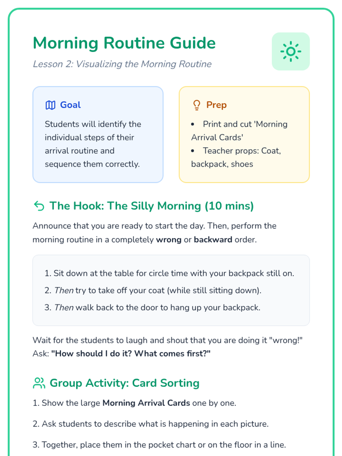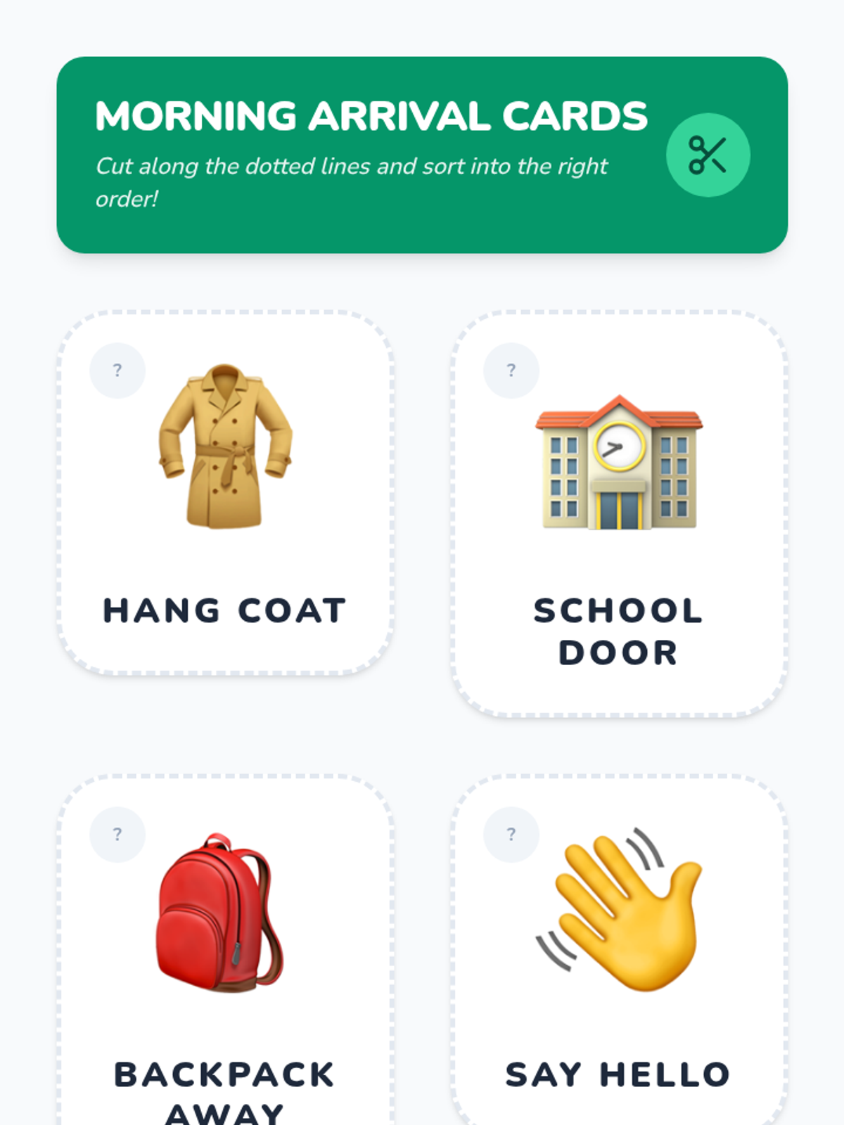 Focuses on deconstructing and ordering the morning arrival routine using large visual aids.