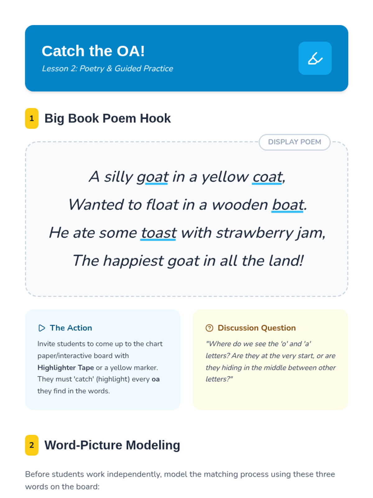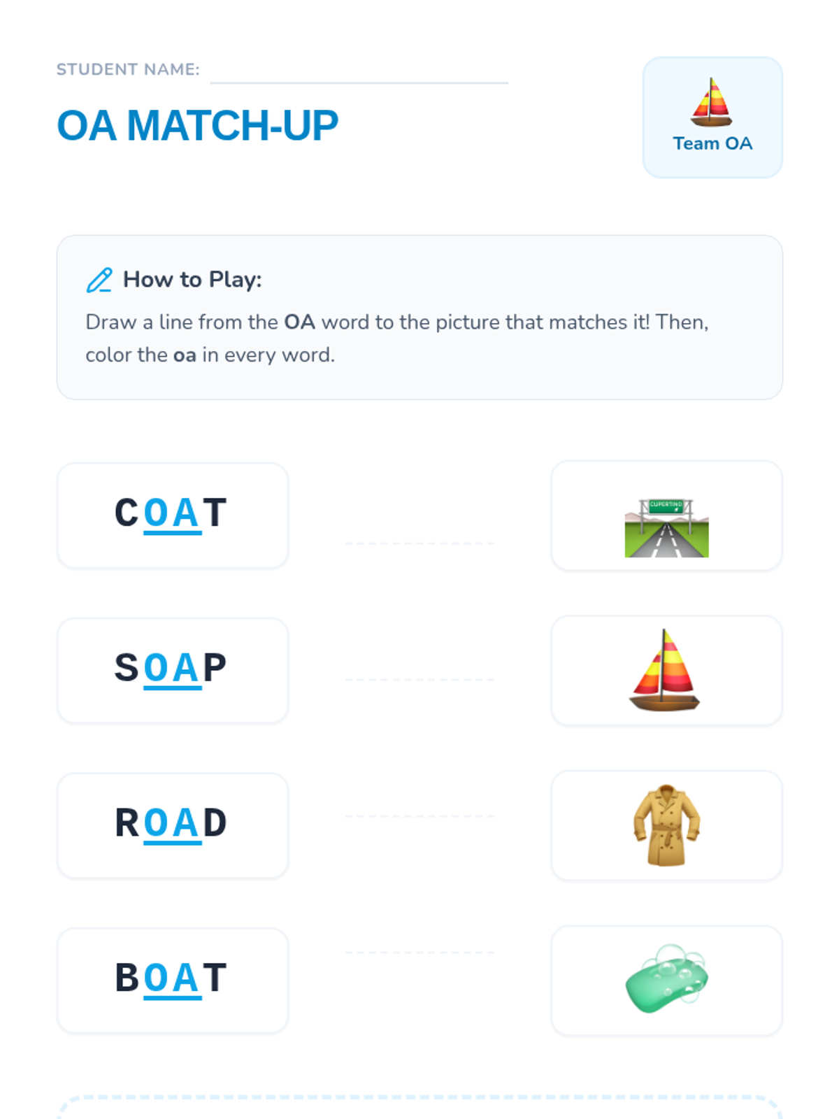 Focusing on the 'oa' vowel team, students identify the pattern in the middle of words and match words to pictures.