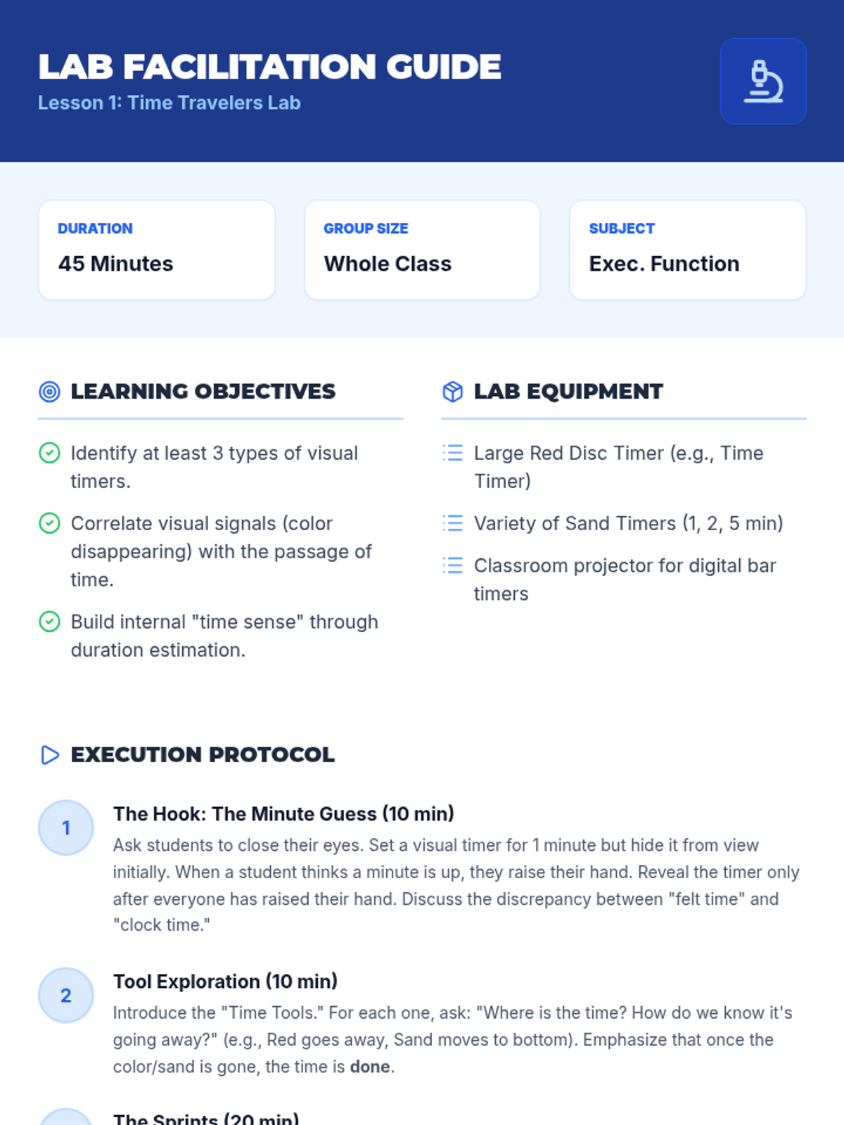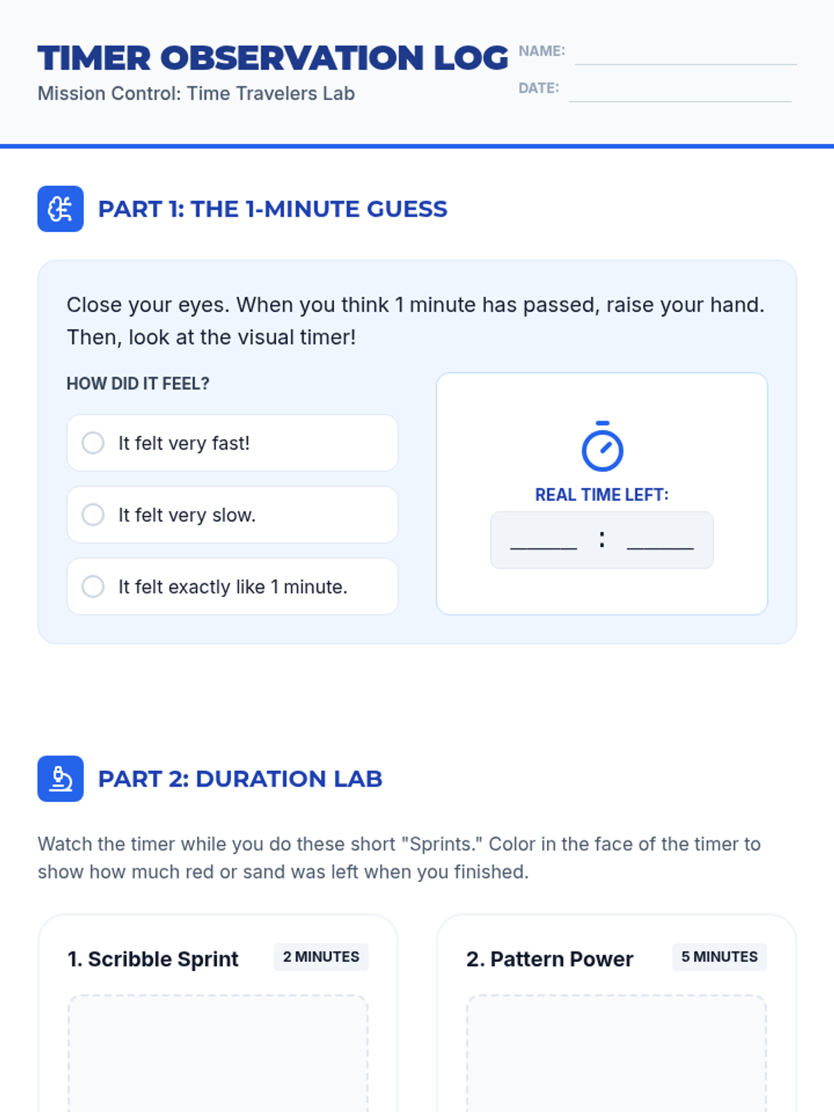 Students observe various visual timers to understand that time is a finite, shrinking resource. They engage in duration-matching activities to build a concrete sense of how minutes feel.