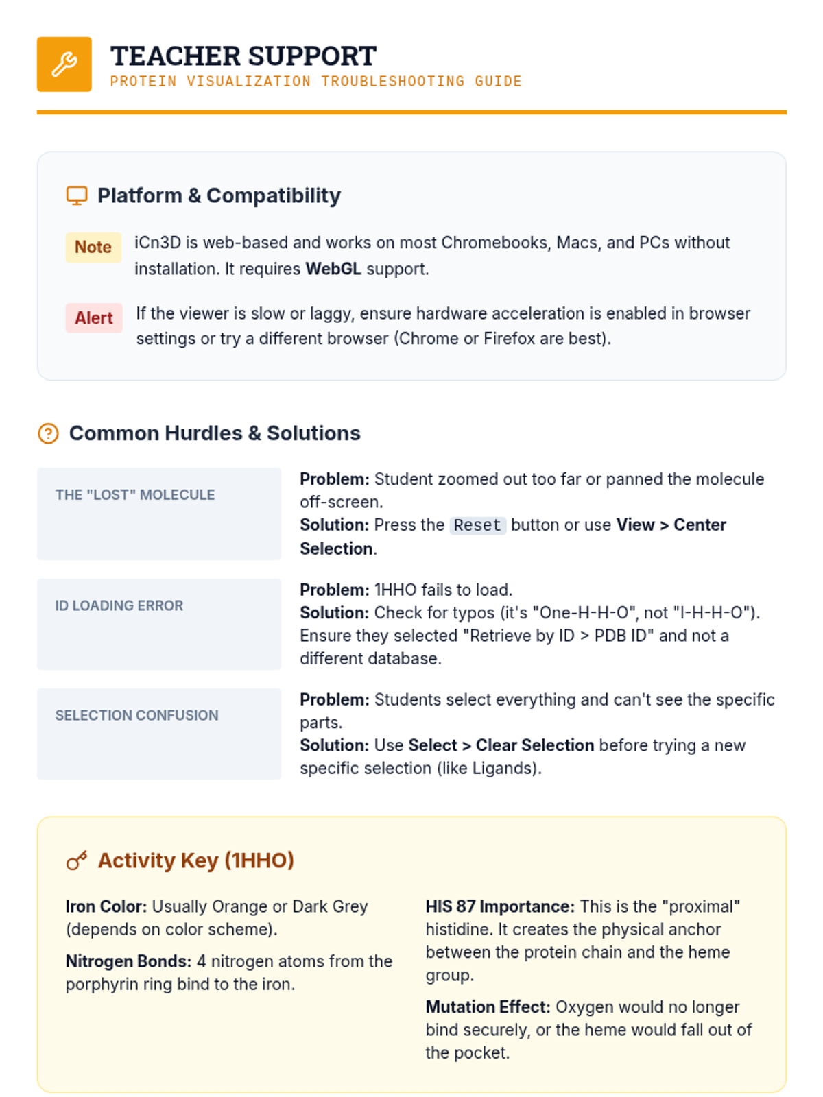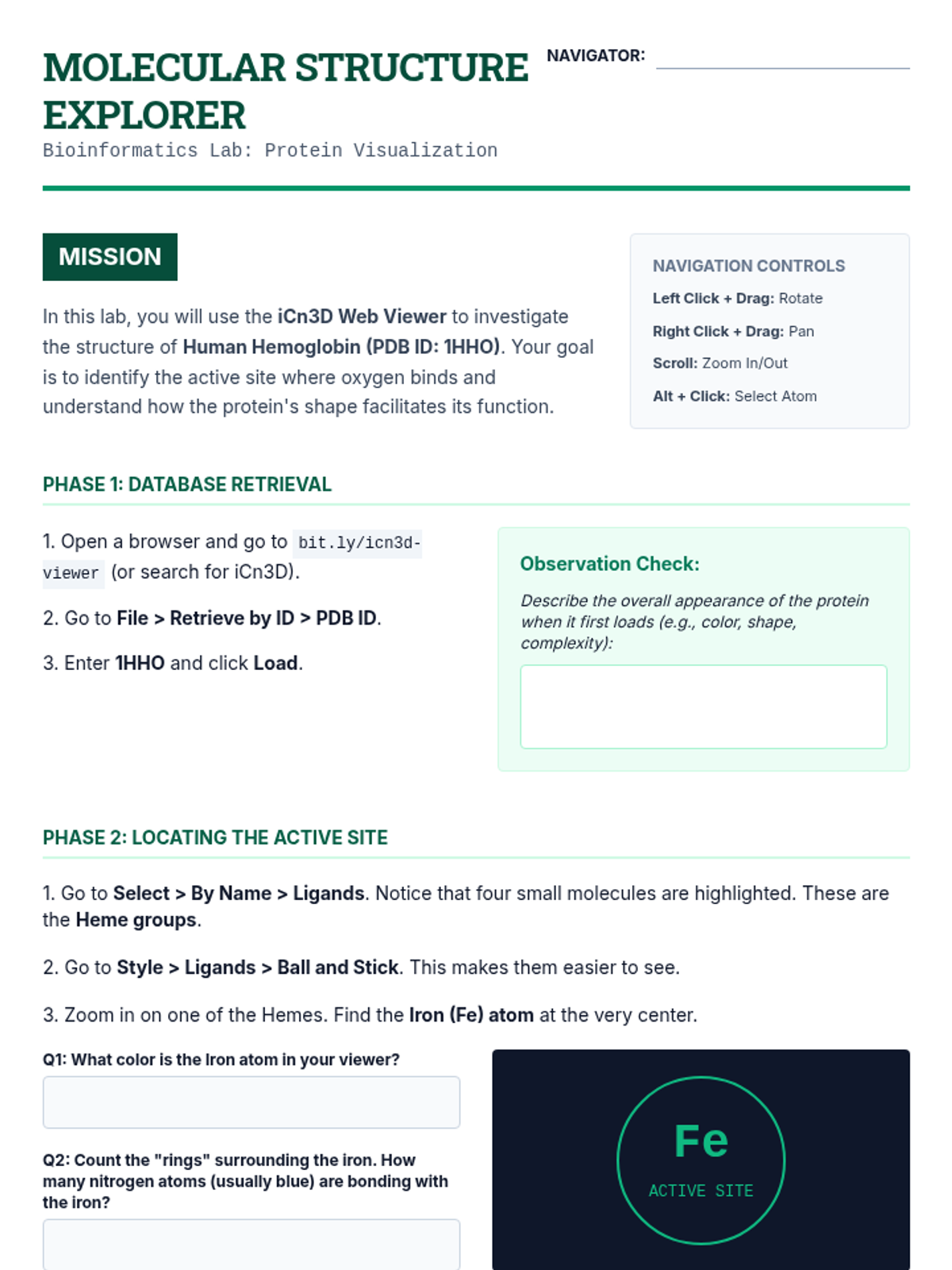 Using molecular visualization software, students manipulate 3D protein models to identify active sites and understand the relationship between structure and function.