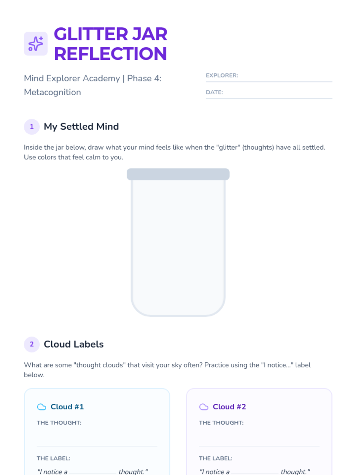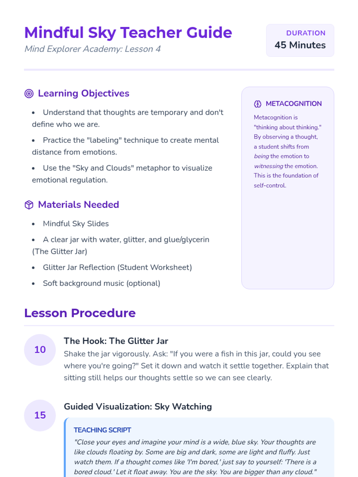 Students learn to observe thoughts and emotions as passing clouds, practicing metacognitive skills for emotional regulation using a glitter jar demonstration.