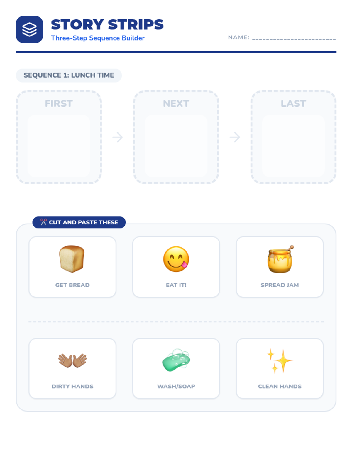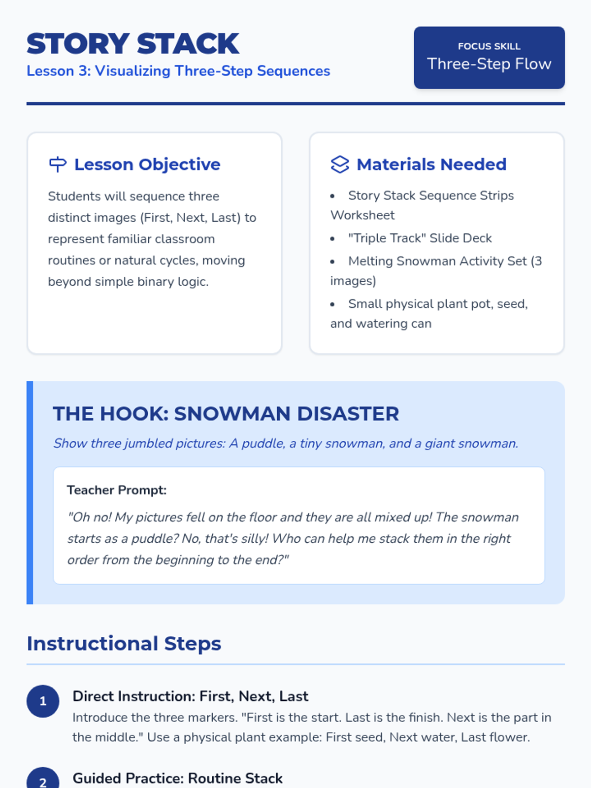 Expands sequencing skills to three-step routines using 'First, Next, Last' structures to support narrative thinking and routine management.