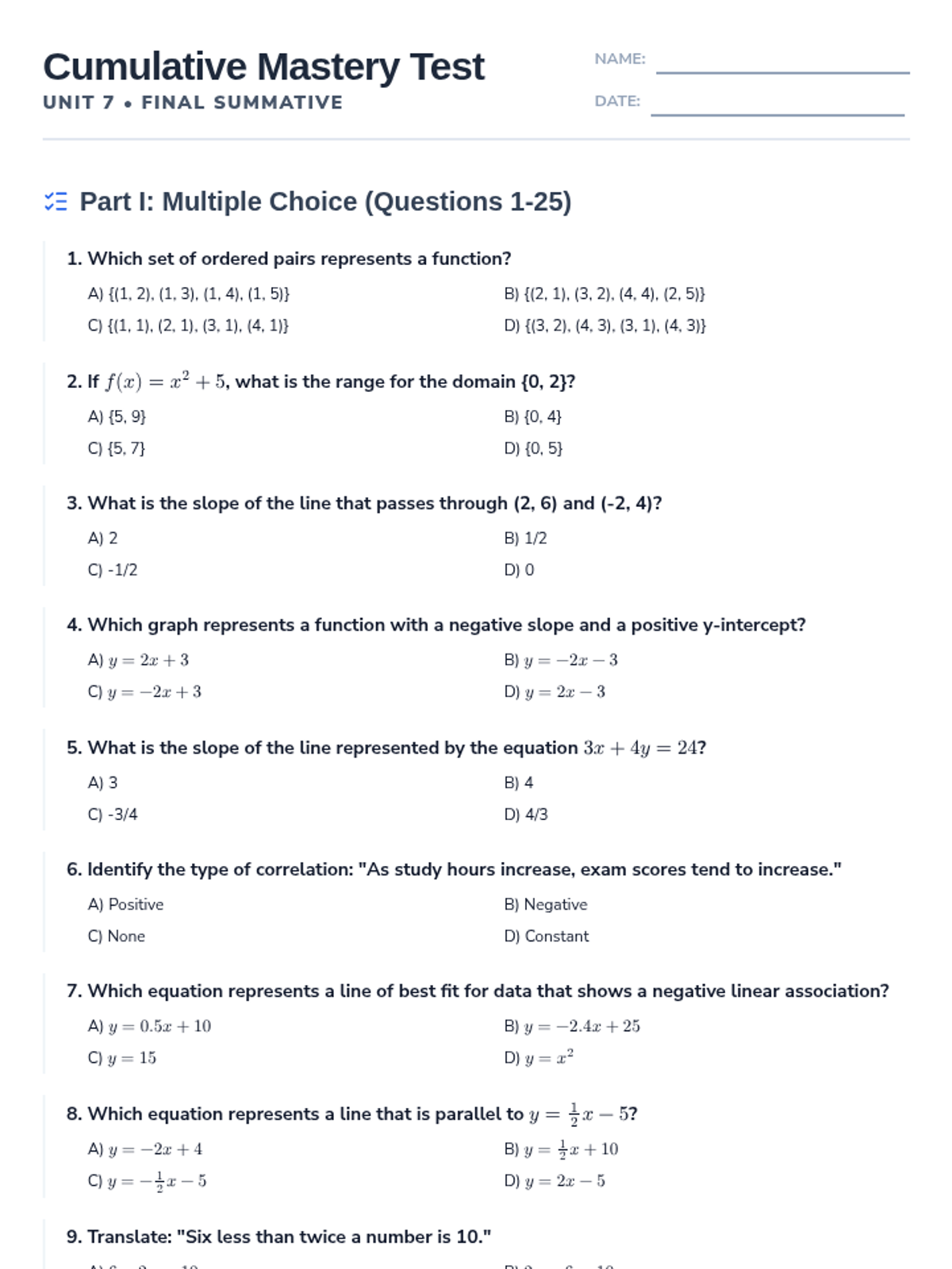 This lesson provides a comprehensive review and assessment of linear equations, covering function identification, standard form conversions, and the properties of parallel and perpendicular lines. Students will engage in guided practice, independent modeling, and summative evaluation to master linear relationships.