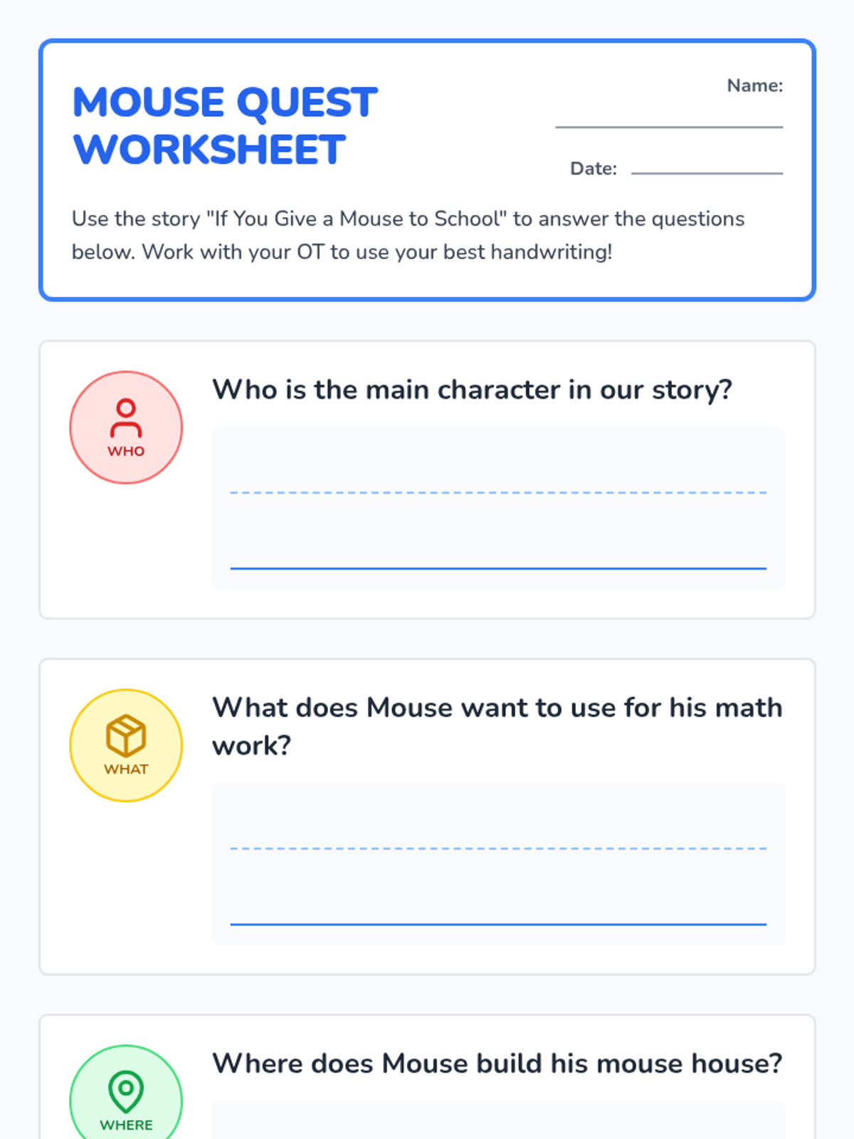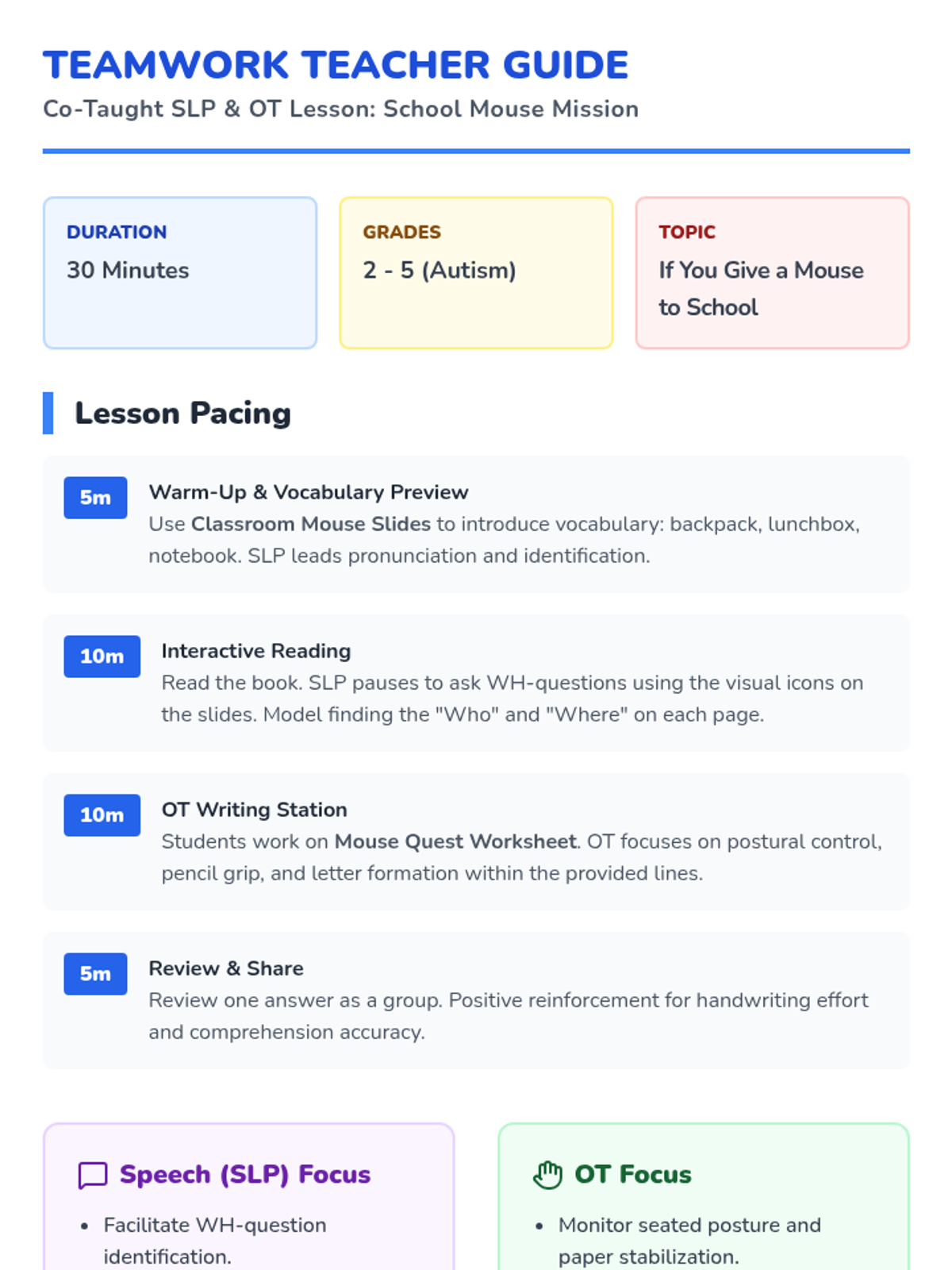 A 30-minute co-taught lesson (Speech/OT) centered on the book 'If You Give a Mouse to School', focusing on vocabulary and WH-question comprehension through visual supports and structured writing tasks.