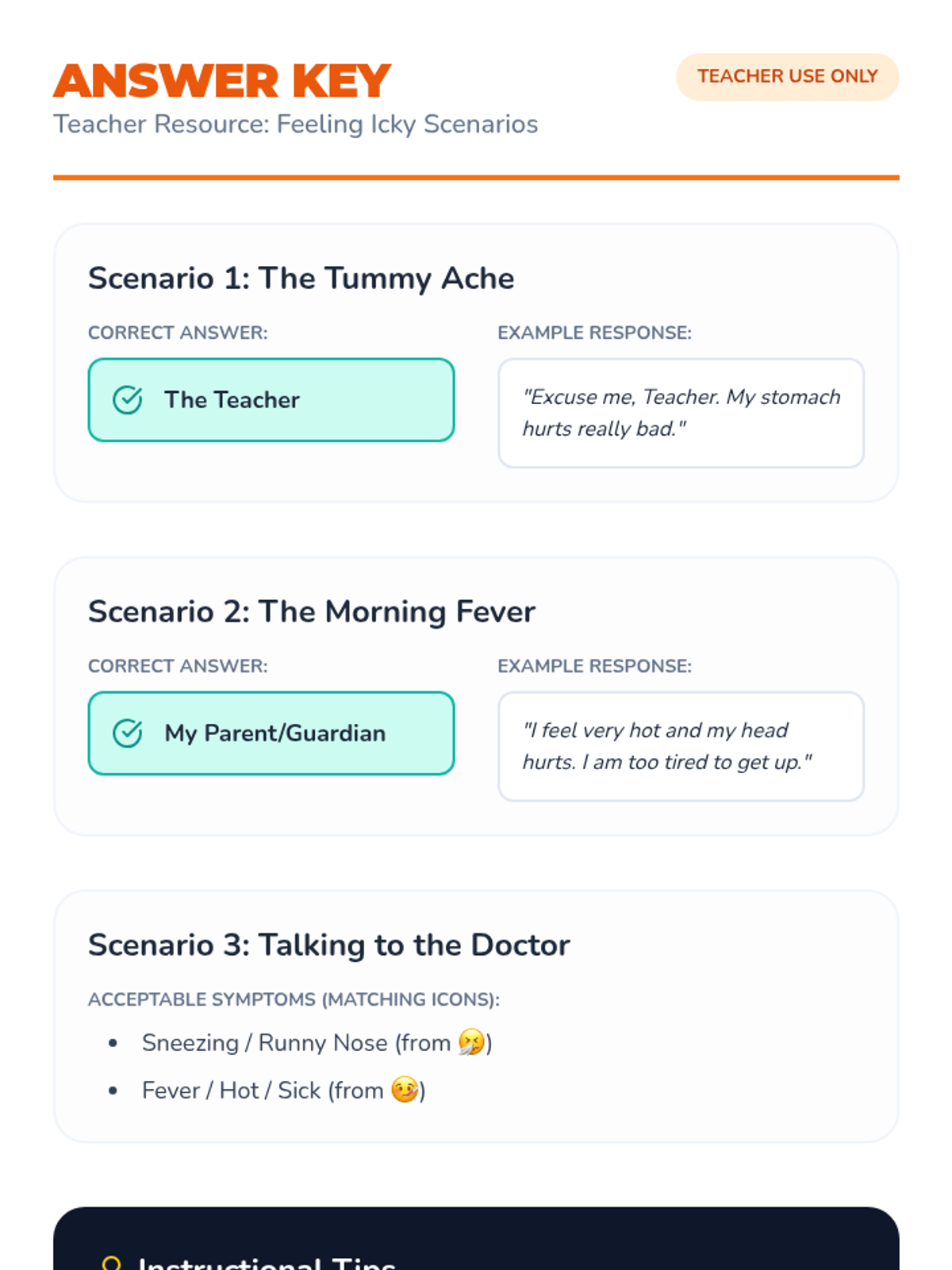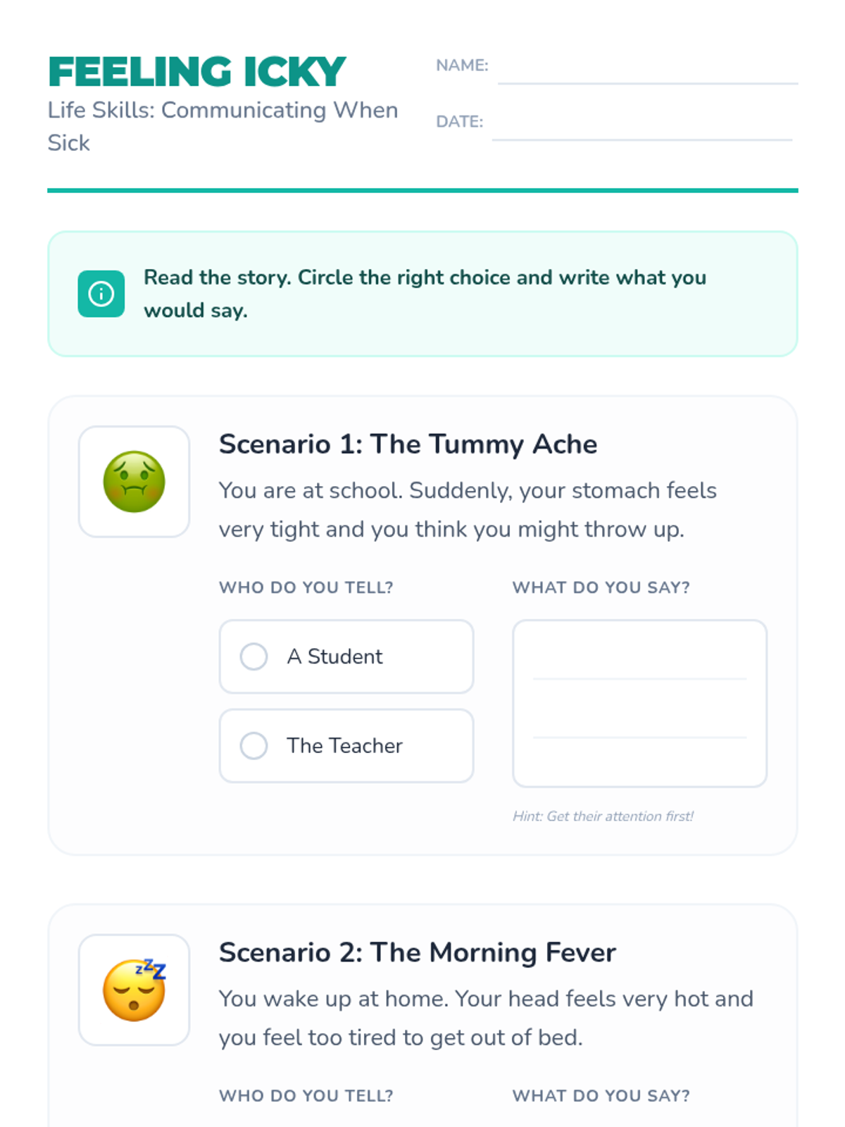 A life skills lesson designed for special education students to identify symptoms of illness and practice communicating how they feel to trusted adults. The lesson uses clear visuals and simple scenarios to build independence in healthcare communication.