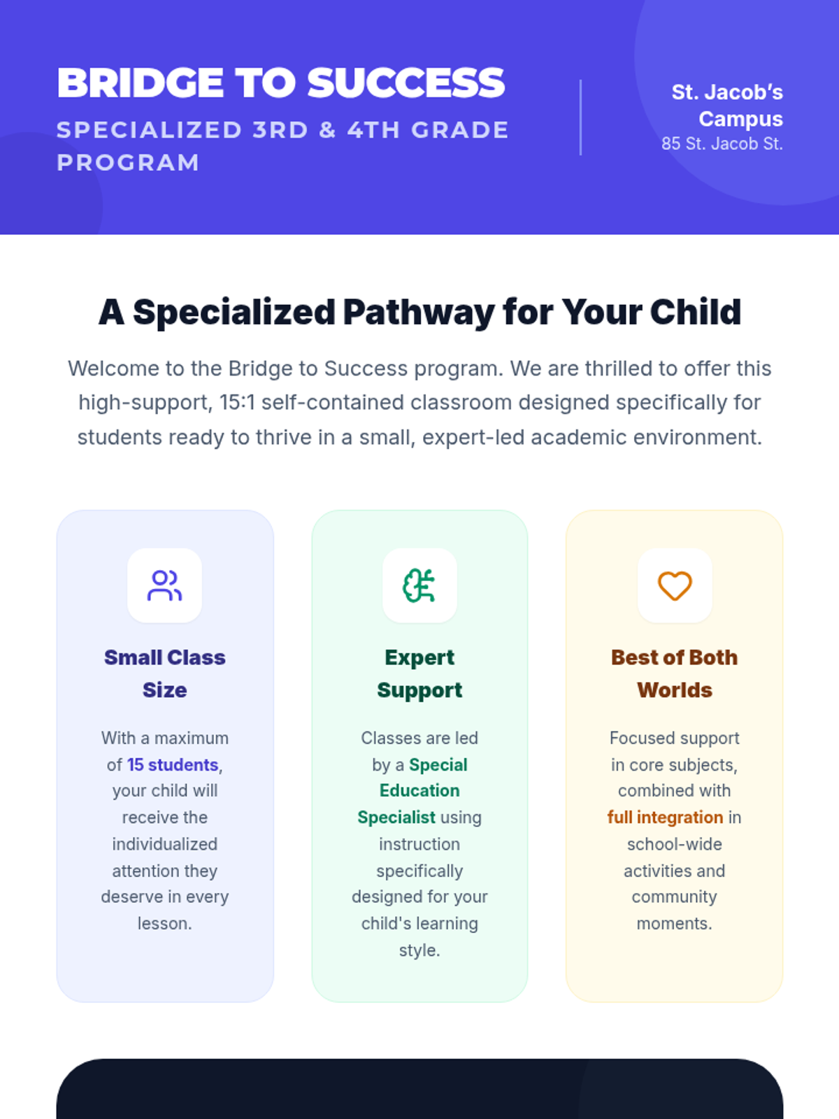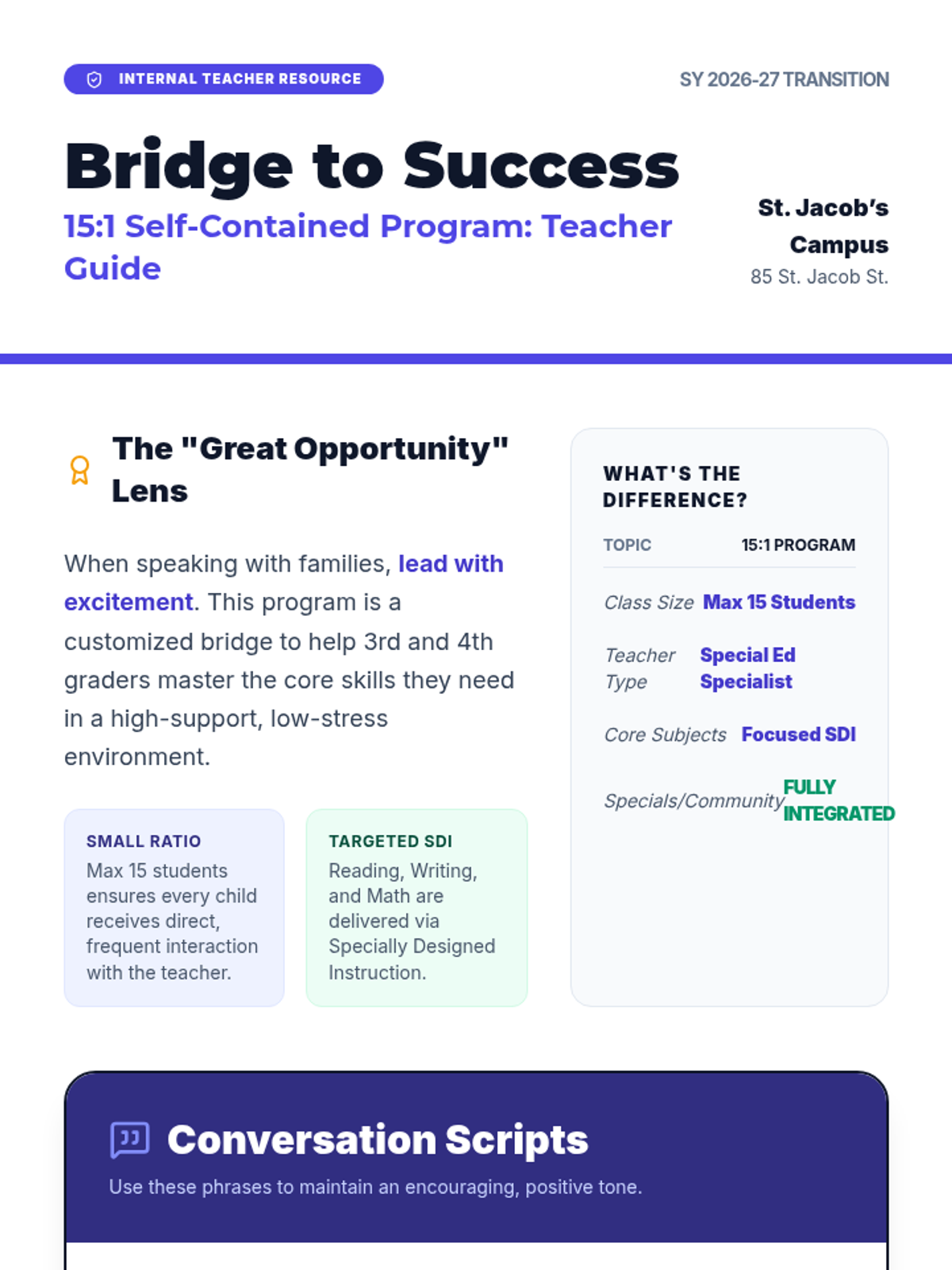 Resources for teachers to facilitate conversations with families regarding the transition to the new 15:1 self-contained classroom at the St. Jacob's campus.